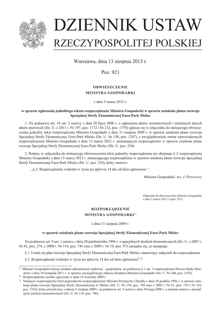 DZIENNIK USTAW RZECZYPOSPOLITEJ POLSKIEJ Warszawa, dnia 13 sierpnia 2013 r. Poz. 921 OBWIESZCZENIE MINISTRA GOSPODARKI z dnia 5 marca 2013 r. w sprawie ogłoszenia jednolitego tekstu rozporządzenia Ministra Gospodarki w sprawie ustalenia planu rozwoju Specjalnej Strefy Ekonomicznej Euro-Park Mielec 1. Na podstawie art. 16 ust. 3 ustawy z dnia 20 lipca 2000 r. o ogłaszaniu aktów normatywnych i niektórych innych aktów prawnych (Dz. U. z 2011 r. Nr 197, poz. 1172 i Nr 232, poz. 1378) ogłasza się w załączniku do niniejszego obwieszczenia jednolity tekst rozporządzenia Ministra Gospodarki z dnia 31 sierpnia 2009 r. w sprawie ustalenia planu rozwoju Specjalnej Strefy Ekonomicznej Euro-Park Mielec (Dz. U. Nr 158, poz. 1247), z uwzględnieniem zmian wprowadzonych rozporządzeniem Ministra Gospodarki z dnia 13 marca 2012 r. zmieniającym rozporządzenie w sprawie ustalenia planu rozwoju Specjalnej Strefy Ekonomicznej Euro-Park Mielec (Dz. U. poz. 324). 2. Podany w załączniku do niniejszego obwieszczenia tekst jednolity rozporządzenia nie obejmuje § 2 rozporządzenia Ministra Gospodarki z dnia 13 marca 2012 r. zmieniającego rozporządzenie w sprawie ustalenia planu rozwoju Specjalnej Strefy Ekonomicznej Euro-Park Mielec (Dz. U. poz. 324), który stanowi: „§ 2. Rozporządzenie wchodzi w życie po upływie 14 dni od dnia ogłoszenia.”. Minister Gospodarki: wz. J. Pietrewicz Załącznik do obwieszczenia Ministra Gospodarki z dnia 5 marca 2013 r. (poz. 921) ROZPORZĄDZENIE MINISTRA GOSPODARKI 1) z dnia 31 sierpnia 2009 r. w sprawie ustalenia planu rozwoju Specjalnej Strefy Ekonomicznej Euro-Park Mielec Na podstawie art. 9 ust. 1 ustawy z dnia 20 października 1994 r. o specjalnych strefach ekonomicznych (Dz. U. z 2007 r. Nr 42, poz. 274, z 2008 r. Nr 118, poz. 746 oraz z 2009 r. Nr 18, poz. 97) zarządza się, co następuje: § 1. Ustala się plan rozwoju Specjalnej Strefy Ekonomicznej Euro-Park Mielec, stanowiący załącznik do rozporządzenia. § 2. Rozporządzenie wchodzi w życie po upływie 14 dni od dnia ogłoszenia2).3) Minister Gospodarki kieruje działem administracji rządowej – gospodarka, na podstawie § 1 ust. 2 rozporządzenia Prezesa Rady Ministrów z dnia 18 listopada 2011 r. w sprawie szczegółowego zakresu działania Ministra Gospodarki (Dz. U. Nr 248, poz. 1478). 2) Rozporządzenie zostało ogłoszone w dniu 24 września 2009 r. 3) Niniejsze rozporządzenie było poprzedzone rozporządzeniem Ministra Przemysłu i Handlu z dnia 10 grudnia 1996 r. w sprawie ustalenia planu rozwoju Specjalnej Strefy Ekonomicznej w Mielcu (Dz. U. Nr 154, poz. 749 oraz z 2005 r. Nr 81, poz. 710 i Nr 182, poz. 1532), które utraciło moc z dniem 5 sierpnia 2009 r. na podstawie art. 5 ustawy z dnia 30 maja 2008 r. o zmianie ustawy o specjalnych strefach ekonomicznych (Dz. U. Nr 118, poz. 746). 1) Dziennik Ustaw –2– Poz. 921 Załącznik do rozporządzenia Ministra Gospodarki z dnia 31 sierpnia 2009 r. PLAN ROZWOJU SPECJALNEJ STREFY EKONOMICZNEJ EURO-PARK MIELEC 1. Wstęp Plan rozwoju strefy określa w szczególności cele ustanowienia strefy, działania służące osiągnięciu tych celów oraz obowiązki zarządzającego dotyczące działań zmierzających do osiągnięcia celów ustanowienia strefy i terminy wykonania tych obowiązków. 1.1. Wprowadzenie Specjalna Strefa Ekonomiczna Euro-Park Mielec (MSSE) została utworzona rozporządzeniem Rady Ministrów z dnia 5 września 1995 r. w sprawie ustanowienia specjalnej strefy ekonomicznej w Mielcu (Dz. U. Nr 107, poz. 526, z późn. zm.) wydanym na podstawie art. 4 ust. 1 ustawy z dnia 20 października 1994 r. o specjalnych strefach ekonomicznych (Dz. U. z 2007 r. Nr 42, poz. 274, z późn. zm.), a jej granice określają kolejne rozporządzenia wydawane przez Radę Ministrów w oparciu o upoważnienie zawarte w art. 4 tej ustawy. Zarządzającym strefą jest Agencja Rozwoju Przemysłu S.A. (ARP S.A.) w Warszawie. Pierwotnie strefą objęto 574,8580 ha terenów położonych w Mielcu. Utworzenie specjalnej strefy ekonomicznej w Mielcu miało wspomóc region, który szczególnie dotkliwie doświadczył skutków transformacji gospodarczej kraju. Plan rozwoju strefy określony w rozporządzeniu Ministra Przemysłu i Handlu z dnia 10 grudnia 1996 r. w sprawie ustalenia planu rozwoju Specjalnej Strefy Ekonomicznej w Mielcu (Dz. U. Nr 154, poz. 749, z późn. zm.) definiował jej cele strategiczne jako utworzenie docelowo 7000 nowych miejsc pracy oraz zagospodarowanie majątku przemysłowego i infrastruktury pozostałych po restrukturyzacji Wytwórni Sprzętu Komunikacyjnego „PZL-Mielec”. W mieleckiej strefie, którą powołano na 20 lat, już w siódmym roku działalności osiągnięto zakładane cele, mimo to kontynuowano działania na rzecz rozwoju strefy z uwagi na dostępność zasobów kadrowych i utrzymującą się wysoką stopę bezrobocia w regionie. Od 2001 r. zwartą do tej pory strefę rozszerzano o nowe lokalizacje. Na koniec 2008 r. obszar strefy wyniósł 925,6674 ha i obejmował tereny w miastach: Dębica, Gorlice, Jarosław, Leżajsk, Lubaczów, Lublin, Mielec, Ropczyce, Sanok, Zagórz oraz gminach: Dębica, Głogów Małopolski, Jarosław, Laszki, Leżajsk, Ostrów, Trzebownisko. 1.2. Podstawowe dane o strefie na dzień 31 grudnia 2008 r. Spośród 925,6674 ha objętych granicami MSSE było zagospodarowanych 718,0429 ha, co stanowi 77,57% ogólnego obszaru strefy. Nakłady inwestycyjne poniesione przez zarządzającego na rozbudowę i modernizację infrastruktury technicznej wyniosły 102,9 mln zł. Wydano 153 zezwolenia na prowadzenie działalności gospodarczej na terenie strefy. Nakłady inwestycyjne poniesione przez inwestorów posiadających zezwolenia wyniosły 3781,9 mln zł. Przedsiębiorcy działający w strefie utworzyli 12 321 nowych miejsc pracy. 1.3.4) Misja MSSE Misją MSSE jest wspieranie realizacji celów określonych w strategiach rozwoju województw południowo-wschodniej Polski oraz województwa 