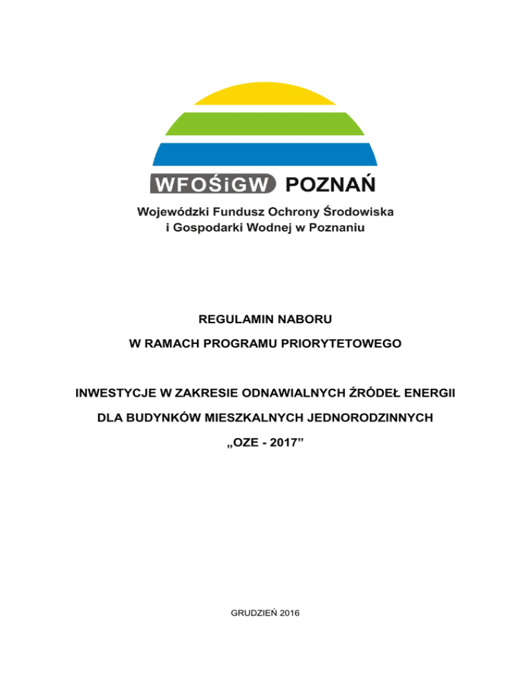 REGULAMIN NABORU W RAMACH PROGRAMU PRIORYTETOWEGO INWESTYCJE W ZAKRESIE ODNAWIALNYCH ŹRÓDEŁ ENERGII DLA BUDYNKÓW MIESZKALNYCH JEDNORODZINNYCH „OZE - 2017” GRUDZIEŃ 2016 Regulamin naboru w ramach Programu Priorytetowego Inwestycje w zakresie odnawialnych źródeł energii dla budynków mieszkalnych jednorodzinnych „OZE – 2017” I. Podstawy prawne §1 Niniejszy Regulamin oparty jest w szczególności na niżej wskazanych dokumentach i aktach prawnych: 1. „Zasady udzielania i umarzania pożyczek oraz tryb i zasady udzielania i rozliczania dotacji ze środków WFOŚiGW w Poznaniu na rok 2017”. 2. „Kryteria wyboru przedsięwzięć finansowanych ze środków WFOŚiGW w Poznaniu”. 3. „Lista przedsięwzięć priorytetowych Wojewódzkiego Funduszu Ochrony Środowiska i Gospodarki Wodnej w Poznaniu na rok 2017”. 4. Ustawa z dnia 27 kwietnia 2001 r. Prawo ochrony środowiska (t.j. Dz. U. z 2016 r., poz. 672 ze zm.). 5. Ustawa z dnia 20 lutego 2015 r. o odnawialnych źródłach energii (t.j. Dz. U. z 2015 r., poz. 478 ze zm.). 6. Ustawa z dnia 30 kwietnia 2004 r. o postępowaniu w sprawach dotyczących pomocy publicznej (t.j. Dz. U. z 2016 r. poz. 1808). II. Definicje i postanowienia ogólne §2 1. Wojewódzki Fundusz Ochrony Środowiska i Gospodarki Wodnej w Poznaniu, działając na podstawie ustawy z dnia 27 kwietnia 2001 roku Prawo ochrony środowiska, a także zgodnie z „Zasadami udzielania i umarzania pożyczek oraz trybem i zasadami udzielania i rozliczania dotacji ze środków WFOŚiGW w Poznaniu na rok 2017” realizuje Program Priorytetowy Inwestycje w zakresie odnawialnych źródeł energii dla budynków mieszkalnych jednorodzinnych „OZE - 2017”. 2. Dla celów niniejszego Regulaminu, użyte w nim określenia oznaczają: 1) Beneficjent - podmiot (osoba fizyczna / osoby fizyczne), który zawarł umowę z Funduszem na realizację przedsięwzięcia, posiadający prawo do dysponowania budynkiem mieszkalnym jednorodzinnym; 2) Budynek mieszkalny jednorodzinny - budynek wolno stojący albo budynek w zabudowie bliźniaczej, szeregowej lub grupowej, służący zaspokajaniu potrzeb mieszkaniowych, stanowiący samodzielną całość, w którym dopuszcza się wydzielenie nie więcej niż dwóch lokali mieszkalnych albo jednego lokalu mieszkalnego i lokalu użytkowego o powierzchni całkowitej nieprzekraczającej 30% powierzchni całkowitej budynku; 3) Efekt ekologiczny - ograniczenie lub uniknięcie emisji dwutlenku węgla (CO 2) w wyniku realizacji przedsięwzięcia; 2 Regulamin naboru w ramach Programu Priorytetowego Inwestycje w zakresie odnawialnych źródeł energii dla budynków mieszkalnych jednorodzinnych „OZE – 2017” 4) Efekt rzeczowy - zakup, montaż i uruchomienie instalacji odnawialnych źródeł energii spełniającej wymagania określone w Programie; 5) Fundusz - Wojewódzki Fundusz Ochrony Środowiska i Gospodarki Wodnej w Poznaniu; 6) Instrukcja - instrukcja wypełniania wniosku o udzielenie pożyczki wraz z załącznikami; 7) Koszt kwalifikowany - niezbędne nakłady finansowe planowane do poniesienia lub poniesione w celu uzyskania efektu rzeczowego i ekologicznego z uwzględnieniem warunków określonych w Programie; 8) Koszt niekwalifikowany - nakłady finansowe niezbędne do realizacji przedsięwzięcia, które nie spełniają warunku zaliczania do kosztów kwalifikowanych, wyodrębnione w harmonogramie rzeczowo-finansowym; 9) Kryteria oceny wniosków - kryteria na podstawie których dokonywana jest ocena wniosków o udzielenie pomocy finansowej w formie pożyczki; 10) OZE - odnawialne źródła energii elektrycznej lub energii cieplnej; 11) Podwójne finansowanie - całkowite lub częściowe sfinansowanie i/lub rozliczenie danego kosztu dwa razy ze środków publicznych (krajowych lub wspólnotowych); 12) Powierzchnia budynku - suma powierzchni wszystkich kondygnacji budynku, mierzona po zewnętrznym obrysie przegród zewnętrznych budynku w poziomie podłogi; 13) Prawo dysponowania budynkiem mieszkalnym jednorodzinnym - prawo własności (w tym współwłasność) realizowane budynku przedsięwzięcie, mieszkalnego położonego na jednorodzinnego, nieruchomości którego stanowiącej dotyczy własność (współwłasność) Wnioskodawcy lub oddanej mu w użytkowanie (współużytkowanie) wieczyste; 14) Promesa - pisemne zobowiązanie Funduszu względem Wnioskodawcy do udzielania pomocy finansowej, po spełnieniu przez Wnioskodawcę warunków określonych w Programie, Zasadach i niniejszym Regulaminie; 15) Program - Program Priorytetowy Inwestycje w zakresie odnawialnych źródeł energii dla budynków mieszkalnych jednorodzinnych „OZE - 2017”; 16) Przedsięwzięcie - całość zamierzenia inwestycyjnego, realizowanego przez Beneficjenta; 17) Rada Nadzorcza - Rada Nadzorcza Wojewódzkiego Funduszu Ochrony Środowiska i Gospodarki Wodnej w Poznaniu; 18) Regulamin - regulamin Programu Priorytetowego Inwestycje w zakresie odnawialnych źródeł energii dla budynków mieszkalnych jednorodzinnych „OZE - 2017”, realizowanego przez Fundusz; 19) Umowa - umowa pożyczki w ramach Programu; 20) Wniosek - wniosek o udzielenie pożyczki ze środków Wojewódzkiego Funduszu Ochrony 3 Regulamin naboru w ramach Programu Priorytetowego Inwestycje w zakresie odnawialnych źródeł energii dla budynków mieszkalnych jednorodzinnych „OZE – 2017” Środowiska i Gospodarki Wodnej w Poznaniu; 21) Wnioskodawca - podmiot (osoba fizyczna / osoby fizyczne), który złożył w Funduszu wniosek o udzielenie pożyczki na realizację przedsięwzięcia, posiadający prawo do dysponowania budynkiem mieszkalnym jednorodzinnym; 22) Współpożyczkobiorca - osoba fizyczna nieposiadająca prawa dysponowania budynkiem mieszkalnym jednorodzinnym, którego dotyczy realizowane przedsięwzięcie, będąca wraz z Beneficjentem stroną zawartej z Funduszem umowy, zobowiązana solidarnie z Beneficjentem do spłaty zadłużenia wynikającego z umowy i której dochód jest ana