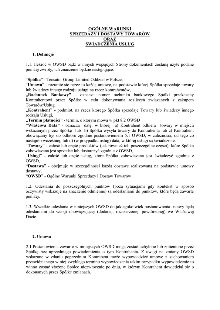 OGÓLNE WARUNKI SPRZEDAŻY I DOSTAWY TOWARÓW ORAZ ŚWIADCZENIA USŁUG 1. Definicje 1.1. Ilekroć w OWSD bądź w innych wiążących Strony dokumentach zostaną użyte podane poniżej zwroty, ich znaczenie będzie następujące: “Spółka” - Tensator Group Limited Oddział w Polsce, “Umowa” - rozumie się przez to każdą umowę, na podstawie której Spółka sprzedaje towary lub świadczy innego rodzaju usługi na rzecz kontrahentów, „Rachunek Bankowy” - oznacza numer rachunku bankowego Spółki przekazany Kontrahentowi przez Spółkę w celu dokonywania rozliczeń związanych z zakupem Towarów/Usług. „Kontrahent” - podmiot, na rzecz którego Spółka sprzedaje Towary lub świadczy innego rodzaju Usługi, „Termin płatności” - termin, o którym mowa w pkt 8.2 OWSD “Właściwa Data” - oznacza datę, w której a) Kontrahent odbiera towary w miejscu wskazanym przez Spółkę lub b) Spółka wysyła towary do Kontrahenta lub c) Kontrahent obowiązany był do odbioru zgodnie postanowieniem 5.1 OWSD, w zależności, od tego co nastąpiło wcześniej, lub d) (w przypadku usług) data, w której usługi są świadczone, “Towary” - całość lub część produktów (jak również ich poszczególne części), które Spółka zobowiązana jest sprzedać lub dostarczyć zgodnie z OWSD, “Usługi” - całość lub część usług, które Spółka zobowiązana jest świadczyć zgodnie z OWSD, “Dostawa” - obejmuje w szczególności każdą dostawę realizowaną na podstawie umowy dostawy, “OWSD” - Ogólne Warunki Sprzedaży i Dostaw Towarów 1.2. Odesłania do poszczególnych punktów (poza sytuacjami gdy kontekst w sposób oczywisty wskazuje na znaczenie odmienne) są odesłaniami do punktów, które będą zawarte poniżej. 1.3. Wszelkie odesłania w niniejszych OWSD do jakiegokolwiek postanowienia ustawy będą odesłaniami do wersji obowiązującej (dodanej, rozszerzonej, powtórzonej) we Właściwej Dacie. 2. Umowa 2.1.Postanowienia zawarte w niniejszych OWSD mogą zostać uchylone lub zmienione przez Spółkę bez uprzedniego powiadomienia o tym Kontrahenta. Z uwagi na zmiany OWSD wskazane w zdaniu poprzednim Kontrahent może wypowiedzieć umowę z zachowaniem przewidzianego w niej zwykłego terminu wypowiedzenia takim przypadku wypowiedzenie to winno zostać złożone Spółce niezwłocznie po dniu, w którym Kontrahent dowiedział się o dokonanych przez Spółkę zmianach. 2.2 Umowa zawierana pomiędzy Spółką a Kontrahentem na niniejszych warunkach wchodzi w życie wyłącznie po powiadomieniu Kontrahenta przez Spółkę o zaakceptowaniu złożonego przez Kontrahenta zamówienia. 2.3 Każda Umowa podlega wykonaniu zgodnie z OWSD. Z zastrzeżeniem punktu 2.4. OWSD żaden z przedstawicieli lub pełnomocników Spółki nie jest upoważniony do uzgadniania warunków odmiennych od wyrażonych w OWSD lub do reprezentowania Spółki w czynnościach niezgodnych z OWSD lub do zawierania jakichkolwiek umów, które nie byłyby wykonywane w oparciu o niniejsze OWSD. 2.4.Wszelkie warunki Umów lub zasady reprezentacji sprzeczne lub odmienne od zawartych w OWSD będą wiążącymi dla Spółki wyłącznie wówczas, gdy zostaną one wyrażone w formie pisemnej oraz podpisane przez upoważnioną osobę. Ilekroć w Umowie lub OWSD stosowany jest zwrot “o ile w Umowie z Kontrahentem nie postanowiono inaczej” - rozumie się przez niego postanowienia wyrażone w Umowie w formie pisemnej oraz podpisane przez upoważnioną do tego osobę. 2.5.O ile w Umowie z Kontrahentem nie postanowiono inaczej, niniejsze OWSD zastępują wszelkie warunki i uzgodnienia poczynione w trakcie negocjacji poprzedzających zawarcie Umowy. 2.6. Wszelkie opisy, ilustracje, ogłoszenia lub specyfikacje zawarte w katalogach, ulotkach, cennikach oraz innych materiałach reklamowych Spółki, skierowane do ogółu lub do poszczególnych osób, nie stanowią oferty zawarcia Umowy, jak również nie zawierają wiążących strony postanowień i warunków, ale służą one jedynie ukazaniu ogólnego przedmiotu działalności Spółki. 2.7. Spółka zastrzega sobie prawo do poprawiania w każdym czasie oczywistych błędów pisarskich bądź drukarskich popełnionych przez jej przedstawicieli lub pracowników. 3. Zamówienia indywidualne 3.1. Jeżeli Towary lub Usługi zostały wytworzone lub dostarczone przez Spółkę według zaleceń, instrukcji lub projektu Kontrahenta, przejmuje on całkowitą odpowiedzialność za wykonanie Umowy w zakresie poczynionych zmian. Kontrahent przejmuje odpowiedzialność zwłaszcza za naruszenie praw z patentu na wynalazek, praw ochronnych na wzór użytkowy lub znak towarowy, praw z rejestracji, praw autorskich, praw do nazw handlowych lub innych praw własności intelektualnej i przemysłowej oraz odpowiedzialność za szkody wyrządzone w następstwie naruszenia praw chronionych w którymkolwiek z państw. W ramach przejęcia odpowiedzialności na podstawie niniejszego zastrzeżenia Kontrahent będzie zobowiązany do naprawienia Spółce bądź osobie trzeciej szkody oraz do pokrycia wszelkich wydatków poniesionych w następstwie takiego naruszenia. 3.2. Spółka zastrzega sobie prawo odmowy wykonania Umowy zgodnie z zaleceniami, instrukcją bądź projektem Kontrahenta, jeżeli zmiany będą naruszać standardy bezpieczeństwa usługi lub towaru bądź inne wymogi ustawowe. Ponadto Spółka jest również uprawniona do dokonywania zmian w zamówieniach indywidualnie oznaczonych przez Kontrahenta, jeżeli zmiany te nie wpłyną na jakość i wykonanie Towarów lub Usług. 3.3. Kontrahent zobowiązany jest przekazać osobom trzecim, które mogą uzyskać posiadanie Towarów, wszelkie informacje dotyczące prawidłowego używania oraz bezpiecznego korzystania z Towarów, które zostały dostarczone Kontrahentowi przez Spółkę. 4. Ceny 4.1. O ile w Umowie z Kontrahentem nie postanowiono inaczej, Cennik Spółki dla Towarów i Usług sprzedawanych lub dostar