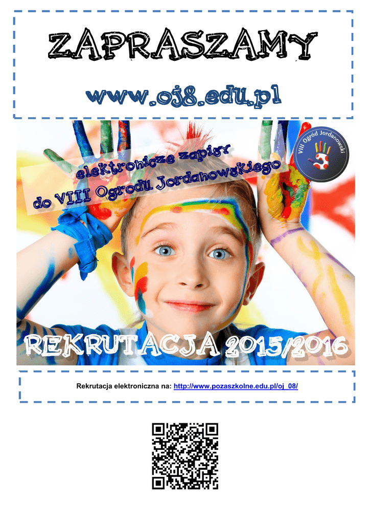 Rekrutacja elektroniczna na: http://www.pozaszkolne.edu.pl/oj_08/ W roku szkolnym 2015/2016 w VIII Ogrodzie Jordanowskim prowadzona będzie rekrutacja wspomagana systemem informatycznym. W ramach zajęć ogólnorozwojowych i opiekuńczo-wychowawczych prowadzone będą zajęcia stałe w następujących formach: L.p. 1. 2. 3. 4. 5. 6. Forma zajęć Przedział wiekowy Maksymalna liczebność poszczególnych grup 6–7 do 16 8 – 10 do 16 Team z Jordanka - zajęcia z piłki nożnej 10 - 12 do 16 W zdrowym ciele, zdrowy duch - gry i zabawy ogólnorozwojowe 6 - 10 do 16 6–7 do 16 8 - 10 do 16 7 – 10 do 12 8-10 do 10 11-14 do 10 8 – 12 do 16 9 – 12 do 16 Typ zajęć Małe Arcy-dzieła artystyczne Wysportowany Jordanek Gipsolandia Rodzaj zajęć plastyczne, wykorzystujące różnorodne techniki sportowe artystyczne malarsko-rzeźbiarskie, wykorzystujące jako podstawę do pracy gips i glinę Możesz … przedmiotowe wyrównujące szanse dydaktyczne uczniów ze specyficznymi trudnościami w nauce Odkrywcy Warszawy turystyczno – krajoznawcze zajęcia varsavianistyczne realizowane głównie z formie wycieczek po Warszawie. Szach – mat i nie tylko przedmiotowe poznawanie tajników gier ukierunkowanych na wykorzystanie logicznego myślenia 7. Wesoła Ortografia przedmiotowe zapoznanie z zasadami ortograficznymi języka polskiego w jasny i przystępny sposób 8 – 10 do 16 8. Klub Przedszkolaka przedmiotowe zajęcia dla najmłodszych w oparciu o podstawę programową z elementami rytmiki i zajęć sportowych 3–4 do 16 6-7 do 16 9. Z papierem i kredką, czyli papieroplastyka artystyczne 8-10 do 16 Zajęcia świetlicowe inne 6-12 do 80 10. plastyczne z wykorzystaniem elementów origami, kirinami oraz wycinanki, płaskie jak i przestrzenne to propozycja dla wszystkich dzieci w wieku szkolnym, które potrzebują opieki po lekcjach lub w przypadku braku zajęć dydaktycznych w danym dniu RODZICU PAMIĘTAJ !!! RODZAJ CZYNNOŚCI L.p. TERMIN 1. wybierz z dzieckiem zajęcia, w których chciałoby uczestniczyć i zaloguj się na stronie: http://www.pozaszkolne.edu.pl/oj_08/ System pozwoli na wygenerowanie wniosku, który należy złożyć w sekretariacie VIII Ogrody Jordanowskiego 2. ROZPOCZĘCIE REKRUTACJI: dla kontynuujących uczestników zajęć dla nowych uczestników zajęć 25/05 - 31/05/2015 od 02/06/2015 3. podanie do publicznej wiadomości listy uczestników zajęć (do wglądu w sekretariacie placówki) 31/08/2015 4. podanie do publicznej wiadomości informacji o liczbie wolnych miejsc 01/09/2015 5. postępowanie rekrutacji uzupełniającej na bieżąco* *Nabór na wolne miejsca jest prowadzony na podstawie kolejności zgłoszeń przez cały rok.