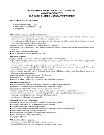 ZAMIERZENIA WYCHOWAWCZO-DYDAKTYCZNE NA MIESIĄC KWIECIEŃ DLA DZIECI 4-LETNICH, GRUPA "WIEWIÓREK" TEMATYKA KOMPLEKSOWA: 1. Mamy ciepłą wiosnę. (2 tyg.) 2. Przyszła do nas Wielkanoc. (2 tyg.) 3. W ogrodzie. Aktywność społeczna, przyrodnicza i zdrowotna: dostrzega zmiany zachodzące w przyrodzie wiosną; zna kwiaty wiosenne: tulipan, żonkil, stokrotka, bratek, hiacynt; zna budowę kwiatu: łodyga, liść, kwiat – słupek, pręcik; wykonuje czynności konieczne do posadzenia cebulki tulipana; wie, jakie warunki są niezbędne do wzrostu irozwoju roślin; uczy się pielęgnowania roślin; dostrzega zmiany zachodzące w wyglądzie jabłoni w ciągu roku; rozpoznaje i nazywa zwierzęta żyjące na łące; zna pojęcie owady; rozumie znaczenie barwy ochronnej w życiu zwierząt; zna tradycje związane z Wielkanocą; wie, w jaki sposób kurczak wykluwa się z jajka. Aktywność językowa: ogląda albumy przyrodnicze – interesuje się książką jako źródłem wiedzy; opowiada historyjkę obrazkową z użyciem pojęć: najpierw, potem, później, na końcu; buduje wypowiedzi wielozdaniowe rozumie pojęcie sad; posługuje się nazwami drzew owocowych: wiśnia, czereśnia, śliwa; posługuje się nazwami mieszkańców łąki: bocian, żaba, ślimak, kret, pszczoła, ważka, motyl, biedronka, mrówka, konik polny; wiąże opis słowny z reścią obrazka; ćwiczy mięśnie narządów mowy, doskonali koordynację oddechowo-ruchową oraz koordynację ruchów w obrębie aparatu artykulacyjnego; posługuje się określeniami związanymi z Wielkanocą; poprawnie łączy liczebnik z rzeczownikiem; dmucha na lekkie elementy, w celu nadania im odpowiedniego kierunku; Aktywność matematyczna: liczy w dostępnym zakresie; posługuje się nazwami liczebników porządkowych; porównuje liczebności zbiorów poprzez łączenie elementów w pary; posługuje się określeniami: mniej, więcej, po tyle samo, po równo, rozumie pojęcia: krótka, długa; na, nad, pod, wyżej, niżej, na dole strony, na górze strony. grupuje obrazki wg wzorów na pisankach; grupuje ozdobne jajka wg rodzajów: pisanki, kraszanki; odczytuje i samodzielnie tworzy rytmiczny układ elementów; orientuje się w schemacie własnego ciała; Aktywność plastyczna i techniczna: swobodnie operuje pędzlem i farbą; posługuje się nożyczkami, klejem, wykonuje pracę plastyczną techniką origami płaskie z koła; wykonuje wydzierankę z kolorowego papieru; wylepia plasteliną karton w kształcie prostokąta i ozdabia go wg własnych pomysłów; maluje drobne elementy i kształty nieregularne odzwierciedla w pracy plastycznej zapamiętane treści utworu; lepi z masy solnej – toczy formy owalne; rysuje pod dyktando. Aktywność słuchowa i muzyczna: zna i śpiewa piosenkę Bal na łące; Na świątecznym stole, zaznacza klaśnięciem pierwszą miarę taktu w rytmie trzymiarowym; wykonuje improwizację ruchową do utworu Edvarda Griega Poranek; rozpoznaje głosy: pszczoły, żaby, bociana, cykania świerszczy; podejmuje próby śpiewania w duecie i solo; uczestniczy w zabawie ze śpiewem. Aktywność ruchowa: ilustruje ruchem treść wiersza; rozwija ogólną sprawność, zwinność i koordynację ruchową; prawidłowo przyjmuje pozycje do ćwiczeń – siad skrzyżny i przysiad podparty; sprawnie wykonuje zadania ruchowe;