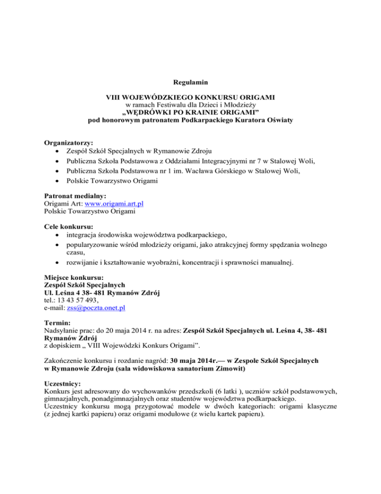 Regulamin VIII WOJEWÓDZKIEGO KONKURSU ORIGAMI w ramach Festiwalu dla Dzieci i Młodzieży „WĘDRÓWKI PO KRAINIE ORIGAMI” pod honorowym patronatem Podkarpackiego Kuratora Oświaty Organizatorzy: Zespół Szkół Specjalnych w Rymanowie Zdroju Publiczna Szkoła Podstawowa z Oddziałami Integracyjnymi nr 7 w Stalowej Woli, Publiczna Szkoła Podstawowa nr 1 im. Wacława Górskiego w Stalowej Woli, Polskie Towarzystwo Origami Patronat medialny: Origami Art: www.origami.art.pl Polskie Towarzystwo Origami Cele konkursu: integracja środowiska województwa podkarpackiego, popularyzowanie wśród młodzieży origami, jako atrakcyjnej formy spędzania wolnego czasu, rozwijanie i kształtowanie wyobraźni, koncentracji i sprawności manualnej. Miejsce konkursu: Zespół Szkół Specjalnych Ul. Leśna 4 38- 481 Rymanów Zdrój tel.: 13 43 57 493, e-mail: [email protected] Termin: Nadsyłanie prac: do 20 maja 2014 r. na adres: Zespół Szkół Specjalnych ul. Leśna 4, 38- 481 Rymanów Zdrój z dopiskiem „ VIII Wojewódzki Konkurs Origami”. Zakończenie konkursu i rozdanie nagród: 30 maja 2014r.— w Zespole Szkół Specjalnych w Rymanowie Zdroju (sala widowiskowa sanatorium Zimowit) Uczestnicy: Konkurs jest adresowany do wychowanków przedszkoli (6 latki ), uczniów szkół podstawowych, gimnazjalnych, ponadgimnazjalnych oraz studentów województwa podkarpackiego. Uczestnicy konkursu mogą przygotować modele w dwóch kategoriach: origami klasyczne (z jednej kartki papieru) oraz origami modułowe (z wielu kartek papieru). Warunki uczestnictwa: - własnoręczne złożenie modelu, - 1 osoba może przesłać lub dostarczyć na adres maksymalnie dwie prace, - do każdej pracy należy dołączyć wizytówkę o treści: 1. Tytuł pracy. 2. Imię i nazwisko autora /wykonawcy pracy. 3. Klasa. 4. Nazwa i adres szkoły. 5. Imię i nazwisko nauczyciela/opiekuna (telefon lub e-mail). Prace zbiorowe nie będą oceniane. Jury: W skład Jury wejdą plastycy oraz członkowie Polskiego Towarzystwa Origami. Jury dokonując oceny prac, kierować się będzie: - stopniem trudności wykonania modelu, - ciekawością pomysłu, - estetyką wykonania, - doborem kolorystyki. Prace będą oceniane w następujących kategoriach wiekowych: I przedszkola- 6 latki II szkoła podstawowa klasy 1-3 III szkoła podstawowa klasy 4-6 IV gimnazjum V szkoła ponadgimnazjalna VI studenci Wszystkie prace konkursowe zostaną wystawione w dniach 30 -31maja 2014r. w czasie trwania Festiwalu dla Dzieci i Młodzieży „WĘDRÓWKI PO KRAINIE ORIGAMI” w Zespole Szkół Specjalnych w Rymanowie Zdroju. Nie zwracamy prac konkursowych. Zwycięzcy otrzymają atrakcyjne nagrody rzeczowe i dyplomy, nauczyciele/opiekunowie – podziękowania. Serdecznie zapraszamy do udziału w konkursie. Koordynatorzy konkursu: Janusz Bis – PSPzOI nr 7 w Stalowej Woli, e-mail: [email protected] Małgorzata Czyż — ZSS w Rymanowie Zdroju e-mail: [email protected] Anna Skorupa – PSP nr 1 w Stalowej Woli, e-mail: [email protected] Maria Bis – PSPzOI Nr 7 w Stalowej Woli, e-mail: [email protected]