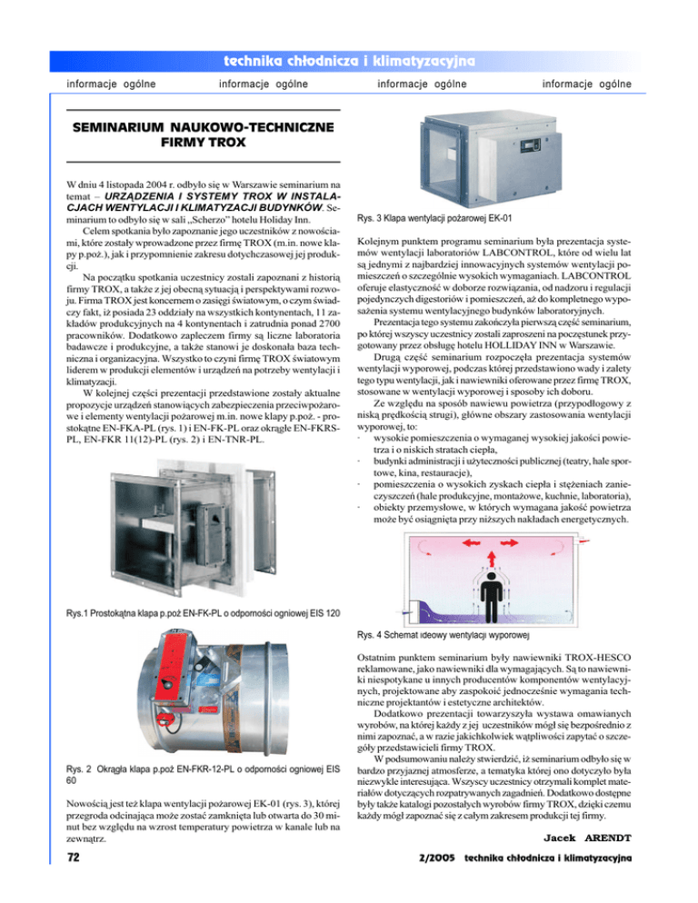 informacje ogólne informacje ogólne informacje ogólne informacje ogólne SEMINARIUM NAUKOWO-TECHNICZNE FIRMY TROX W dniu 4 listopada 2004 r. odby³o siê w Warszawie seminarium na temat – URZ¥DZENIA I SYSTEMY TROX W INSTALACJACH WENTYLACJI I KLIMATYZACJI BUDYNKÓW. Seminarium to odby³o siê w sali „Scherzo” hotelu Holiday Inn. Celem spotkania by³o zapoznanie jego uczestników z nowoœciami, które zosta³y wprowadzone przez firmê TROX (m.in. nowe klapy p.po¿.), jak i przypomnienie zakresu dotychczasowej jej produkcji. Na pocz¹tku spotkania uczestnicy zostali zapoznani z histori¹ firmy TROX, a tak¿e z jej obecn¹ sytuacj¹ i perspektywami rozwoju. Firma TROX jest koncernem o zasiêgi œwiatowym, o czym œwiadczy fakt, i¿ posiada 23 oddzia³y na wszystkich kontynentach, 11 zak³adów produkcyjnych na 4 kontynentach i zatrudnia ponad 2700 pracowników. Dodatkowo zapleczem firmy s¹ liczne laboratoria badawcze i produkcyjne, a tak¿e stanowi je doskona³a baza techniczna i organizacyjna. Wszystko to czyni firmê TROX œwiatowym liderem w produkcji elementów i urz¹dzeñ na potrzeby wentylacji i klimatyzacji. W kolejnej czêœci prezentacji przedstawione zosta³y aktualne propozycje urz¹dzeñ stanowi¹cych zabezpieczenia przeciwpo¿arowe i elementy wentylacji po¿arowej m.in. nowe klapy p.po¿. - prostok¹tne EN-FKA-PL (rys. 1) i EN-FK-PL oraz okr¹g³e EN-FKRSPL, EN-FKR 11(12)-PL (rys. 2) i EN-TNR-PL. Rys.1 Prostokątna klapa p.poż EN-FK-PL o odporności ogniowej EIS 120 Rys. 2 Okrągła klapa p.poż EN-FKR-12-PL o odporności ogniowej EIS 60 Nowoœci¹ jest te¿ klapa wentylacji po¿arowej EK-01 (rys. 3), której przegroda odcinaj¹ca mo¿e zostaæ zamkniêta lub otwarta do 30 minut bez wzglêdu na wzrost temperatury powietrza w kanale lub na zewn¹trz. 72 Rys. 3 Klapa wentylacji pożarowej EK-01 Kolejnym punktem programu seminarium by³a prezentacja systemów wentylacji laboratoriów LABCONTROL, które od wielu lat s¹ jednymi z najbardziej innowacyjnych systemów wentylacji pomieszczeñ o szczególnie wysokich wymaganiach. LABCONTROL oferuje elastycznoœæ w doborze rozwi¹zania, od nadzoru i regulacji pojedynczych digestoriów i pomieszczeñ, a¿ do kompletnego wyposa¿enia systemu wentylacyjnego budynków laboratoryjnych. Prezentacja tego systemu zakoñczy³a pierwsz¹ czêœæ seminarium, po której wszyscy uczestnicy zostali zaproszeni na poczêstunek przygotowany przez obs³ugê hotelu HOLLIDAY INN w Warszawie. Drug¹ czêœæ seminarium rozpoczê³a prezentacja systemów wentylacji wyporowej, podczas której przedstawiono wady i zalety tego typu wentylacji, jak i nawiewniki oferowane przez firmê TROX, stosowane w wentylacji wyporowej i sposoby ich doboru. Ze wzglêdu na sposób nawiewu powietrza (przypod³ogowy z nisk¹ prêdkoœci¹ strugi), g³ówne obszary zastosowania wentylacji wyporowej, to: · wysokie pomieszczenia o wymaganej wysokiej jakoœci powietrza i o niskich stratach ciep³a, · budynki administracji i u¿ytecznoœci publicznej (teatry, hale sportowe, kina, restauracje), · pomieszczenia o wysokich zyskach ciep³a i stê¿eniach zanieczyszczeñ (hale produkcyjne, monta¿owe, kuchnie, laboratoria), · obiekty przemys³owe, w których wymagana jakoœæ powietrza mo¿e byæ osi¹gniêta przy ni¿szych nak³adach energetycznych. Rys. 4 Schemat ideowy wentylacji wyporowej Ostatnim punktem seminarium by³y nawiewniki TROX-HESCO reklamowane, jako nawiewniki dla wymagaj¹cych. S¹ to nawiewniki niespotykane u innych producentów komponentów wentylacyjnych, projektowane aby zaspokoiæ jednoczeœnie wymagania techniczne projektantów i estetyczne architektów. Dodatkowo prezentacji towarzyszy³a wystawa omawianych wyrobów, na której ka¿dy z jej uczestników móg³ siê bezpoœrednio z nimi zapoznaæ, a w razie jakichkolwiek w¹tpliwoœci zapytaæ o szczegó³y przedstawicieli firmy TROX. W podsumowaniu nale¿y stwierdziæ, i¿ seminarium odby³o siê w bardzo przyjaznej atmosferze, a tematyka której ono dotyczy³o by³a niezwykle interesuj¹ca. Wszyscy uczestnicy otrzymali komplet materia³ów dotycz¹cych rozpatrywanych zagadnieñ. Dodatkowo dostêpne by³y tak¿e katalogi pozosta³ych wyrobów firmy TROX, dziêki czemu ka¿dy móg³ zapoznaæ siê z ca³ym zakresem produkcji tej firmy. 2/2005 Jacek ARENDT technika ch³odnicza i klimatyzacyjna