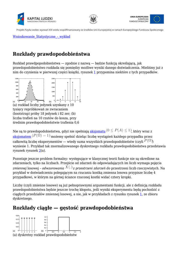 Wnioskowanie_Statystyczne_-_wykład Rozkłady prawdopodobieństwa Rozkład prawdpopodobieństwa — zgodnie z nazwą — będzie funkcją określającą, jak prawdopodobieństwo rozkłada się pomiędzy możliwe wyniki danego doświadczenia. Mieliśmy już z nim do czynienia w pierwszej części książki, rysunek 1 przypomina niektóre z tych przypadków. (a) rozkład liczby jedynek uzyskany z 10 tysięcy repróbkowań ze zwracaniem (bootstrap) próby 18 jedynek i 82 zer; (b) liczba trafień na 10 rzutów do kosza, przy średnim prawdopodobieństwie trafienia 0,6 Nie są to prawdopodobieństwa, gdyż nie spełniają aksjomatu aksjomatem , który wraz z możemy spełnić dzieląc liczbę wystąpień każdego przypadku przez całkowitą liczbę eksperymentów — wtedy suma wszystkich prawdopodobieństw (czyli ) wyniesie 1. Przykład tak znormalizowanego dyskretnego rozkładu prawdopodobieństwa przedstawia rysunek rysunek 2(a). Pozostaje jeszcze problem formalny: występujące w klasycznej teorii funkcje nie są określone na zdarzeniach, tylko na liczbach. Przejście od zdarzeń do odpowiadających im liczb wymaga pojęcia zmiennej losowej – odwzorowania z przestrzeni zdarzeń do przestrzeni liczb rzeczywistych. Na przykład w doświadczeniu polegającym na rzucaniu kostką zmienna losowa przypisze liczbę 4 przypadkowi, w którym na górnej ściance rzuconej kostki widać cztery kropki. Liczby (czyli zmienne losowe) są już pełnoprawnymi argumentami funkcji, ale z definicją rozkładu prawdopodobieństwa będzie jeszcze trochę kłopotu, jeśli wyniki eksperymentu będą pochodzić z ciągłych przedziałów zmiennej losowej, a nie, jak w przykładach z rysunku rysunek 1, ze zbioru dyskretnego. Rozkłady ciągłe — gęstość prawdopodobieństwa (a) dyskretny rozkład prawdopodobieństw wyników rzutu kostką; (b) ciągły rozkład prawdopodobieństwa dla liczb rzeczywistych z przedziału od zera do jednego. Z rozkładem ciągłym mieliśmy do czynienia, gdy używaliśmy generatora liczb losowych — losował on z równym prawdopodobieństwem liczby rzeczywiste z przedziału od zera do jednego. Funkcja przypisująca równe prawdopodobieństwa liczbom od zera do jednego powinna wyglądać jak na rysunku 2(b). A jednak coś się tu nie zgadza... Zacznijmy od rozkładu dyskretnego, czyli wykresu 2(a). Prawdopodobieństwo dla zmiennej losowej (teraz nie jest to już formalnie zdarzenie) wynoszącej na przykład 2 odczytujemy jako wynoszące 0,167. Czyli mniejsze od 1 i większe od zera. Suma prawdopodobieństw dla wszystkich możliwych wartości zmiennej losowej wyniesie 1 — wszystko zgadza się z aksjomatami definicji prawdopodobieństwa. Teraz spróbujmy z wykresu po prawej stronie odczytać wartość prawdopodobieństwa wylosowania jakiejś liczby spomiędzy 0 i 1. Jeden? To oznacza pewność — niemożliwe. Na osi powinna występować jakaś znacznie mniejsza wartość... Ale jaka? Zastanówmy się: niezależnie od tego, jak małą (niezerową i nieujemną) wartość przyjmiemy dla prawdopodobieństwa wylosowania dowolnej liczby z tego przedziału, to gdy zaczniemy je sumować dla wszystkich możliwych wyników, których na odcinku dostaniemy więcej niż jeden. Najwyraźniej tak się nie da. jest wszak nieskończenie wiele, zawsze Widać już, że sumę będziemy musieli zastąpić całką — jest to właśnie graniczny przypadek sumy. W tym układzie aksjomat , który dla przypadku dyskretnego wyrażał się sumą teraz będzie wyrażał się całką gdzie prawdopodobieństwo zastąpiła, z przyczyn, które staną się jasne za chwilę, gęstość prawdopodobieństwa . Łatwo sprawdzić, że całka rozkładu z rys. 2 spełnia ten warunek. Jednak pozostaje problem odczytywania wartości prawdopodobieństwa dla konkretnej wartości zmiennej losowej. Przypomnijmy sobie, że symulując rzuty monetą korzystaliśmy z faktu, że prawdopodobieństwo wylosowania liczby mniejszej niż wynosi 0,5. Zdefiniujmy więc dystrybuantę prawdopodobieństwa zmiennej losowej jako prawdopodobieństwo wystąpienia któregokolwiek ze zdarzeń, dla których zmienna losowa przyjmuje wartości mniejsze od : Będzie to oczywiście funkcja niemalejąca, dążąca do zera dla małych i do jednego dla dużych. Dla rozkładu z rysunku 2(b) dystrybuanta będzie wyglądać jak na rysunku 3. Dystrybuanta ciągłej zmiennej losowej o równym prawdopodobieństwie na przedziale (0, 1). Dopiero teraz gęstość prawdopodobieństwa zmiennej losowej określimy jako pochodną dystrybuanty Dlaczego gęstość, a nie po prostu rozkład prawdopodobieństwa, jak w przypadku dyskretnym? Właśnie ze względu na problemy z odczytem prawdopodobieństwa dla konkretnej wartości zmiennej. Na podobny problem trafiamy np. w fizyce, próbując obliczyć masę punktu. Masa to iloczyn (całka) gęstości i objętości, a punkt ma zerową objętość. Aby otrzymać niezerową masę, gęstość materii musimy scałkować w jakimś niezerowym obszarze — nie można przyjąć za masę gęstości materii w danym punkcie. Tak samo w przypadku ciągłych rozkładów gęstości prawdopodobieństwa, prawdopodobieństwo możemy obliczyć tylko dla niezerowego przedziału zmiennej losowej, a wartość odczytywaną dla konkretnej wartości zmiennej losowej interpretujemy jako gęstość.