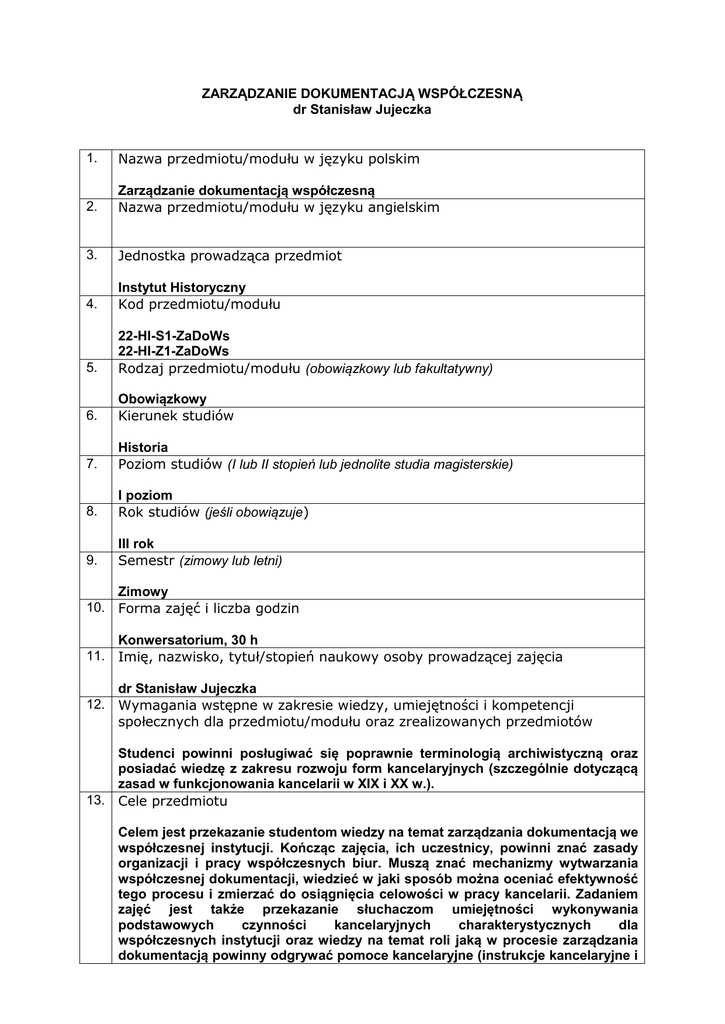 ZARZĄDZANIE DOKUMENTACJĄ WSPÓŁCZESNĄ dr Stanisław Jujeczka 1. Nazwa przedmiotu/modułu w języku polskim 2. Zarządzanie dokumentacją współczesną Nazwa przedmiotu/modułu w języku angielskim 3. Jednostka prowadząca przedmiot 4. Instytut Historyczny Kod przedmiotu/modułu 5. 22-HI-S1-ZaDoWs 22-HI-Z1-ZaDoWs Rodzaj przedmiotu/modułu (obowiązkowy lub fakultatywny) 6. Obowiązkowy Kierunek studiów 7. Historia Poziom studiów (I lub II stopień lub jednolite studia magisterskie) 8. I poziom Rok studiów (jeśli obowiązuje) 9. III rok Semestr (zimowy lub letni) Zimowy 10. Forma zajęć i liczba godzin Konwersatorium, 30 h 11. Imię, nazwisko, tytuł/stopień naukowy osoby prowadzącej zajęcia dr Stanisław Jujeczka 12. Wymagania wstępne w zakresie wiedzy, umiejętności i kompetencji społecznych dla przedmiotu/modułu oraz zrealizowanych przedmiotów Studenci powinni posługiwać się poprawnie terminologią archiwistyczną oraz posiadać wiedzę z zakresu rozwoju form kancelaryjnych (szczególnie dotyczącą zasad w funkcjonowania kancelarii w XIX i XX w.). 13. Cele przedmiotu Celem jest przekazanie studentom wiedzy na temat zarządzania dokumentacją we współczesnej instytucji. Kończąc zajęcia, ich uczestnicy, powinni znać zasady organizacji i pracy współczesnych biur. Muszą znać mechanizmy wytwarzania współczesnej dokumentacji, wiedzieć w jaki sposób można oceniać efektywność tego procesu i zmierzać do osiągnięcia celowości w pracy kancelarii. Zadaniem zajęć jest także przekazanie słuchaczom umiejętności wykonywania podstawowych czynności kancelaryjnych charakterystycznych dla współczesnych instytucji oraz wiedzy na temat roli jaką w procesie zarządzania dokumentacją powinny odgrywać pomoce kancelaryjne (instrukcje kancelaryjne i wykazy akt). 14. Zakładane efekty kształcenia Symbole kierunkowych efektów kształcenia, np.: K_W01*, K_U05, K_K03 WIEDZA Posiada zaawansowaną wiedzę ogólną z zakresu archiwistyki Opanował fachową terminologię z archiwistyki i wiedzy o dokumentacji współczesnej. Ma podstawową wiedzę o specyfice przedmiotowej i metodologicznej nauk archiwalnych Zna podstawowe narzędzia warsztatu archiwisty zakładowego i pracownika kancelarii Posiada podstawową wiedzę pozwalającą na analizę i interpretację źródeł prawa archiwalnego przydatnych dla poznania współczesnej kancelarii Zdaje sobie sprawę z różnorodności źródeł informacji. Rozumie ich przydatność w badaniach nad kancelarią współczesną. UMIEJĘTNOŚCI Opanował i stosuje podstawowe umiejętności badawcze w zakresie nauk archiwalnych korzystając z zaleceń i wskazówek opiekuna naukowego. Definiuje, objaśnia i stosuje poprawnie w mowie i w piśmie podstawowe terminy fachowe właściwe dla archiwistyki i zarządzania dokumentacją. Rozpoznaje, wykorzystuje i analizuje teksty prawne przydatne w pracy i warsztacie archiwisty Stosuje podstawowe elementy warsztatu „zarządcy dokumentacji” dobierając metody i narzędzia właściwe dla wybranego problemu. Wyszukuje i systematyzuje informacje dotyczące nauk archiwalnych i pokrewnych. Wykorzystuje repertoria bibliograficzne, inwentarze archiwalne, informatyczne bazy danych. Pracuje w zespole, rozwiązując proste problemy z zakresu „zarządzania dokumentacją” stosując opracowane dla zespołu instrukcje i procedury Korzysta z technologii informacyjnej, multimediów i zasobów Internetu. Potrafi je oceniać i opracowywać. KOMPETENCJE PERSONALNE I SPOŁECZNE Rozumie konieczność przestrzegania norm etycznych w pracy archiwisty i urzędnika. Docenia rolę nauk archiwalnych i pokrewnych dla kształtowania więzi społecznych na poziomie lokalnym i ponadlokalnym. Ma świadomość zakresu swojej wiedzy historycznej i umiejętności warsztatowych i rozumie potrzebę dalszego, ciągłego rozwoju kompetencji w zakresie fachowym, ogólno humanistycznym, jak też kompetencji personalnych i społecznych. Rozwija swoje zainteresowania fachowe, społeczne i kulturalne 15. Treści programowe Dokument współczesny Współczesne rodzaje dokumentacji Dokument elektroniczny Standard ISO 15489-1, ISO serii 9000 (zarządzanie jakością) Biuletyn Informacji Publicznej Archiwum Zakładowe Kancelaria tajna, archiwizowanie dokumentacji niejawnej Instrukcja kancelaryjna Jednolity rzeczowy wykaz akt Podpis elektroniczny K_W01 K_W03 K_W10 K_W11 K_W12 K_W13 K_U03 K_U05 K_U06 K_U07 K_U09 K_U12 K_U21 K_K01 K_K02 K_K03 K_K06 Ochrona danych osobowych a archiwa 16. Zalecana literatura (podręczniki) Kancelaria i archiwum zakładowe. Podręcznik, red. Z. Pustuła, Warszawa 2001 (lub wyd. 2: red. E. Borodij, Warszawa 2009) Vademecum kancelaryjno-archiwalne, red. K. Stryjkowski, Poznań 2001 17. Forma zaliczenia poszczególnych komponentów przedmiotu/modułu, sposób sprawdzenia osiągnięcia zamierzonych efektów kształcenia: konwersatorium: Warunkiem zaliczenia przedmiotu jest aktywne uczestnictwo w zajęciach, odpowiednia frekwencja oraz pozytywna ocena z kolokwium zaliczeniowego obejmującego podstawowe pojęcia poruszane na zajęciach. 18. Język wykładowy polski 19. Obciążenie pracą studenta Forma aktywności studenta Godziny zajęć (wg planu studiów) z nauczycielem: - ćwiczenia: Praca własna studenta np.: - przygotowanie do zajęć: - opracowanie wyników: - czytanie wskazanej literatury: - napisanie raportu z zajęć: - przygotowanie do kolokwium: Średnia liczba godzin na zrealizowanie aktywności 30 30 15 15 Suma godzin 90 Liczba punktów ECTS 3