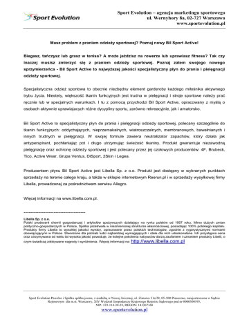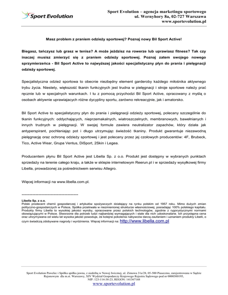 Sport Evolution – agencja marketingu sportowego ul. Wernyhory 8a, 02-727 Warszawa www.sportevolution.pl Masz problem z praniem odzieży sportowej? Poznaj nowy Bil Sport Active! Biegasz, tańczysz lub grasz w tenisa? A może jeździsz na rowerze lub uprawiasz fitness? Tak czy inaczej musisz zmierzyć się z praniem odzieży sportowej. Poznaj zatem swojego nowego sprzymierzeńca - Bil Sport Active to najwyższej jakości specjalistyczny płyn do prania i pielęgnacji odzieży sportowej. Specjalistyczna odzież sportowa to obecnie niezbędny element garderoby każdego miłośnika aktywnego trybu życia. Niestety, większość tkanin funkcyjnych jest trudna w pielęgnacji i stroje sportowe należy prać ręcznie lub w specjalnych warunkach. I tu z pomocą przychodzi Bil Sport Active, opracowany z myślą o osobach aktywnie uprawiajacych różne dycypliny sportu, zarówno rekreacyjnie, jak i amatorsko. Bil Sport Active to specjalistyczny płyn do prania i pielęgnacji odzieży sportowej, polecany szczególnie do tkanin funkcyjnych: oddychających, nieprzemakalnych, wiatroszczelnych, membranowych, bawełnianych i innych trudnych w pielęgnacji. W swojej formule zawiera neutralizator zapachów, który działa jak antyperspirant, pochłaniając pot i długo utrzymując świeżość tkaniny. Produkt gwarantuje niezawodną pielęgnację oraz ochronę odzieży sportowej i jest polecany przez jej czołowych producentów: 4F, Brubeck, Tico, Active Wear, Grupa Ventus, DiSport, 2Skin i Legea. Producentem płynu Bil Sport Active jest Libella Sp. z o.o. Produkt jest dostępny w wybranych punktach sprzedaży na terenie całego kraju, a także w sklepie internetowym Reerun.pl i w sprzedaży wysyłkowej firmy Libella, prowadzonej za pośrednictwem serwisu Allegro. Więcej informacji na www.libella.com.pl. ------------------------------------Libella Sp. z o.o. Polski prodecent chemii gospodarczej i artykułów spożywczych działający na rynku polskim od 1957 roku. Mimo dużych zmian polityczno-gospodarczych w Polsce, Spółka przetrwała w niezmienionej strukturze własnościowej, posiadając 100% polskiego kapitału. Produkty firmy Libella to wysokiej jakości wyroby, opracowane przez polskich technologów, zgodnie z rygorystycznymi normami obowiązującymi w Polsce. Stworzone dla potrzeb ludzi najbardziej wymagających i stale dla nich udoskonalane. Ich przystępna cena oraz utrzymywana od wielu lat wysoka jakość powoduje, że kolejne pokolenia nabywców darzą zaufaniem i uznaniem produkty Libelli, o czym świadczą zdobywane nagrody i wyróżnienia. Więcej informacji na: http://www.libella.com.pl Sport Evolution Pawelec i Spółka spółka jawna, z siedzibą w Nowej Iwicznej, ul. Zimowa 31a/28, 05-500 Piaseczno, zarejestrowana w Sądzie Rejonowym dla m.st. Warszawy, XIV Wydział Gospodarczy Krajowego Rejestru Sądowego pod nr 0000300195, NIP: 123-114-38-23, REGON: 141367168 www.sportevolution.pl