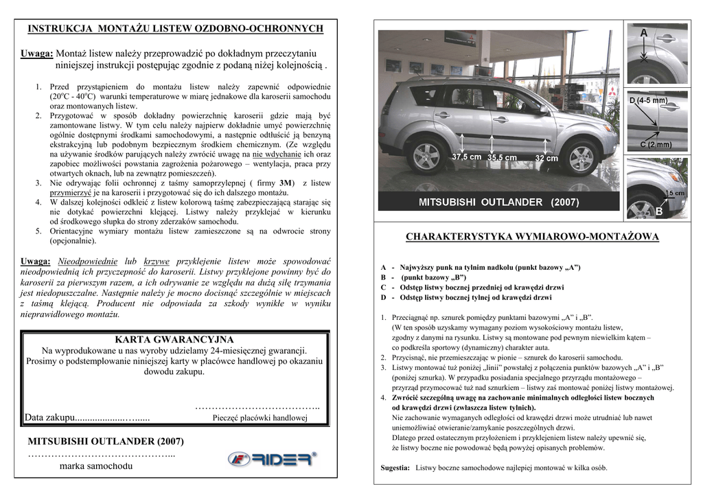 INSTRUKCJA MONTAŻU LISTEW OZDOBNO-OCHRONNYCH Uwaga: Montaż listew należy przeprowadzić po dokładnym przeczytaniu niniejszej instrukcji postępując zgodnie z podaną niżej kolejnością . 1. Przed przystąpieniem do montażu listew należy zapewnić odpowiednie (20oC - 40oC) warunki temperaturowe w miarę jednakowe dla karoserii samochodu oraz montowanych listew. 2. Przygotować w sposób dokładny powierzchnię karoserii gdzie mają być zamontowane listwy. W tym celu należy najpierw dokładnie umyć powierzchnię ogólnie dostępnymi środkami samochodowymi, a następnie odtłuścić ją benzyną ekstrakcyjną lub podobnym bezpiecznym środkiem chemicznym. (Ze względu na używanie środków parujących należy zwrócić uwagę na nie wdychanie ich oraz zapobiec możliwości powstania zagrożenia pożarowego – wentylacja, praca przy otwartych oknach, lub na zewnątrz pomieszczeń). 3. Nie odrywając folii ochronnej z taśmy samoprzylepnej ( firmy 3M) z listew przymierzyć je na karoserii i przygotować się do ich dalszego montażu. 4. W dalszej kolejności odkleić z listew kolorową taśmę zabezpieczającą starając się nie dotykać powierzchni klejącej. Listwy należy przyklejać w kierunku od środkowego słupka do strony zderzaków samochodu. 5. Orientacyjne wymiary montażu listew zamieszczone są na odwrocie strony (opcjonalnie). Uwaga: Nieodpowiednie lub krzywe przyklejenie listew może spowodować nieodpowiednią ich przyczepność do karoserii. Listwy przyklejone powinny być do karoserii za pierwszym razem, a ich odrywanie ze względu na dużą siłę trzymania jest niedopuszczalne. Następnie należy je mocno docisnąć szczególnie w miejscach z taśmą klejącą. Producent nie odpowiada za szkody wynikłe w wyniku nieprawidłowego montażu. KARTA GWARANCYJNA Na wyprodukowane u nas wyroby udzielamy 24-miesięcznej gwarancji. Prosimy o podstemplowanie niniejszej karty w placówce handlowej po okazaniu dowodu zakupu. ……………………………….. Data zakupu....................…...... MITSUBISHI OUTLANDER (2007) M ……………………………………... marka samochodu Pieczęć placówki handlowej CHARAKTERYSTYKA WYMIAROWO-MONTAŻOWA A B C D - Najwyższy punk na tylnim nadkolu (punkt bazowy „A”) (punkt bazowy „B”) Odstęp listwy bocznej przedniej od krawędzi drzwi Odstęp listwy bocznej tylnej od krawędzi drzwi 1. Przeciągnąć np. sznurek pomiędzy punktami bazowymi „A” i „B”. (W ten sposób uzyskamy wymagany poziom wysokościowy montażu listew, zgodny z danymi na rysunku. Listwy są montowane pod pewnym niewielkim kątem – co podkreśla sportowy (dynamiczny) charakter auta. 2. Przycisnąć, nie przemieszczając w pionie – sznurek do karoserii samochodu. 3. Listwy montować tuż poniżej „linii” powstałej z połączenia punktów bazowych „A” i „B” (poniżej sznurka). W przypadku posiadania specjalnego przyrządu montażowego – przyrząd przymocować tuż nad sznurkiem – listwy zaś montować poniżej listwy montażowej. 4. Zwrócić szczególną uwagę na zachowanie minimalnych odległości listew bocznych od krawędzi drzwi (zwłaszcza listew tylnich). Nie zachowanie wymaganych odległości od krawędzi drzwi może utrudniać lub nawet uniemożliwiać otwieranie/zamykanie poszczególnych drzwi. Dlatego przed ostatecznym przyłożeniem i przyklejeniem listew należy upewnić się, że listwy boczne nie powodować będą powyżej opisanych problemów. Sugestia: Listwy boczne samochodowe najlepiej montować w kilka osób.