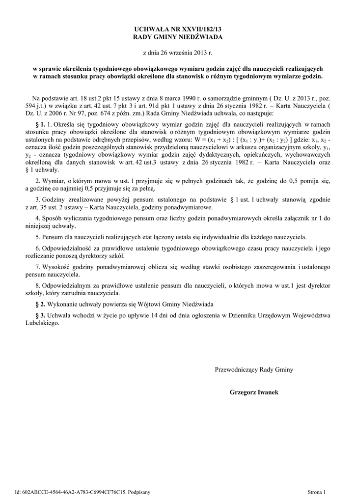 UCHWAŁA NR XXVII/182/13 RADY GMINY NIEDŹWIADA z dnia 26 września 2013 r. w sprawie określenia tygodniowego obowiązkowego wymiaru godzin zajęć dla nauczycieli realizujących w ramach stosunku pracy obowiązki określone dla stanowisk o różnym tygodniowym wymiarze godzin. Na podstawie art. 18 ust.2 pkt 15 ustawy z dnia 8 marca 1990 r. o samorządzie gminnym ( Dz. U. z 2013 r., poz. 594 j.t.) w związku z art. 42 ust. 7 pkt 3 i art. 91d pkt 1 ustawy z dnia 26 stycznia 1982 r. – Karta Nauczyciela ( Dz. U. z 2006 r. Nr 97, poz. 674 z późn. zm.) Rada Gminy Niedźwiada uchwala, co następuje: § 1. 1. Określa się tygodniowy obowiązkowy wymiar godzin zajęć dla nauczycieli realizujących w ramach stosunku pracy obowiązki określone dla stanowisk o różnym tygodniowym obowiązkowym wymiarze godzin ustalonych na podstawie odrębnych przepisów, według wzoru: W = (x1 + x2) : [ (x1 : y1)+ (x2 : y2) ] gdzie: x1, x2 oznacza ilość godzin poszczególnych stanowisk przydzieloną nauczycielowi w arkuszu organizacyjnym szkoły, y1, y2 - oznacza tygodniowy obowiązkowy wymiar godzin zajęć dydaktycznych, opiekuńczych, wychowawczych określoną dla danych stanowisk w art. 42 ust.3 ustawy z dnia 26 stycznia 1982 r. – Karta Nauczyciela oraz § 1 uchwały. 2. Wymiar, o którym mowa w ust. 1 przyjmuje się w pełnych godzinach tak, że godzinę do 0,5 pomija się, a godzinę co najmniej 0,5 przyjmuje się za pełną. 3. Godziny zrealizowane powyżej pensum ustalonego na podstawie § 1 ust. 1 uchwały stanowią zgodnie z art. 35 ust. 2 ustawy – Karta Nauczyciela, godziny ponadwymiarowe. 4. Sposób wyliczania tygodniowego pensum oraz liczby godzin ponadwymiarowych określa załącznik nr 1 do niniejszej uchwały. 5. Pensum dla nauczycieli realizujących etat łączony ustala się indywidualnie dla każdego nauczyciela. 6. Odpowiedzialność za prawidłowe ustalenie tygodniowego obowiązkowego czasu pracy nauczyciela i jego rozliczanie ponoszą dyrektorzy szkół. 7. Wysokość godziny ponadwymiarowej oblicza się według stawki osobistego zaszeregowania i ustalonego pensum nauczyciela. 8. Odpowiedzialnym za prawidłowe ustalenie pensum dla nauczycieli, o których mowa w ust.1 jest dyrektor szkoły, który zatrudnia nauczyciela. § 2. Wykonanie uchwały powierza się Wójtowi Gminy Niedźwiada § 3. Uchwała wchodzi w życie po upływie 14 dni od dnia ogłoszenia w Dzienniku Urzędowym Województwa Lubelskiego. Przewodniczący Rady Gminy Grzegorz Iwanek Id: 602ABCCE-4564-46A2-A783-C6994CF76C15. Podpisany Strona 1 Załącznik Nr 1 do Uchwały Nr XXVII/182/13 Rady Gminy Niedźwiada z dnia 26 września 2013 r. Przykładowy sposób naliczania łączonego pensum nauczyciela 1) Nauczyciel realizuje łącznie 28 godzin, w tym 20 godzin wg pensum 22 godzinnego i 8 wg pensum 18 godzinnego; W = (20+8) : [(20:22) + (8:18)] = 28 : (0,91+0,44) = 28 : 1,35 = 20,74 = 21 /pensum nauczyciela/ 20+8 = 28 /godziny z arkusz organizacyjnego/ Tygodniowy obowiązkowy ponadwymiarowych. wymiar zajęć tego nauczyciela wynosi 21 godzin + 7 godzin 2) Nauczyciel realizuje łącznie 20 godzin, w tym 17 godzin wg pensum 18 godzinnego i 3 godziny wg pensum 30 godzinnego; W = (17+3) : [(17:18) + (3:30)] = 20 : (0,94+0,10) = 20 : 1,04 = 19,23 = 19 /pensum nauczyciela/ 17+3 = 20 /godziny z arkusz organizacyjnego/ Tygodniowy obowiązkowy wymiar zajęć tego nauczyciela wynosi 19 godzin + 1 godzina ponadwymiarowa. 3) Nauczyciel realizuje łącznie 20 godzin, w tym 15 godzin wg pensum 18 godzinnego i 5 godziny wg pensum 26 godzinnego; W = (15+5) : [(15:18) + (5:26)] = 20 : (0,83+0,19) = 20 : 1,02 = 19,60 = 20 /pensum nauczyciela/ 15+5 = 20 /godziny z arkusz organizacyjnego/ Tygodniowy obowiązkowy wymiar zajęć tego nauczyciela wynosi 20 godzin – brak godzin ponadwymiarowych. Przedmiotowa uchwała ma zastosowanie do nauczycieli realizujących zajęcia dydaktyczne, opiekuńcze i wychowawcze w ramach jednego stosunku pracy, dla których przewidziana jest różna liczba godzin, szczególnie w przypadku braku możliwości zatrudnienia nauczyciela na jednym stanowisku w pełnym wymiarze czasu pracy. Wszystkie godziny realizowane przez nauczycieli powyżej ustalonego tygodniowego obowiązkowego wymiaru godzin, o których mowa w § 1 pkt. 1 uchwały stanowić będą godziny ponadwymiarowe dla nowo obliczonego pensum. Przepisy § 1 stosuje się odpowiednio do określenia tygodniowego obowiązkowego wymiaru godzin zajęć nauczycieli zatrudnionych w niepełnym wymiarze czasu pracy, realizujących obowiązki określone dla stanowisk o różnym tygodniowym obowiązkowym wymiarze godzin. Id: 602ABCCE-4564-46A2-A783-C6994CF76C15. Podpisany Strona 1