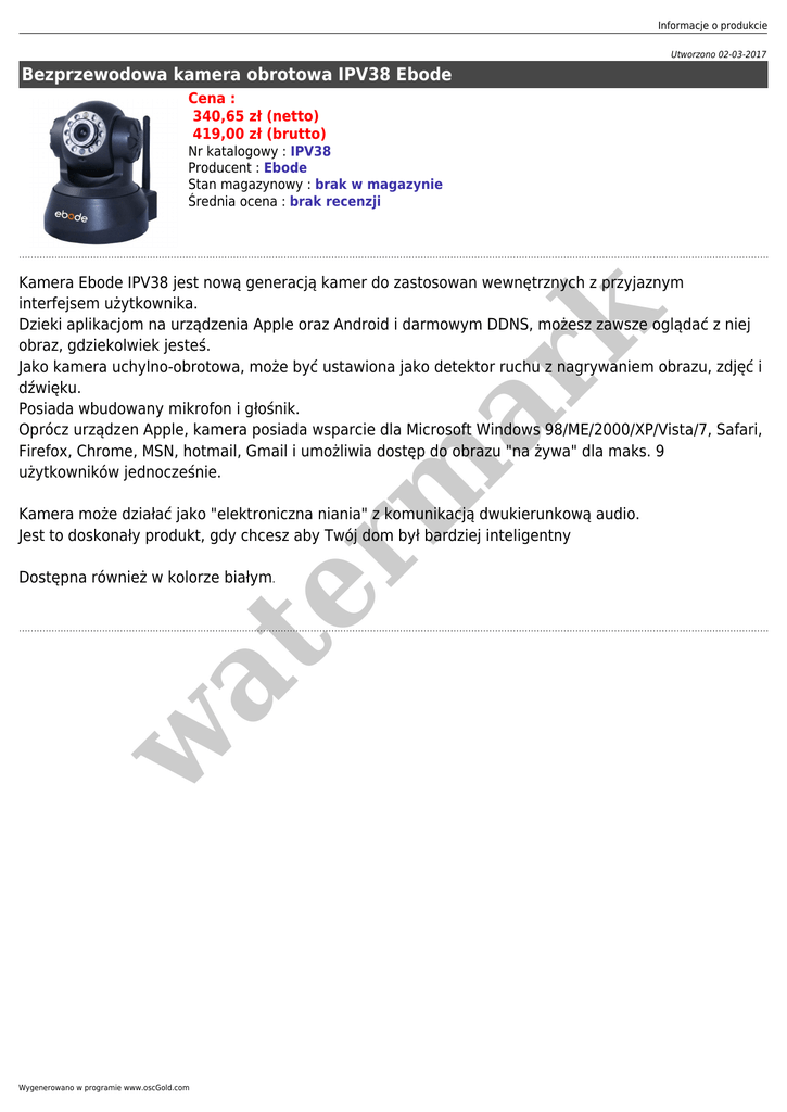 Informacje o produkcie Utworzono 02-03-2017 Bezprzewodowa kamera obrotowa IPV38 Ebode Cena : 340,65 zł (netto) 419,00 zł (brutto) Nr katalogowy : IPV38 Producent : Ebode Stan magazynowy : brak w magazynie Średnia ocena : brak recenzji er m ar k Kamera Ebode IPV38 jest nową generacją kamer do zastosowan wewnętrznych z przyjaznym interfejsem użytkownika. Dzieki aplikacjom na urządzenia Apple oraz Android i darmowym DDNS, możesz zawsze oglądać z niej obraz, gdziekolwiek jesteś. Jako kamera uchylno-obrotowa, może być ustawiona jako detektor ruchu z nagrywaniem obrazu, zdjęć i dźwięku. Posiada wbudowany mikrofon i głośnik. Oprócz urządzen Apple, kamera posiada wsparcie dla Microsoft Windows 98/ME/2000/XP/Vista/7, Safari, Firefox, Chrome, MSN, hotmail, Gmail i umożliwia dostęp do obrazu "na żywa" dla maks. 9 użytkowników jednocześnie. Kamera może działać jako "elektroniczna niania" z komunikacją dwukierunkową audio. Jest to doskonały produkt, gdy chcesz aby Twój dom był bardziej inteligentny w at Dostępna również w kolorze białym. Wygenerowano w programie www.oscGold.com