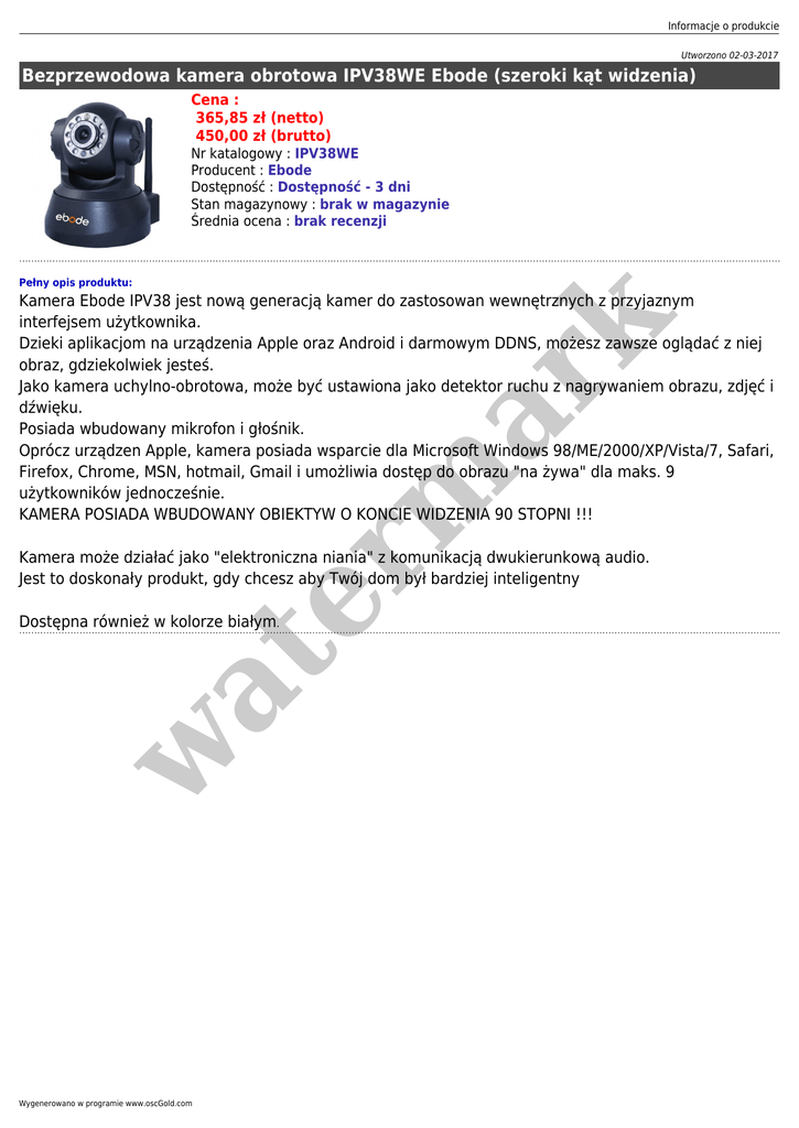 Informacje o produkcie Utworzono 02-03-2017 Bezprzewodowa kamera obrotowa IPV38WE Ebode (szeroki kąt widzenia) Cena : 365,85 zł (netto) 450,00 zł (brutto) Nr katalogowy : IPV38WE Producent : Ebode Dostępność : Dostępność - 3 dni Stan magazynowy : brak w magazynie Średnia ocena : brak recenzji Pełny opis produktu: er m ar k Kamera Ebode IPV38 jest nową generacją kamer do zastosowan wewnętrznych z przyjaznym interfejsem użytkownika. Dzieki aplikacjom na urządzenia Apple oraz Android i darmowym DDNS, możesz zawsze oglądać z niej obraz, gdziekolwiek jesteś. Jako kamera uchylno-obrotowa, może być ustawiona jako detektor ruchu z nagrywaniem obrazu, zdjęć i dźwięku. Posiada wbudowany mikrofon i głośnik. Oprócz urządzen Apple, kamera posiada wsparcie dla Microsoft Windows 98/ME/2000/XP/Vista/7, Safari, Firefox, Chrome, MSN, hotmail, Gmail i umożliwia dostęp do obrazu "na żywa" dla maks. 9 użytkowników jednocześnie. KAMERA POSIADA WBUDOWANY OBIEKTYW O KONCIE WIDZENIA 90 STOPNI !!! Kamera może działać jako "elektroniczna niania" z komunikacją dwukierunkową audio. Jest to doskonały produkt, gdy chcesz aby Twój dom był bardziej inteligentny w at Dostępna również w kolorze białym. Wygenerowano w programie www.oscGold.com