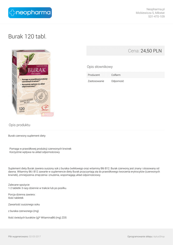 Neopharma.pl Mickiewicza 5, Mikstat 531-470-109 Burak 120 tabl. Cena: 24,50 PLN Opis słownikowy Producent Colfarm Zastosowanie Odporność Opis produktu Burak czerwony suplement diety Pomaga w prawidłowej produkcji czerwonych krwinek Korzystnie wpływa na układ odpornościowy Suplement diety Burak zawiera suszony sok z buraka ćwikłowego oraz witaminy B6i B12. Burak czerwony jest znany i stosowany od dawna. Witaminy B6 i B12 zawarte w suplemencie diety Burak przyczyniają się do prawidłowego tworzenia erytrocytów (czerwonych krwinek), zmniejszenia zmęczenia i znużenia, wspomagają układ odpornościowy. Zalecane spożycie: 1-2 tabletki 3 razy dziennie w trakcie lub po posiłku. Porcja dzienna zawiera : Ilość tabletek Zawartość suszonego soku z buraka czerwonego (mg) Ilość świeżych buraków (g)* WitaminaB6 (mg) ZDS Plik wygenerowano: 02-03-2017 Oprogramowanie sklepu: AptusShop Neopharma.pl Mickiewicza 5, Mikstat 531-470-109 Witamina B12 (μg) ZDS 1 500 3,5 0,23 17% 0,42 17% 2 1000 7 0,46 34% 0,84 34% 3 1500 10,5 0,69 50% 1,26 50% 4 2000 14 0,92 66% 1,68 66% 5 2500 17,5 1,15 83% 2,1 83% 6 3000 21 1,38 100% 2,52 100% *Orientacyjna ilość świeżych buraków potrzebna do wyprodukowania suszonego soku z buraka czerwonego. ZDS – zalecane dzienne spożycie. Nie należy przekraczać zalecanej porcji do spożycia w ciągu dnia. Masa neto 1 tabletki: 1 g Przechowywać w temperaturze pokojowej, w suchym miejscu, w sposób niedostępny dla małych dzieci. Suplement diety nie może być stosowany jako substytut (zamiennik zróżnicowanej diety i zdrowego trybu życia. Dostępne opakowania: 120 tabletek Plik wygenerowano: 02-03-2017 Powered by TCPDF (www.tcpdf.org) Oprogramowanie sklepu: AptusShop