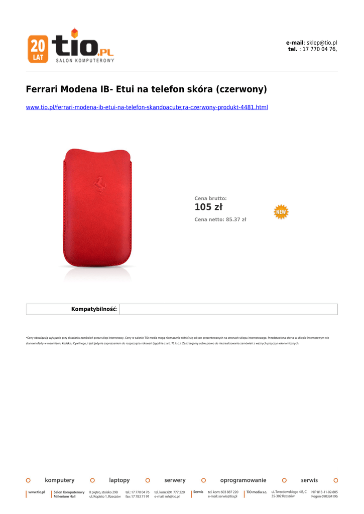 e-mail: [email protected] tel. : 17 770 04 76, Ferrari Modena IB- Etui na telefon skóra (czerwony) www.tio.pl/ferrari-modena-ib-etui-na-telefon-skandoacute;ra-czerwony-produkt-4481.html Cena brutto: 105 zł Cena netto: 85.37 zł Kompatybilność: *Ceny obowiązują wyłącznie przy składaniu zamówień przez sklep internetowy. Ceny w salonie TiO media mogą nieznacznie różnić się od cen prezentowanych na stronach sklepu internetowego. Przedstawiona oferta w sklepie internetowym nie stanowi oferty w rozumieniu Kodeksu Cywilnego, i jest jedynie zaproszeniem do rozpoczęcia rokowań (zgodnie z art. 71 k.c.). Zastrzegamy sobie prawo do niezrealizowania zamówień z ważnych przyczyn ekonomicznych.