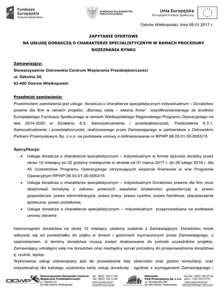 Ostrów Wielkopolski, dnia 08.01.2017 r. ZAPYTANIE OFERTOWE NA USŁUGĘ DORADCZĄ O CHARAKTERZE SPECJALISTYCZNYM W RAMACH PROCEDURY ROZEZNANIA RYNKU Zamawiający: Stowarzyszenie Ostrowskie Centrum Wspierania Przedsiębiorczości ul. Szkolna 24, 63-400 Ostrów Wielkopolski Przedmiot zamówienia: Przedmiotem zamówienia jest usługa doradcza o charakterze specjalistycznym indywidualnym – Doradztwo prawne dla firm w ramach projektu: „Biznesy robię – własna firma” współfinansowanego ze środków Europejskiego Funduszu Społecznego w ramach Wielkopolskiego Regionalnego Programu Operacyjnego na lata 2014-2020 w Działaniu 6.3. Samozatrudnienie i przedsiębiorczość, Poddziałanie 6.3.1. Samozatrudnienie i przedsiębiorczość. realizowanego przez Zamawiającego w partnerstwie z Ostrowskim Parkiem Przemysłowym Sp. z o.o. na podstawie umowy o dofinansowanie nr RPWP.06.03.01-30-0053/15 Specyfikacja: • Usługa doradcza o charakterze specjalistycznym – indywidualnym w formie dyżurów doradcy przez okres 12 miesięcy po 32 godziny miesięcznie w okresie od 01 marca 2017 r. do 28 lutego 2018 r. dla 45 Uczestników Programu Operacyjnego otrzymujących wsparcie finansowe w w/w Programie Operacyjnym RPWP.06.03.01-30-0053/15 • Usługa doradcza o charakterze specjalistycznym – indywidualnym Doradztwo prawne dla firm musi obejmować tematykę z zakresu prawnych aspektów działalności gospodarczej tj. prawo gospodarcze, prawo administracyjne, prawo pracy, prawo cywilne, prawo handlowe, ubezpieczenia społeczne, prawo podatkowe, • Usługa doradcza o charakterze specjalistycznym – indywidualnym przeprowadzana na podstawie umowy zlecenie Harmonogram doradztwa na okres 12 miesięcy ustalony zostanie z Zamawiającym. Doradztwo może odbywać się od poniedziałku do piątku w dniach i godzinach wyznaczonych przez Zamawiającego, z zastrzeżeniem, iż terminy doradztwa muszą zostać dostosowane do potrzeb uczestników projektu. Zamawiający udostępni salę ma doradztwo oraz niezbędny sprzęt potrzebny do przeprowadzenia doradztwa tj. rzutnik, laptop. Wykonawca usługi zobowiązany jest do prowadzenia listy obecności oraz godzin konsultacji, oraz indywidualnej dla każdego uczestnika karty usługi doradczej - zgodnie z wymaganiami Zamawiającego i Stowarzyszenie Ostrowskie Centrum Wspierania Przedsiębiorczości ul. Szkolna 24 63-400 Ostrów Wielkopolski tel. (062) 736-11-60 fax. (062) 736-11-60 www.ocwp.org.pl [email protected] Ostrowski tel./fax: (062) 720-47-62 Park Przemysłowy Sp. z o.o. kom.: +48 724717771 ul. Wrocławska 93F www.opp-ostrow.pl 63-400 Ostrów Wielkopolski [email protected] przedstawienia go do weryfikacji Zamawiającemu, celem uzyskania akceptacji przeprowadzonego doradztwa po zakończeniu każdego miesiąca kalendarzowego. Warunki: Doradca, który będzie świadczył usługi doradcze - powinien spełniać następujące warunki: - wykształcenie wyższe prawniczne - posiada uprawnienia do wykonywania zawodu radcy prawnego - minmum 5-letnie udokumentowane doświadczenie doradcy w doradztwie prawnym dla firm - minimalna udokumentowana liczba godzin przeprowadzonego doradztwa specjalistycznego w zakresie doradztwa prawnego dla firm - 300 godzin Wykonawca powinien posiadać niezbędne uprawnienia i zasoby niezbędne do niezakłóconej realizacji przedmiotu zamówienia, w szczególności niezbędne środki techniczno-organizacyjne, niezbędne doświadczenie, kwalifikacje oraz potencjał osobowy i finansowy. Weryfikacja powyższych warunków będzie się odbywać na podstawie oświadczenia – załącznik nr 2. Zamawiający zastrzega sobie możliwość weryfikacji powyższych warunków po wybraniu oferty. Weryfikacja powyższych warunków będzie się odbywać na podstawie dokumentów przedstawionych przez Oferenta potwierdzających powyższe warunki, w tym np. życiorys zawodowy, dokument potwierdzający uprawnienia do wykonywania zawodu radcy prawnego, wykaz doświadczenia, referencje lub inny dokument o podobnej treści. W wypadku nie wykazania spełniania powyższego warunku na wezwanie i w terminie wyznaczonym przez Zamawiającego – Zamawiający odstąpi o zawarcia umowy z Wykonawcą. W zapytaniu cenowym nie mogą brać udziału: Wykonawcy, którzy nie spełniają określonych powyżej warunków udziału w postępowaniu, tj. nie posiadają uprawnień do wykonywania określonej działalności, nie posiadają niezbędnej wiedzy i doświadczenia, bądź znajdują się w sytuacji ekonomicznej i finansowej mogącej budzić poważne wątpliwości co do możliwości prawidłowego wykonania zamówienia. Zabezpieczenie prawidłowego wykonania umowy: Zamawiający informuje, iż w celu zabezpieczenia prawidłowego wykonania umowy, Wykonawca w dniu podpisania umowy zobowiązany będzie do wystawienia na rzecz Zamawiającego weksla in blanco , który to weksel Zamawiający będzie miał prawo uzupełnić według swojego uznania na sumę odpowiadającą kwocie całkowitego zadłużenia Wykonawcy wraz z odsetkami i wszelkimi opłatami związanymi z dochodzeniem należności. Zamawiający będzie miał prawo uzupełnić weksel wszelkimi klauzulami wekslowymi przewidzianymi przez prawo wekslowe. Stowarzyszenie Ostrowskie Centrum Wspierania Przedsiębiorczości ul. Szkolna 24 63-400 Ostrów Wielkopolski tel. (062) 736-11-60 fax. (062) 736-11-60 www.ocwp.org.pl [email protected] Ostrowski tel./fax: (062) 720-47-62 Park Przemysłowy Sp. z o.o. kom.: +48 724717771 ul. Wrocławska 93F www.opp-ostrow.pl 63-400 Ostrów Wielkopolski [email protected] Zwrot dokumentów zabezpieczenia prawidłowego wykonania umowy nastąpi na pisemny wniosek Wykonawcy tylko i wyłącznie w przypadku prawidłowego wykonania umowy potwierdzonego protokołami odbioru i przekazaniem kompletu dokumentacji związanej z doradztwem wymaganej przez Zamawiającego, o której mowa w niniejszym zapytaniu ofertowym. Termin realizacji Termin przeprowadzenia usługi doradczej - od 01.03.2017 r. do 28.02.2018 r. Kryte