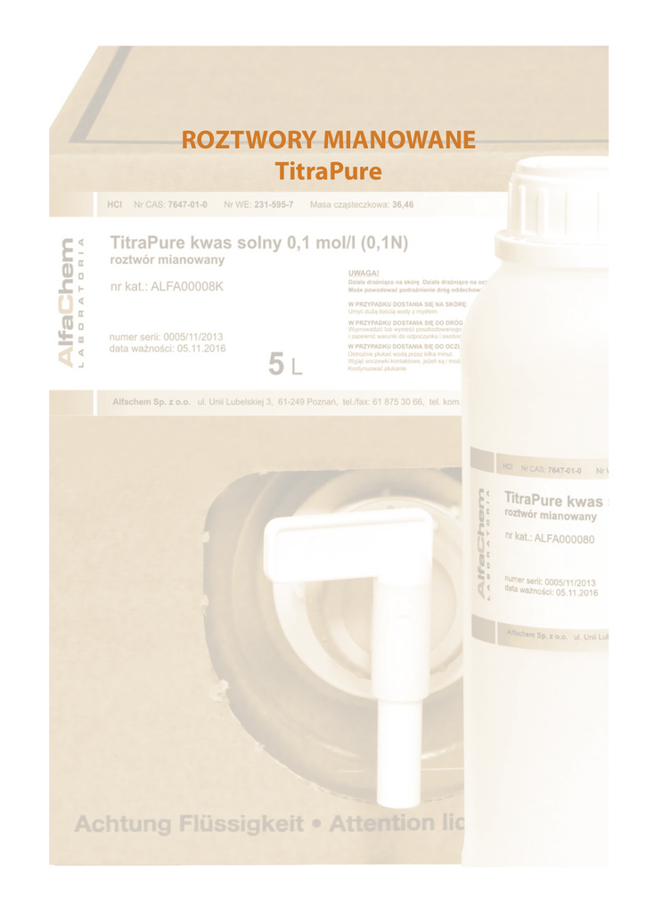 ROZTWORY MIANOWANE TitraPure 293 ROZTWORY MIANOWANE TitraPure Roztwory mianowane TitraPure asortyment TitraPure - Alfachem Sp. z o.o. opakowanie [L] TitraPure sodu tiosiarczan 0,1 mol/l roztwór mianowany rodzaj opakowania nr kat. 1 butelka HDPE ALFA000020 TitraPure sodu tiosiarczan 0,1 mol/l roztwór mianowany 5 politainer samokurczliwy z kranikiem oraz zewnętrznym opakowaniem tekturowym ALFA00002K TitraPure sodu wodorotlenek 0,1 mol/l (0,1 N) roztwór mianowany 1 butelka HDPE ALFA000030 TitraPure sodu wodorotlenek 0,1 mol/l (0,1 N) roztwór mianowany 5 politainer samokurczliwy z kranikiem oraz zewnętrznym opakowaniem tekturowym ALFA00003K TitraPure sodu wodorotlenek 0,25 mol/l (0,25 N) roztwórr mianowany 1 butelka HDPE ALFA000040 TitraPure srebra azotan 0,1 mol/l (0,1 N) roztwór mianowany 1 butelka HDPE ALFA000050 TitraPure srebra azotan 0,1 mol/l (0,1 N) roztwór mianowany 5 politainer samokurczliwy z kranikiem oraz zewnętrznym opakowaniem tekturowym ALFA00005K TitraPure di-sodu wersenian 0,05 mol/l (0,1 N) roztwór mianowany 1 butelka HDPE ALFA000060 TitraPure di-sodu wersenian 0,05 mol/l (0,1 N) roztwór mianowany 5 politainer samokurczliwy z kranikiem oraz zewnętrznym opakowaniem tekturowym ALFA00006K TitraPure kwas siarkowy (VI) 0,05 mol/l (0,1 N) roztwór mianowany 1 butelka HDPE ALFA000070 TitraPure kwas siarkowy (VI) 0,05 mol/l (0,1 N) roztwór mianowany 5 politainer samokurczliwy z kranikiem oraz zewnętrznym opakowaniem tekturowym ALFA00007K TitraPure kwas solny 0,1 mol/l (0,1 N) roztwór mianowany 1 butelka HDPE ALFA000080 TitraPure kwas solny 0,1 mol/l (0,1 N) roztwór mianowany 5 politainer samokurczliwy z kranikiem oraz zewnętrznym opakowaniem tekturowym ALFA00008K TitraPure benzetoniowy chlorek 0,004 mol/l roztwór mianowany 1 butelka HDPE ALFA000090 TitraPure potasu wodorotlenek 0,5 mol/l (0,5 N) roztwór mianowany 1 butelka HDPE ALFA000100 TitraPure potasu wodorotlenek 0,5 mol/l (0,5 N) roztwór mianowany 5 politainer samokurczliwy z kranikiem oraz zewnętrznym opakowaniem tekturowym ALFA00010K TitraPure potasu wodorotlenek 0,1mol/l (0,1N) roztwór mianowany 1 butelka HDPE ALFA000110 TitraPure potasu wodorotlenek 0,1mol/l (0,1N) roztwór mianowany 5 politainer samokurczliwy z kranikiem oraz zewnętrznym opakowaniem tekturowym ALFA00011K www.alfachem.pl [email protected] [email protected] 295