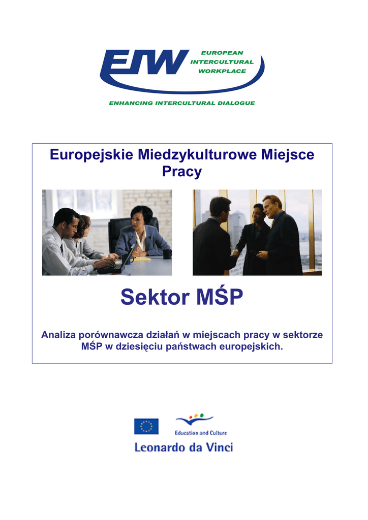 Europejskie Miedzykulturowe Miejsce Pracy Sektor MŚP Analiza porównawcza działań w miejscach pracy w sektorze MŚP w dziesięciu państwach europejskich. Spis Treści Spis treści ...................................................................... ..Fel! Bokmärket är inte definierat. Podziękowania ….……………………………………………………………………………......ii Przedmowa ……………………………………………………………………………………..........iii 1. 1.1 1.2 1.3 1.4 2. 3. 4. 5. 5.1 5.2 5.3 5.4 6. 6.1 6.2 6.3 6.4 6.5 6.6 6.7 6.7 7. 8. Wstęp ................................................................................................ …………….….1 Definicja MŚP …………………………………………………………………. 1 Cele raportu MŚP ....................................................................................................... 2 Metodologia ............................................................................................................... 2 Struktura raportu MŚP............................................................................................... 3 Stan obecny ……………………. ……………………………………………………....…. 4 Ustawodawstwo ......................................................................................................... 6 Akredytacja kwalifikacji ………………………………………………………..……….... 7 Główne problemy / wyzwania ………………………………………………..…………... 7 Komunikacja międzykulturowa …………………………………………………………… 7 Wartości i praktyka kulturowa …………………………………………………………… 11 Relacje ze współpracownikami ………………………………… …………..........…12 Dyskryminacja ……………………………………………………………………………...14 Dobra praktyka ………………………………………………………………………….... 16 Rozwijanie zdolności językowych ………………………………………………….. 16 Wartości i praktyki kulturowe ………………………………………………….…..... 16 Szkolenia zawodowe ……………………………………………………………….…18 Relacje ze współpracownikami ………………………………………………………...... 18 Umiejętności międzykulturowe …………………………………………………………... 19 Dyskryminacja ………………………………………………………………………… 19 Odpowiedź społeczności biznesowej …………………………………………….. 20 Integracja w Kraju Przyjmującym …………………………………………………...20 Potrzeby szkoleniowe …………………………….……………………………………… 21 Konkluzje i sugestie ………………………........................……………..…………….. 22 Tabela 1 Kryteria UE definiujące małe i średnie przedsiębiorstwa ………………………... 2 Tabela 2 Badane przypadki…………………..…………………………………………………... 2 -i- Podziękowania Poniższy raport o sektorze MŚP jest produktem stworzonym przez partnerów w ramach projektu Europejskie Międzykulturowe Miejsce Pracy (EIW), mianowicie: Dublin City University z Irlandii; European Centre for Education and Training (ECET) z Bułgarii ; Institut für Projektbegleitung und Kompetenzentwicklung - Pro-Kompetenz z Niemiec; Hellenic Regional Development Center (HRDC) z Grecji; Västra Nylands folkhögskola z Finlandii; CONFORM - Consorzio Formazione Managerialez Włoch; Mangfold i Arbeidslivet – MiA z Norwegii; Wyższą Szkołę Humanistyczno – Ekonomiczną w Łodzi z Polski; Göteborg University ze Szwecji; University of Westminster z Wielkiej Brytanii. Partnerzy EIW ogromnie dziękują za fundusze na niniejszy projekt otrzymane ze Wspólnoty Europejskiej w ramach programu Leonardo da Vinci II. Zawartość raportu o sektorze MŚP została zaczerpnięta przede wszystkim z raportów narodowych przygotowanych przez każdą z instytucji partnerskich, uzupełniona o dodatkowe badania oraz źródła tam gdzie to konieczne. Grupa robocza złożona z pracowników z czterech instytucji partnerskich przygotowała transnarodową analizę, zaprojektowała oraz opracowała Raporty Sektorowe, mianowicie: Aileen Pearson-Evans oraz Frieda McGovern (DCU), Boian Satchev (ECET), Radu Szekeley (Västra Nylands) oraz Brunella Maio i Andrea Marello (Conform). Chcielibyśmy podziękować wszystkim osobom oraz instytucjom które przyczyniły się do pracy partnerstwa, w tym naszym badaczom i partnerom społecznym, którzy pomagali nam w przeprowadzeniu studium przypadków, a następnie asystowali przy ocenie oraz dyseminacji naszych badań. Raport ten został przygotowany, opracowany, napisany i zredagowany przez włoski zespół CONFORM: Bunella Maio i Andrea Marello, oraz Barry Tomalin z University of Westminster. Copyright © 2007 Copyright © 2007 European Intercultural Workplace (EIW) Project partnership. Wszelkie prawa zastrzeżone. Kopiowanie i dystrybucja niniejszej publikacji lub jej części jest autoryzowana, za wyjątkiem wykorzystań komercyjnych, pod warunkiem, że partnerzy Projekt EIW zostaną wymienieni jako źródło. Projekt został współfinansowany ze środków Wspólnoty Europejskiej. Zawartość tego projektu nie musi odzwierciedlać stanowiska Wspólnoty Europejskiej. Wspólnota Europejska nie ponosi odpowiedzialności za prezentowane treści. - ii - Przedmowa Europejskie miejsca pracy przechodzą obecnie ogromne transformacje. Zmiany ekonomiczne i polityczne w Europie na przestrzeni ostatnich dziesięcioleci doprowadziły do d