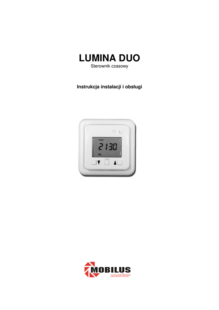 LUMINA DUO Sterownik czasowy Instrukcja instalacji i obsługi Uwagi dotycz ce bezpiecze stwa • • • Po rozpakowaniu urz dzenia nale y sprawdzi czy w transporcie nie wyst piły na nim adne uszkodzenia. Je li tak, nale y niezwłocznie poinformowa o tym dostawc . Przed u yciem nale y dokładnie przeczyta instrukcj obsługi. Sterownik LUMINA DUO nale y zasila napi ciem 23OV~, 50Hz. Dlatego jego instalacja powinna by dokonywana wył cznie przez osoby z uprawnieniami elektrycznymi wg zał czonego schematu elektrycznego zgodnie ze wszelkimi obowi zuj cymi przepisami. Wprowadzenie Opakowanie LUMINA DUO zawiera nast puj ce elementy: 1. 2. 3. 4. Korpus podstawowy (sterownik z wy wietlaczem). Ramka monta owa korpusu podstawowego z zaciskami. Ramka ozdobna. Puszka natynkowa (opcja) Rys.1 Budowa sterownika LUMINA DUO Opis funkcji LUMINA DUO słu y do sterowania r cznego lub automatycznego nap dami elektrycznymi do zasłon zwijanych tj. rolet, bram, markiz i aluzji. Liczne funkcje mo na ustawia indywidualnie według własnych potrzeb. 1. Tryb pracy dobowej Program dobowy (takie same czasy podnoszenia i opuszczania dla ka dego dnia tygodnia), praca skokowa, funkcja urlopowa (generator przypadkowo ci), przeł czanie czas zimowy / czas letni, styki bezpotencjałowe, mo liwo podł czenia czujnika słonecznego i czujnika zmierzchowego. 2. Tryb pracy tygodniowej Dwa programy tygodniowe (mo liwo zaprogramowania do 2 czasów podnoszenia i 2 czasów opuszczania ka dego dnia tygodnia), praca skokowa, funkcja urlopowa (generator przypadkowo ci), przeł czanie czas zimowy / czas letni, styki bezpotencjałowe, mo liwo podł czenia czujnika słonecznego i czujnika zmierzchowego. Rys. 2 Opis przycisków i klawiszy Dane techniczne Napi cie zasilania Napi cie zał czania Pr d (obci enie pr dowe) Czas trwania impulsu Zakres dopuszczalnych temperatur pracy Czas zachowania ustawie w pami ci Stopie ochrony Klasa ochrony 230V∼, 50Hz 250V∼ 6A, cosφ=1 max 150 sek. -5°C do +45°C min. 8 godz. IP40 II 2 Wybór trybu pracy (tygodniowy lub dobowy) Gniazdo wtykowe SD (dla czujników słonecznego i zmierzchowego) jest fabrycznie za lepione za lepk z mostkiem elektrycznym. Z tak za lepk sterownik LUMINA DUO pracuje w trybie pracy dobowej. Aby przej do trybu pracy tygodniowej nale y usun mostek w za lepce lub wyci gn za lepk . Ustawienia fabryczne Rys. 3 Wybór trybu pracy Po naci ni ciu przycisku RESET sterownik powraca do nast puj cych ustawie fabrycznych: 1. Tryb pracy dobowej program dobowy GÓRA 07:00, DÓŁ 21:00 funkcja słoneczna wł czona (gdy czujnik jest podł czony; ustawiona na warto redni ) funkcja zmierzchowa wł czona (gdy czujnik jest podł czony; ustawiona na warto redni ) aktualny czas zimowy, godzina 20:00 2. Tryb pracy tygodniowej program tygodniowy 1 program tygodniowy 2 GÓRA wył czony, DÓŁ wył czony funkcja słoneczna wł czona (gdy czujnik jest podł czony; ustawiona na warto funkcja zmierzchowa wł czona (gdy czujnik jest podł czony; ustawiona na warto redni ) aktualny czas zimowy, poniedziałek, godzina 20:00 redni ) Wybór opcji pracy r cznej lub automatycznej Sterownik LUMINA DUO ma mo liwo wyboru, przy pomocy przycisku mode, opcji sterowania r cznego lub automatycznego. 1. Tryb pracy dobowej - 3 tryby pracy do wyboru: sterowanie r czne automatyka 1 (program dobowy) automatyka 1 + generator przypadkowo ci Rys. 4 Wy wietlacz w trybie pracy dobowej 2. Tryb pracy tygodniowej - 7 trybów pracy do wyboru: sterowanie r czne automatyka 1 (program tygodniowy 1) automatyka 2 (program tygodniowy 2) automatyka 1 + 2 automatyka 1 + generator przypadkowo ci automatyka 2 + generator przypadkowo ci automatyka 1 + 2 + generator przypadkowo ci Rys. 5 Wy wietlacz w trybie pracy tygodniowej 3 Sterowanie r czne. Aby aktywowa opcj sterownia r cznego, nale y naciska przycisk mode a do pojawienia si na wy wietlaczu napisu (man). Wszystkie funkcje automatyczne, ł cznie z funkcj zmierzchow i słoneczn s aktualnie niedost pne. Przyciskaj c klawisz góra lub klawisz dół dłu ej ni 1 sek., roleta zostanie podniesiona lub odpowiednio opuszczona. Aby zatrzyma rolet nale y ponownie nacisn klawisz lub nacisn klawisz przeciwstawny tzn.: • roleta podnosi si - przycisn klawisz dół, • roleta opuszcza si - przycisn klawisz góra Dalsze podnoszenie lub opuszczanie rolety jest mo liwe po ponownym naci ni ciu klawisza góra lub odpowiednio klawisza dół. Czynno ci te gwarantuj ustawienie rolety w dowolnej pozycji. Sterowanie automatyczne. Gdy aktywowana jest opcja sterownia automatycznego, roleta jest opuszczana i podnoszona zgodnie z aktualnie zaprogramowanymi ustawieniami czasowymi oraz sygnałami z czujników słonecznego i zmierzchowego (w przypadku podł czenia czujnika SD). W dalszym ci gu istnieje jednak mo liwo podnoszenia i opuszczania rolet poza zaprogramowanymi ustawieniami czasowymi, naciskaj c i przytrzymuj c przez chwil klawisz góra lub odpowiednio klawisz dół (nie zakłóca to zaprogramowanych ustawie ). Przyciskaj c klawisz góra lub klawisz dół dłu ej ni 1 sek., roleta zostanie podniesiona lub odpowiednio opuszczona. Aby zatrzyma rolet nale y ponownie nacisn klawisz lub nacisn klawisz przeciwstawny tzn.: • roleta podnosi si - przycisn klawisz dół, • roleta opuszcza si - przycisn klawisz góra. Dalsze podnoszenie lub opuszczanie rolety jest mo liwe po ponownym naci ni ciu klawisza góra lub odpowiednio klawisza dół. Opcja sterowania automatycznego mo e by równie wył czona na dłu szy czas. W tym celu wystarczy ustawi opcj sterowania r cznego (man). Po ponownym wł czeniu opcji sterowania automatycznego zostaje wykonany ostatni rozkaz programowy, który sterownik LUMINA DUO miał wykona przy ustawieniu tej opcji. To samo dzieje si po ponownym wł czeniu napi cia w sieci, w przypadku wcze niejszego jego zaniku. Generator przypadkowo ci. Generator przypadkowo ci generuje tzw. czas przypadkowo ci. Powoduje on, e rolety podnosz si i opuszczaj z losowym odchyleniem od 1 do 31 minut od zaprogr
