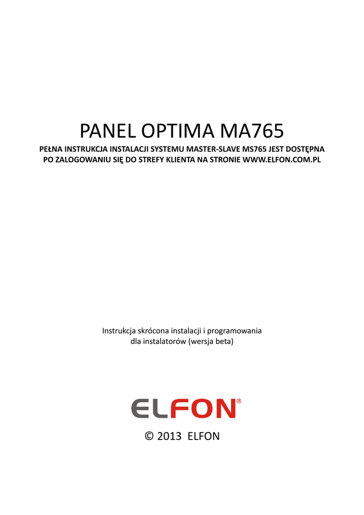 PANEL OPTIMA MA765 PEŁNA INSTRUKCJA INSTALACJI SYSTEMU MASTER-SLAVE MS765 JEST DOSTĘPNA PO ZALOGOWANIU SIĘ DO STREFY KLIENTA NA STRONIE WWW.ELFON.COM.PL Instrukcja skrócona instalacji i programowania dla instalatorów (wersja beta) © 2013 ELFON 1 Informacje ogólne Niniejsza instrukcja zawiera jedynie podstawowe informacje o panelu Optima MA765. Pełna instrukcja „Instrukcja obsługi, instalacji i programowania do systemu Optima MS765” jest dostępna pod adresem www.elfon.com.pl (Strefa klienta). 2 Panel MA765 Panele MA765 nie mogą pracować samodzielnie jako urządzenia w systemie domofonowym, mogą współpracować jedynie z panelami SL255 oraz z modułami komunikacyjnymi OP-H4MS tworząc system MS765. Do paneli MA765 nie wolno podłączać bezpośrednio unifonów. 3 System MS765 System MS765 (z wykorzystaniem paneli MA765) umożliwia zbudowanie instalacji domofonowej, w której istnieją wejścia nadrzędne (panele MA765), z których można zainicjować połączenie z każdym unifonem w systemie) oraz wejścia podrzędne (panele SL255) które umożliwiają komunikację z lokalną linią unifonów, która składa się z maksymalnie 255 unifonów połączonych równolegle za pomocą przewodu dwużyłowego. Przykładowa struktura instalacji domofonowej, w której użyty może być system MS765 znajduje się na ilustracji 1. Maksymalna liczba lokali obsługiwanych przez system wynosi 765. Do pojedynczej lokalnej linii unifonów można podłączyć do czterech paneli slave. System daje możliwość instalacji 15 lokalnych linii unifonów. W tabeli nr 1 zostały zebrane informacje dotyczące możliwości systemu. Maksymalna sumaryczna liczba lokali 765 Maksymalna liczba wejść nadrzędnych (master) 4 Maksymalna liczba wejść podrzędnych (slave) 60 Maksymalna liczba lokalnych linii unifonów (LU) 15 Maksymalna liczba lokali na jedną LU 255 Maksymalna liczba wejść podrzędnych (slave) związanych z lokalną LU 4 Tabela 1: Możliwości systemu MS765 2 Ilustracja 1: Przykładowa instalacja systemu MS765 4 Montaż mechaniczny urządzeń • Montaż Ilustracja 2: Zalecana wysokość montażu 3 Panel należy zamontować na ścianie budynku, ewentualnie słupku, wykorzystując obudowy natynkowe lub podtynkowe tak, by zminimalizować działanie niekorzystnych czynników atmosferycznych. Zalecany jest montaż na takiej wysokości, by korzystać z niej mogły także dzieci i osoby niepełnosprawne. • Montaż podtynkowy panelu W ścianie należy wykon1ać taki otwór aby część podtynkowa swobodnie w nim leżała zwracając uwagę aby wykuty otwór nie był za duży a jego brzegi były maskowane przez ramkę znajdującą się dookoła obudowy podtynkowej. Poprzez tylny otwór wprowadzić przewody przyłączeniowe. Obudowę należy przykręcić przy pomocy 4 wkrętów zwracając uwagę przy dociąganiu śrub aby nie przekrzywić ramki. W przypadku montażu podtynkowego z dodatkowymi modułami należy ramki połączyć za pomocą łącznika poziomego,pionowego lub obu z nich jeśli stosujemy kilka modułów. • Montaż natynkowy panelu Obudowę natynkową należy przykręcić do płaskiej powierzchni słupka lub innego elementu konstrukcyjnego przy pomocy wkrętów uprzednio wprowadzając przewody łączeniowe przez tylną ściankę obudowy. Należy zwrócić szczególną uwagę aby otwory przez które może dostać się woda zostały uszczelnione za pomącą np. silikonu itp. Nie należy uszczelniać otworów w dolnej części obudowy, gdyż ich konstrukcja umożliwia swobodne wydostanie się wody która może wpłynąć do obudowy. • Montaż modułów OP-H4MS oraz zasilaczy Moduły oraz zasilacze należy zamontować w miejscach nie narażonych na bezpośrednie oddziaływanie wody. Najlepszym miejscem montażu są klatki ,piwnice ,skrzynki elektryczne itp. Należy zapewnić takie miejsce aby do urządzeń nie miały dostępu osoby niepowołane .Przy planowaniu montażu zasilaczy i modułów należy tak zaplanować rozmieszczenie ich aby odległości pomiędzy wszystkimi urządzeniami zapewniały optymalne odległości połączeń zasilających ,oraz linii unifonów i magistrali ISB. 4 5 Podłączenie Optima MA765 Ilustracja 3: Widok zacisków panelu Panel posiada szereg złącz wykorzystywanych w zależności od stopnia rozbudowania systemu. Na ilustracji 5 przedstawiono widok wyprowadzeń panelu MA765. Ich opis znajduje się w tabeli nr 2. Nazwa ~ ~ EZ~ EZ~ EZN EZP NO CON Opis Zacisk zasilania napięciem zmiennym Zacisk zasilania napięciem zmiennym Zacisk zmiennoprądowy elektorzaczepu Zacisk zmiennoprądowy elektor-zaczepu Zacisk elektrozaczepu, „-” przy stałej polaryzacji Zacisk elektrozaczepu, „+” przy stałej polaryzacji Przekaźnik (styk) Przekaźnik Nazwa VG+ VGIS+ ISGND Opis GND Zacisk masy LU GND KE Zacisk linii unifonów do mieszkań Zacisk masy Zewnętrzne wyzwalanie (rygla lub przekaźnika) Zacisk interfejsu szeregowego (+) Zacisk interfejsu szeregowego (-) Zacisk masy Tabela 2: Opis złącz zewnętrznych panelu Na ilustracji nr 6 przedstawiono sposób podłaczenia dodatkowych urządzeń do panelu MA765. Więcej informacji dotyczących programowania, obsługi wyjść urządzenia – patrz Instrukcja obsługi, instalacji i programowania do systemu Optima MA765. 5 Ilustracja 4: Struktura przykładowej instalacjii systemu MS765 ! Maksymalne wartości prądów i napięć nie powinny przekraczać: 1A 24VAC/DC 6 Zasilanie Optima MA765 Do połączenia panelu Optima z zasilaczem zaleca się użycie przewodu dwużyłowego o przekroju żyły >1mm2. Długość przewodu zasilającego nie powinna przekraczać wartości zebranych w poniższej tabeli przy zasilaniu zasilaczem AC20 lub AC40 (dostępny w ofercie firmy ELFON). Jeśli długość przewodów zasilających jest większa konieczne jest zwiększenie napięcia zasilacza panela, pamiętając aby nie przekroczyć 15VAC na zaciskach panelu Optima. W tabeli nr 3 przedstawione zostały najważniejsze dane techniczne Optim