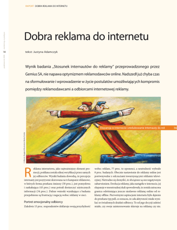 Dobra reklama do internetu 18 tekst: Justyna Adamczyk październik 2009 marketing w praktyce raport Dobra reklama do internetu Wynik badania „Stosunek internautów do reklamy” przeprowadzonego przez Gemius SA, nie napawa optymizmem reklamodawców online. Nadszedł już chyba czas na sformułowanie i wprowadzenie w życie postulatów umożliwiających kompromis pomiędzy reklamodawcami a odbiorcami internetowej reklamy. © Alberto Ruggieri/Illustration Works/Corbis Ekspansja w internecie i zredukowanie internauty do roli R eklama internetowa, jako najważniejszy element promocji, poddana została silnej weryfikacji przez samych jej odbiorców. Wyniki badania dowodzą, że percepcja internauty jest pozytywnie skierowana na te kampanie reklamowe, w których forma przekazu śmieszy (50 proc.), jest pomysłowa i zaskakująca (45 proc.) oraz potrafi dostarczyć użytecznych informacji (34 proc.). Dalsze wnioski wynikające z badania przepełnione są frustracją i negacją wobec reklamy w sieci. Portret emocjonalny odbiorcy Zaledwie 15 proc. respondentów deklaruje swoją przychylność wobec reklam, 77 proc. to oponenci, a neutralność wybrało 8 proc. badanych. Obecnie nastawienie do reklamy online jest porównywalne z odczuciami towarzyszącymi reklamie telewizyjnej. Nietrudno się domyślić, że obciążone są one negatywnym zabarwieniem. Ewolucja reklamy, jaka nastąpiła w internecie, jej ekspansja w monstrualnej skali spowodowały, że została zatracona granica odróżniająca jeszcze niedawno reklamę online od reklamy offline. Pierwotnymi aspiracjami internetu było dążenie do przekazu typ pull, co oznacza, że cała aktywność miała wynikać ze świadomych działań odbiorcy. To od jego decyzji zależeć miało, czy swoje zainteresowanie skieruje na reklamę czy nie. bie Ogólny stosunek internautów do reklam internetowych Żadne z powyższych Lubię czytać/oglądać/słuchać reklam w tym medium Czuję, że reklamy w tym medium są skierowane do mnie Reklamy w tym medium dostarczają rozrywki Reklamy w tym medium mają często walory artystyczne Reklamy w tym medium dostarczają informacji o produktach/usługach Reklamy w tym medium są głupie 7% 8% 19 11% październik 2009 1 marketing w praktyce Dobra reklama do internetu raport 14% 17% 30% 36% 50% Reklamy w tym medium sprawiają, że tracę czas 52% Reklamy w tym medium mnie rozpraszają Reklamy w tym medium są irytujące 53% Reklamy w tym medium utrudniają odbiór innych treści (filmów, muzyki, artykułów itp.) 53% Czuję się przymuszony do odbierania reklam w tym medium 58% N = 1000 – wszyscy respondenci; Dane nie sumują się do 100%, gdyż badani mogli zaznaczyć więcej niż jedną odpowiedź. Źródło: „Stosunek internautów do reklamy”, gemiusReport, lipiec 2009 r. ernego odbiorcy reklam przyczyniło się do ich znienawidzenia. Badanie Gemius ujawniło cechy tych reklam, które irytują odbiorców Obecnie ta forma przekazu została zatracona. Internet jest także medium typu push, co oznacza, że wszelkie sieciowe inicjatywy, z reklamą na czele, są agresywnie kierowane do użytkowników. Ekspansja reklam emitowanych w internecie i zredukowanie internauty do roli biernego odbiorcy przyczyniło się do tego, że rynek tej reklamy został znienawidzony. Badanie Gemius ujawniło te cechy reklamy internetowej, które najsilniej irytują odbiorców. Z raportu można się dowiedzieć, że: ▶internauci nie mają pewności, do jakiej strony zostaną skierowani po interakcji z reklamą (np. po kliknięciu w baner), ▶reklamy zdominowały przekaz w nadmiernym stopniu, ▶kreacje rozpraszają i są irytujące, przez co utrudniają odbiór treści, ▶użytkownicy sieci czują się przymuszani do kontaktu z reklamą, ▶kontakt z reklamą zajmuje za dużo czasu. Najsilniejszym zaś powodem niechęci użytkowników sieci wobec reklam internetowych jest: celowe utrudnianie zamknięcia obiektu reklamowego (60 proc. wskazań), zasłanianie treści przez inwazyjne formy reklamy (60 proc. odpowiedzi), automatyczna aktywacja reklamy wideo (49 proc. deklaracji) oraz natychmiastowe uruchamianie materiałów audio (38 proc. wskazań) przy każdorazowym wejściu na stronę. Kompromis – pod jakimi warunkami Obecność reklam internauci traktują jako „zło konieczne”, zdając sobie sprawę z faktu, że przychody z reklam wspierają działalność wielu serwisów internetowych. Istnieje grupa ankietowanych, która wykazała gotowość na płatny dostępu do serwisów pozbawionych reklam, jednak takiej deklaracji dokonał tylko co szósty ankietowany. Natomiast wszyscy badani zgodnie potwierdzili, że gdyby istniała opcja korzystania ze stron bez reklam przy niewielkiej opłacie dołączonej do rachunku operatora sieciowego, natychmiast skorzystaliby z tej możliwości. Deklaracja ta mogłaby się urzeczywistnić jedynie wtedy, gdy kwota ta nie przekroczyłaby 2 zł. Przy wyższej taryfie krąg zwolenników uległby 8 zmniejszeniu. raport Dobra reklama do internetu marketing w praktyce 8 październik 2009 20 Deklarowane przez internautów gratyfikacje są zbyt skromne, aby zapewnić stronom internetowym fachowe wsparcie. Wartościowy serwis wymaga zaangażowania wielu specjalistów, co jednoznaczne jest z wysokim budżetem. Odpowiedzią na zaistniałą sytuację mogą być następujące wyjścia: ▶Zmiana nastawienia do reklam przez użytkowników internetu. ▶Zwiększenie tolerancji i zrozumienie zasad rządzących rynkiem reklamy online. Oparcie swojego działania na zasadach wzajemności, czyli działanie w myśl zasady: „Jeśli korzystasz z darmowych, wartościowych zasobów internetu, wykaż się otwartością na reklamy”. Pozytywna postawa i zadowolenie właściciela strony może wzmocnić efekt synergii. ▶Akceptowanie i szanowanie przez reklamodawców preferencji odbiorców reklam. ▶Aby nie unicestwiać i tak już chwiejnego zaufania wobec reklam, agencje powinny skupić swoje wysiłki na precy