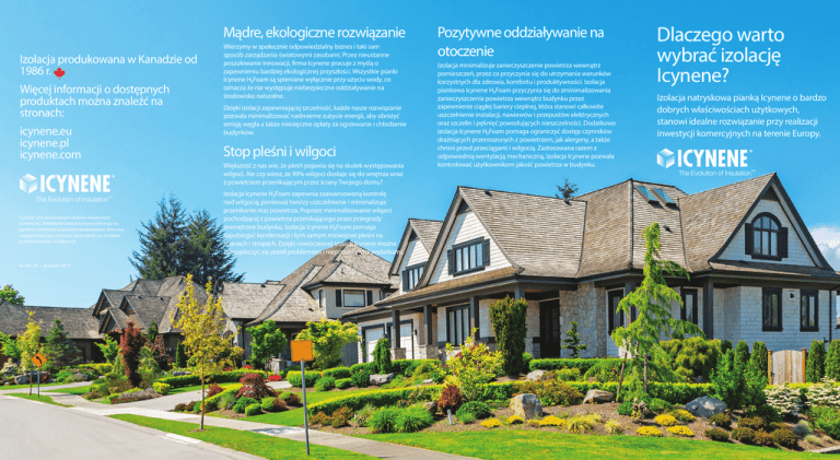 Mądre, ekologiczne rozwiązanie Izolacja produkowana w Kanadzie od 1986 r. Więcej informacji o dostępnych produktach można znaleźć na stronach: icynene.eu icynene.pl icynene.com The Evolution of Insulation™ Icynene® jest zastrzeżonym znakiem towarowym Icynene Inc. Nakładanie izolacji Icynene wykonuje się zgodnie z lokalnymi przepisami budowlanymi. Końcowy wygląd izolacji po nałożeniu może różnić się od efektu przedstawionego na zdjęciach. SL-303_PL • grudzień 2015 Wierzymy w społecznie odpowiedzialny biznes i taki sam sposób zarządzania światowymi zasobami. Przez nieustanne poszukiwanie innowacji, firma Icynene pracuje z myślą o zapewnieniu bardziej ekologicznej przyszłości. Wszystkie pianki Icynene H₂Foam są spieniane wyłącznie przy użyciu wody, co oznacza że nie występuje niebezpieczne oddziaływanie na środowisko naturalne. Dzięki izolacji zapewniającej szczelność, każde nasze rozwiązanie pozwala minimalizować nadmierne zużycie energii, aby obniżyć emisję węgla a także miesięczne opłaty za ogrzewanie i chłodzenie budynków. Stop pleśni i wilgoci Większość z nas wie, że pleśń pojawia się na skutek występowania wilgoci. Ale czy wiesz, że 99% wilgoci dostaje się do wnętrza wraz z powietrzem przenikającym przez ściany Twojego domu? Izolacja Icynene H₂Foam zapewnia zaawansowaną kontrolę nad wilgocią, ponieważ tworzy uszczelnienie i minimalizuje przenikanie mas powietrza. Poprzez minimalizowanie wilgoci pochodzącej z powietrza przenikającego przez przegrody zewnętrzne budynku, izolacja Icynene H₂Foam pomaga zapobiegać kondensacji i tym samym rozwojowi pleśni na ścianach i stropach. Dzięki nowoczesnej izolacji Icynene można zabezpieczyć się przed problemami i niepotrzebnymi wydatkami. Pozytywne oddziaływanie na otoczenie Izolacja minimalizuje zanieczyszczenie powietrza wewnątrz pomieszczeń, przez co przyczynia się do utrzymania warunków korzystnych dla zdrowia, komfortu i produktywności. Izolacja piankowa Icynene H₂Foam przyczynia się do zminimalizowania zanieczyszczenia powietrza wewnątrz budynku przez zapewnienie ciągłej bariery cieplnej, która stanowi całkowite uszczelnienie instalacji, nawiewów i przepustów elektrycznych oraz szczelin i pęknięć powodujących nieszczelności. Dodatkowo izolacja Icynene H₂Foam pomaga ograniczyć dostęp czynników drażniących przenoszonych z powietrzem, jak alergeny, a także chroni przed przeciągami i wilgocią. Zastosowana razem z odpowiednią wentylacją mechaniczną, izolacja Icynene pozwala kontrolować użytkownikom jakość powietrza w budynku. Dlaczego warto wybrać izolację Icynene? Izolacja natryskowa pianką Icynene o bardzo dobrych właściwościach użytkowych, stanowi idealne rozwiązanie przy realizacji inwestycji komercyjnych na terenie Europy. The Evolution of Insulation™ Pantone 2935 C Pantone 376 C Porównanie produktów Czas na nową generację izolacji! Natryskowa izolacja piankowa Icynene H₂Foam ma specjalną formułę, dostosowaną do określonych wymagań każdej inwestycji. Skład izolacji zapewnia ponadprzeciętny komfort cieplny i szczelność. Rozwiązania dostępne w ramach izolacji Icynene idealnie nadają się do zastosowania na różnych podłożach, dając pewność wyboru produktu o wysokiej jakości, dostarczanego przez wiodącą firmę w branży. Dzięki niezwykle dużej izolacyjności, doskonałemu przyleganiu i konkurencyjnie dużej wydajności, izolacja H₂Foam Lite Plus jest po prostu najlepszym wyborem w klasie produktów izolacyjnych o strukturze otwartokomórkowej na rynku. H₂Foam Lite Plus pozwala uzyskać lepsze parametry niż określono w najnowszych przepisach budowlanych, obowiązujących dla budynków mieszkalnych i obiektów usługowo-handlowych. W odróżnieniu od innych globalnych producentów oferujących szeroki asortyment materiałów budowlanych, nasza firma skupia się na izolacji natryskowej pianką, przez co oferujemy produkty najwyższej jakości i pozostajemy liderami innowacji w branży. • • • • ntone 2935 C ntone 376 C H₂Foam Lite jest produktem, który sprawił, że nazwa Icynene jest tożsama z natryskową izolacją piankową o ponadprzeciętnej jakości. Od roku 1986 izolację zastosowano już w tysiącach budynków mieszkalnych i obiektach usługowo-handlowych, niezmiennie wykraczając poza standard tradycyjnej izolacji. Materiał o strukturze otwartokomórkowej i małej gęstości zapewnia szereg korzyści odczuwalnych natychmiast, jak i w dłuższej perspektywie czasu. • • • • • • Struktura otwartokomórkowa, mała gęstość (ok 8 kg/m³) Materiał spieniany wyłącznie wodą Posiada oznakowanie CE Nie zawiera chlorofluorowęglowodorów (HCFC), hydrofluoroalkanów (HFA), węglowodoru fluoru (HFC) ani formaldehydu Poddana niezależnym badaniom dla klasy „A+” zgodnie z normą ISO 16000-9 Zalecana przez Europejskie Stowarzyszenie Ochrony Przed Chorobami Środowiskowymi i Przewlekłymi Zatruciami • Pantone 2935 C Pantone 376 C Struktura otwartokomórkowa, mała gęstość (ok 11 kg/m³) Zapewnia podwyższone przewodnictwo cieplne Posiada oznakowanie CE Izolacja spieniana wyłącznie wodą (brak substancji z grupy HFC) Idealne rozwiązanie do nakładania na różne podłoża, w warunkach zmiennej temperatury i wilgotności Pierwsza na świecie, spieniana wyłącznie wodą, sztywna izolacja piankowa o średniej gęstości. H₂Foam Forte nie zawiera syntetycznych środków spieniających i zapewnia najniższy współczynnik ocieplenia globalnego (GWP = 1). Izolacja H₂Foam Forte jest idealnym rozwiązaniem do zastosowania w obiektach usługo-handlowych i budynkach mieszkalnych. • • • • • • • • • • • Nie zawiera środków porotwórczych powodujących uszkodzenie warstwy ozonowej – izolacja spieniana wyłącznie wodą Nie zawiera fluorowęglowodorów (HFC) – brak szkodliwych gazów Nie zawiera polibromowanych eterów dife