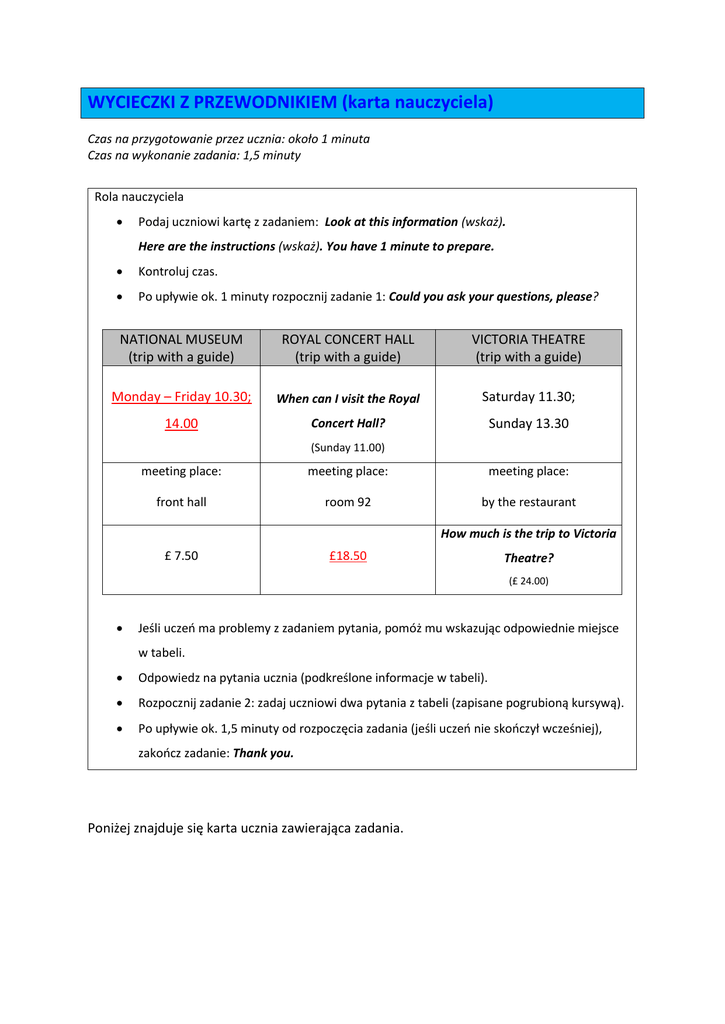 WYCIECZKI Z PRZEWODNIKIEM (karta nauczyciela) Czas na przygotowanie przez ucznia: około 1 minuta Czas na wykonanie zadania: 1,5 minuty Rola nauczyciela Podaj uczniowi kartę z zadaniem: Look at this information (wskaż). Here are the instructions (wskaż). You have 1 minute to prepare. Kontroluj czas. Po upływie ok. 1 minuty rozpocznij zadanie 1: Could you ask your questions, please? NATIONAL MUSEUM (trip with a guide) ROYAL CONCERT HALL (trip with a guide) VICTORIA THEATRE (trip with a guide) Monday – Friday 10.30; When can I visit the Royal Saturday 11.30; 14.00 Concert Hall? Sunday 13.30 (Sunday 11.00) meeting place: meeting place: meeting place: front hall room 92 by the restaurant How much is the trip to Victoria £ 7.50 £18.50 Theatre? (£ 24.00) Jeśli uczeń ma problemy z zadaniem pytania, pomóż mu wskazując odpowiednie miejsce w tabeli. Odpowiedz na pytania ucznia (podkreślone informacje w tabeli). Rozpocznij zadanie 2: zadaj uczniowi dwa pytania z tabeli (zapisane pogrubioną kursywą). Po upływie ok. 1,5 minuty od rozpoczęcia zadania (jeśli uczeń nie skończył wcześniej), zakończ zadanie: Thank you. Poniżej znajduje się karta ucznia zawierająca zadania. WYCIECZKI Z PRZEWODNIKIEM (karta ucznia) Masz 1 minutę na przygotowanie się do tego zadania. Zapoznaj się z informacjami podanymi w poniższej tabeli. NATIONAL MUSEUM ROYAL CONCERT HALL VICTORIA THEATRE (trip with a guide) (trip with a guide) (trip with a guide) Saturday 11.30; (a) ? Sunday 11.00 Sunday 13.30 meeting place: meeting place: meeting place: front hall room 92 by the restaurant £ 7.50 (b) ? £ 24.00 Zadanie 1. Zadaj nauczycielowi dwa pytania o brakujące informacje oznaczone w tabeli znakami zapytania (?). Zapytaj o: (a) brakujący termin rozpoczęcia zwiedzania (b) brakującą cenę biletu Zadanie 2. Korzystając z informacji w tabeli, odpowiedz na dwa pytania, które zada Ci nauczyciel.