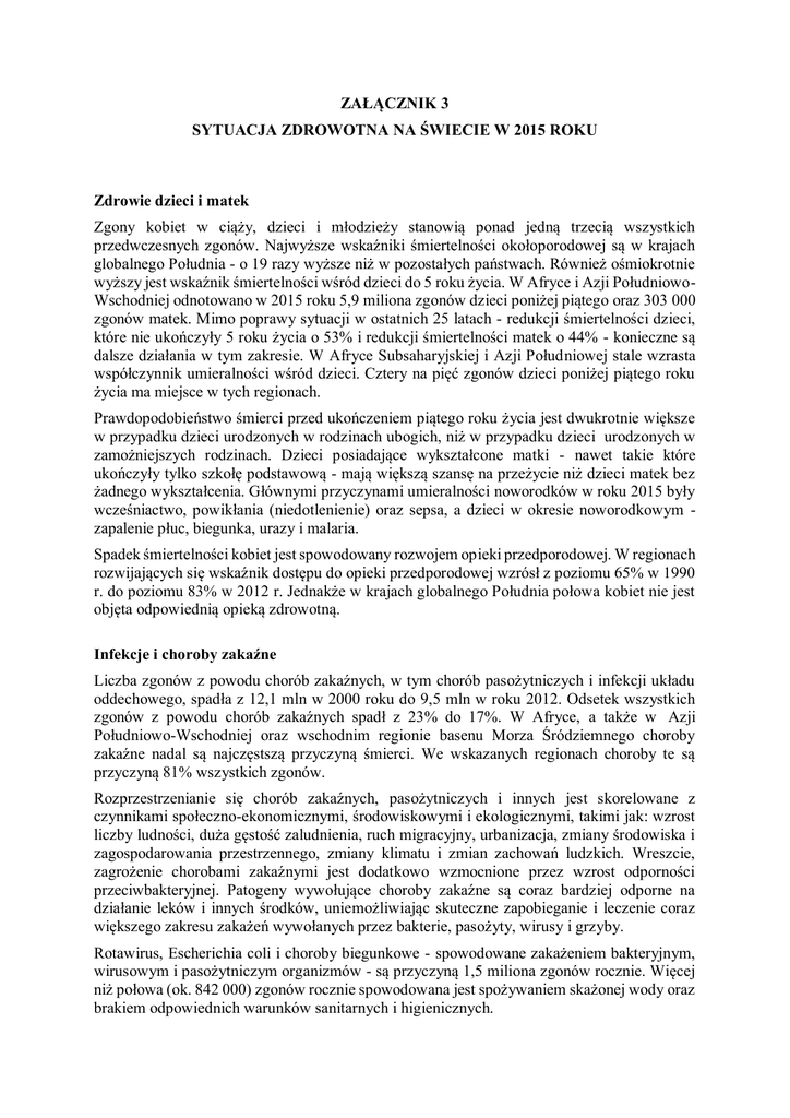 ZAŁĄCZNIK 3 SYTUACJA ZDROWOTNA NA ŚWIECIE W 2015 ROKU Zdrowie dzieci i matek Zgony kobiet w ciąży, dzieci i młodzieży stanowią ponad jedną trzecią wszystkich przedwczesnych zgonów. Najwyższe wskaźniki śmiertelności okołoporodowej są w krajach globalnego Południa - o 19 razy wyższe niż w pozostałych państwach. Również ośmiokrotnie wyższy jest wskaźnik śmiertelności wśród dzieci do 5 roku życia. W Afryce i Azji PołudniowoWschodniej odnotowano w 2015 roku 5,9 miliona zgonów dzieci poniżej piątego oraz 303 000 zgonów matek. Mimo poprawy sytuacji w ostatnich 25 latach - redukcji śmiertelności dzieci, które nie ukończyły 5 roku życia o 53% i redukcji śmiertelności matek o 44% - konieczne są dalsze działania w tym zakresie. W Afryce Subsaharyjskiej i Azji Południowej stale wzrasta współczynnik umieralności wśród dzieci. Cztery na pięć zgonów dzieci poniżej piątego roku życia ma miejsce w tych regionach. Prawdopodobieństwo śmierci przed ukończeniem piątego roku życia jest dwukrotnie większe w przypadku dzieci urodzonych w rodzinach ubogich, niż w przypadku dzieci urodzonych w zamożniejszych rodzinach. Dzieci posiadające wykształcone matki - nawet takie które ukończyły tylko szkołę podstawową - mają większą szansę na przeżycie niż dzieci matek bez żadnego wykształcenia. Głównymi przyczynami umieralności noworodków w roku 2015 były wcześniactwo, powikłania (niedotlenienie) oraz sepsa, a dzieci w okresie noworodkowym zapalenie płuc, biegunka, urazy i malaria. Spadek śmiertelności kobiet jest spowodowany rozwojem opieki przedporodowej. W regionach rozwijających się wskaźnik dostępu do opieki przedporodowej wzrósł z poziomu 65% w 1990 r. do poziomu 83% w 2012 r. Jednakże w krajach globalnego Południa połowa kobiet nie jest objęta odpowiednią opieką zdrowotną. Infekcje i choroby zakaźne Liczba zgonów z powodu chorób zakaźnych, w tym chorób pasożytniczych i infekcji układu oddechowego, spadła z 12,1 mln w 2000 roku do 9,5 mln w roku 2012. Odsetek wszystkich zgonów z powodu chorób zakaźnych spadł z 23% do 17%. W Afryce, a także w Azji Południowo-Wschodniej oraz wschodnim regionie basenu Morza Śródziemnego choroby zakaźne nadal są najczęstszą przyczyną śmierci. We wskazanych regionach choroby te są przyczyną 81% wszystkich zgonów. Rozprzestrzenianie się chorób zakaźnych, pasożytniczych i innych jest skorelowane z czynnikami społeczno-ekonomicznymi, środowiskowymi i ekologicznymi, takimi jak: wzrost liczby ludności, duża gęstość zaludnienia, ruch migracyjny, urbanizacja, zmiany środowiska i zagospodarowania przestrzennego, zmiany klimatu i zmian zachowań ludzkich. Wreszcie, zagrożenie chorobami zakaźnymi jest dodatkowo wzmocnione przez wzrost odporności przeciwbakteryjnej. Patogeny wywołujące choroby zakaźne są coraz bardziej odporne na działanie leków i innych środków, uniemożliwiając skuteczne zapobieganie i leczenie coraz większego zakresu zakażeń wywołanych przez bakterie, pasożyty, wirusy i grzyby. Rotawirus, Escherichia coli i choroby biegunkowe - spowodowane zakażeniem bakteryjnym, wirusowym i pasożytniczym organizmów - są przyczyną 1,5 miliona zgonów rocznie. Więcej niż połowa (ok. 842 000) zgonów rocznie spowodowana jest spożywaniem skażonej wody oraz brakiem odpowiednich warunków sanitarnych i higienicznych. Pomimo wzrostu ludności na świecie zaobserwowano spadek zachorowań i nowych zakażeń w przypadku malarii, gruźlicy i HIV: do 214 milionów przypadków malarii w 2015 roku, 9,6 miliona przypadków gruźlicy choroby i 2,0 mln nowych zakażeń HIV w 2014 roku. Spadła również śmiertelność na wskazane powyżej choroby. Do roku 2014 liczba zgonów związanych z AIDS spadła o 42% w porównaniu z 2004 rokiem. Liczba zgonów na malarię w latach 2000 i 2015 zmniejszyła się o 53%, a na gruźlicę (w podobnym okresie) o 29%. Wzrosła natomiast liczba zgonów z powodu wirusowego zapalenia wątroby (WZW). Pozytywne zmiany w latach 2000–2015 przyczyniły się do zmniejszenia o 6,2 miliona zgonów z powodu malarii (przede wszystkim wśród dzieci poniżej piątego roku życia w Afryce Subsaharyjskiej) oraz o 37 milionów zgonów na gruźlicę. HIV/AIDS Do końca 2013 roku szacunkowa liczba osób żyjących z HIV na całym świecie wynosiła 35 milionów. W tym samym roku liczba nowych zakażeń wirusem HIV wyniosła 2,1 miliona i była niższa o 38% niż w 2001 roku - z czego 240,000 stanowiły dzieci (liczba nowych zakażeń u dzieci spadła o 58%) i 250,000 nastolatki. Wśród nastolatków 2/3 zakażeń dotyczyło dziewcząt, co spowodowane jest nierównym traktowaniem i przemocą (w tym przemocą seksualną). W wielu przypadkach nie było przestrzegane prawo dziewcząt do zachowania intymności i nietykalności cielesnej - wiele z nich informowałą, że pierwsze doświadczenia seksualne były na nich wymuszone. HIV/AIDS jest główną przyczyną śmierci wśród kobiet w wieku reprodukcyjnym, a w Afryce Subsaharyjskiej AIDS jest główną przyczyną śmierci wśród dorastającej młodzieży pomiędzy 10. a 19. rokiem życia. Na całym świecie liczba zakażonych nastolatków wynosiła w 2013 roku 2,1 miliona. Zakażenie wirusem HIV dotyczy także innych regionów świata, przy czym najwyższe wskaźniki są - poza Afryką - w Ameryce Północnej i Ameryce Południowej. Jak wynika z danych Światowej Organizacji Zdrowia do końca 2014 roku 13,6 miliona osób skorzystało z terapii antyretrowirusowej, tj. nieco powyżej ⅓ zakażonych. Choroby niezakaźne Szacuje się, że choroby niezakaźne są przyczyną zgonu około 38 milionów osób rocznie, co stanowi 68% wszystkich zgonów na świecie. Głównymi przyczynami zgonów są: choroby sercowo-naczyniowe, nowotwory, cukrzyca i przewlekła niewydolność oddechowa. Choroby niezakaźne stanowią przyczynę prawie 80% zgonów. Według Organizacji Narodów Zjednoczony
