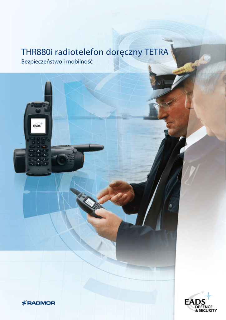 THR880i radiotelefon doręczny TETRA Bezpieczeństwo i mobilność THR880i radiotelefon doręczny TETRA t ;JOUFHSPXBOZPECJPSOJL(14 t 8ZǴXJFUMBD[5'5VNPȈMJXJBKnjDZ wyświetlanie obrazów jakości 'true color' t %XVTUSPOOZJOUFSGFKTVȈZULPXOJLB (przód i tył) t ,PNVOJLBUZHPTPXF t 8PEPPEQPSOZQZPT[D[FMOZ i odporny na wstrząsy t 8ZLPS[ZTUBOJFLBSU4NBSU$BSEEP szyfrowania end-to-end (opcja) t 1MBUGPSNB+BWBTM MIDP 2.0 t ,PMPSPXBQS[FHMnjEBSLB9)5.- Łatwy w użytkowaniu radiotelefon TETRA, na którym możesz polegać THR880i to zaawansowany radiotelefon doręczny pracujący w standardzie TETRA, przeznaczony do przesyłania mowy i danych. Stanowi solidną platformę dla nowych aplikacji oraz zapewnia bezpieczną komunikację w oparciu o szyfrowanie end-to-end. Radiotelefon posiada dwustronny interfejs użytkownika - z przodu radiotelefonu jest klawiatura natomiast z tyłu pokrętło. Używanie radiotelefonu jest łatwe i intuicyjne. niom powstałym w wyniku wstrząsów. Radiotelefon jest także wodoodporny i pyłoszczelny – spełnia wymagania kategorii ochronnej IP55. GPS zwiększa wydajność Zintegrowany odbiornik GPS umożliwia nawigację opartą o współrzędne geograficzne dostępne za pośrednictwem satelitów GPS. Pozycja radiotelefonu może być przesyłana poprzez sieć TETRA na żądanie lub automatycznie co określony odstęp czasu lub zadaną odległość. Może być również przesyłana jako odpowiedź na pojedyncze zapytanie. Dodatkowa aplikacja pozwala na wyświetlanie pozycji użytkowników na mapie Radiotelefon wyposażony jest w cyfrowej ułatwiając kontakt dowódkolorowy wyświetlacz, wygodną cy z podwładnymi działającymi w klawiaturę oraz przyjazne dla terenie. użytkownika menu. Wyświetlacz TFT umożliwia dokładne odwzorowanie obrazów, grafiki i kolorowych zdjęć. Dla zwiększenia bezpieczeństwa użytkownika, radiotelefon może być tak zaprogramowany aby wysyłać, na Pokrętło z tyłu radiotelefonu służy wcześniej zdefiniowany adres, do wybierania grup rozmównych. bieżącą lub ostatnią pozycję, gdy Komunikaty głosowe umożliwiają pracę bez konieczności spoglądania zostanie zainicjowane połączenie przyciskiem alarmowym. Dodatkowo na wyświetlacz np. przy zmianie użytkownicy radiotelefonu mogą grupy rozmównej lub przełączaniu zapisywać swoją pozycje jako punkty się w tryb direct mode. orientacyjne oraz wysyłać je innym Radiotelefon THR880i jest zbudowa- użytkownikom za pośrednictwem krótkich wiadomości. ny z wytrzymałych materiałów, wyposażony w uszczelki i elementy ochronne, co zapobiega uszkodze- Bezpieczne przesyłanie informacji Zabezpieczanie przesyłanych informacji jest bardzo ważne podczas łączności kryzysowej. Szyfrowanie end-to-end z wykorzystaniem kart Smart Card daje pewność, że informacje zostaną dostarczone tylko do konkretnego adresata. Komunikacja może być szyfrowana na całej drodze od jednostki wysyłającej do odbierającej. Szyfrowanie z wykorzystaniem karty SIM to najwyższy poziom bezpieczeństwa. Różne organizacje mogą używać specyficznych algorytmów szyfrowania. Większa mobilność Akcesoria Niezawodny, bieżący dostęp do informacji jest dzisiaj najważniejszą sprawą dla profesjonalnej komunikacji. Informacje graficzne - dokładne mapy, zdjęcia zaginionych osób lub skradzionych pojazdów - mogą być przesyłane do radiotelefonu poprzez pakietową transmisję danych z wykorzystaniem protokołów WAP/IP. Platforma JavaTM umożliwia łatwe wprowadzanie własnych aplikacji z dopasowanym do życzeń klienta interfejsem użytkownika, czyniąc dostęp do informacji szybkim, dogodnym i rzetelnym. Dla radiotelefonu EADS THR880i przewidziano następujące akcesoria: t t t t t t Zestaw samochodowy Mikrotelefon z przyciskiem PTT Ładowarka samochodowa Uchwyt z zaczepem do pasa Kabel do transmisji danych Kabel do transmisji danych dla zestawu samochodowego t Wewnętrzna bateria litowa jonowa o pojemności 1880 mAh t Ładowarka t Adapter biurkowy Dodatkowo dla radiotelefonu THR880i, Radmor oferuje szeroką gamę profesjonalnych akcesoriów dostępnych na życzenie. THR880i radiotelefon doręczny TETRA Nadajnik-Odbiornik t Spełnia normę EN 300392-2, klasa 4 t Klasa odbiornika: A t Czteropoziomowa kontrola mocy nadawczej z krokiem 5dB Parametry mechaniczne t Waga: 247 g t Wymiary: 147 x 57 x 35 mm Warunki klimatyczne t Spełnia wymagania dotyczące odporności na wodę i kurz zgodnie z kategorią ochrony IP54 / IP55 Wyświetlacz t Kolorowy TFT, wysokiej rozdzielczości t Do 65,536 kolorów, 130x130 pixeli Obsługa t Dwustronny interfejs (przód i tył) t Klawiatura alfanumeryczna t 4 przyciski nawigacyjne, 3 przyciski wyboru t Przycisk HI/LO poziomu głośności t Przycisk zasilania, przycisk regulacji głośności, czerwony przycisk alarmowy, dodatkowy przycisk funkcyjny, przycisk szybkiego dostępu do menu, pokrętło wyboru grupy, przycisk z tyłu obudowy Wbudowany odbiornik GPS tCzułość –152 dBm tDokładność przy zimnym starcie 5 meterów (z pewnością 50%) 10 meterów (z pewnością 95 %) tWskaźnik aktywności GPS tAutomatyczne zapamiętywanie pozycji tMożliwość wysyłania informacji o EADS Secure Networks Wörthstrasse 85 89077 Ulm - Germany Tel.: +49 (0) 731 392 11 www.eads.com/pmr położeniu na żądanie oraz automatycznie tMożliwość wysyłania informacji o położeniu w czasie połączeń alarmowych tMożliwość zapamiętywania punktów orientacyjnych tPrzesyłanie informacji zgodnie z protokołem NMEA na port szeregowy Rodzaje możliwych połączeń t W obrębie sieci TETRA t Do sieci publicznej PSTN t Indywidualne oraz grupowe t Alarmowe w ramach sieci TETRA t Z numerami alarmowymi do sieci Krótkie wiadomości tekstowe (SDS) oraz statusy t Możliwość wysyłania i odbierania statusów oraz SDM t Wiadomości migające t Wbudowany słownik T9 t Alarmowanie wybranego użytkownika Bezpieczeństwo t Wzajemne uwierzytelnianie terminala i sieci t Klasy bezpieczeństwa: Kla