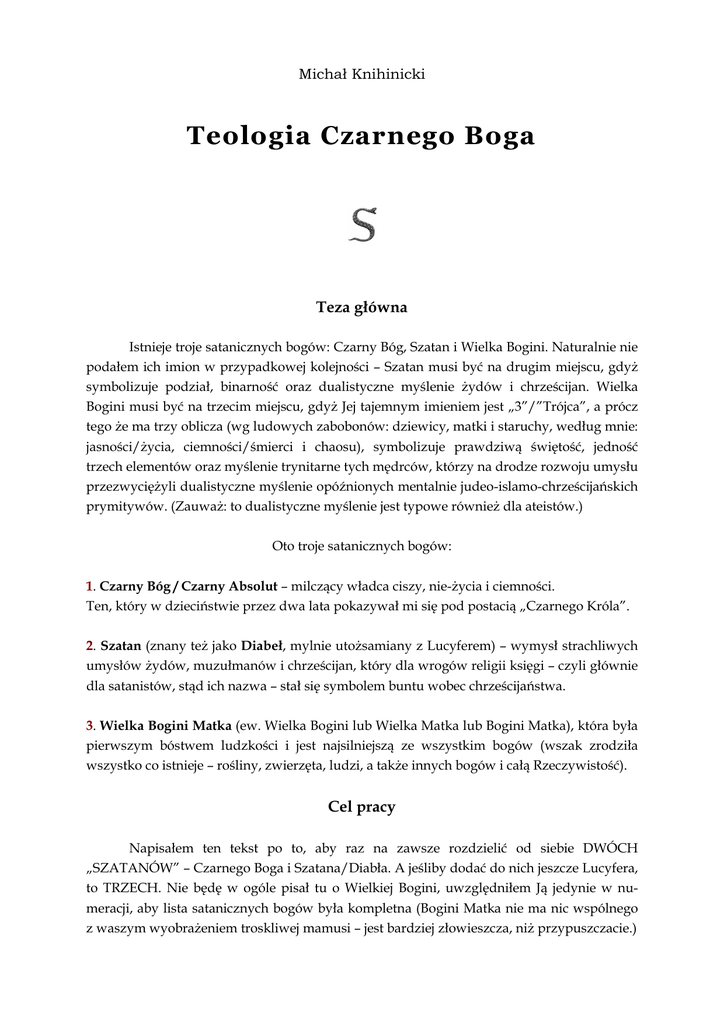 Michał Knihinicki Teologia Czarnego Boga Teza główna Istnieje troje satanicznych bogów: Czarny Bóg, Szatan i Wielka Bogini. Naturalnie nie podałem ich imion w przypadkowej kolejności – Szatan musi być na drugim miejscu, gdyż symbolizuje podział, binarność oraz dualistyczne myślenie żydów i chrześcijan. Wielka Bogini musi być na trzecim miejscu, gdyż Jej tajemnym imieniem jest „3”/”Trójca”, a prócz tego że ma trzy oblicza (wg ludowych zabobonów: dziewicy, matki i staruchy, według mnie: jasności/życia, ciemności/śmierci i chaosu), symbolizuje prawdziwą świętość, jedność trzech elementów oraz myślenie trynitarne tych mędrców, którzy na drodze rozwoju umysłu przezwyciężyli dualistyczne myślenie opóźnionych mentalnie judeo-islamo-chrześcijańskich prymitywów. (Zauważ: to dualistyczne myślenie jest typowe również dla ateistów.) Oto troje satanicznych bogów: 1. Czarny Bóg / Czarny Absolut – milczący władca ciszy, nie-życia i ciemności. Ten, który w dzieciństwie przez dwa lata pokazywał mi się pod postacią „Czarnego Króla”. 2. Szatan (znany też jako Diabeł, mylnie utożsamiany z Lucyferem) – wymysł strachliwych umysłów żydów, muzułmanów i chrześcijan, który dla wrogów religii księgi – czyli głównie dla satanistów, stąd ich nazwa – stał się symbolem buntu wobec chrześcijaństwa. 3. Wielka Bogini Matka (ew. Wielka Bogini lub Wielka Matka lub Bogini Matka), która była pierwszym bóstwem ludzkości i jest najsilniejszą ze wszystkim bogów (wszak zrodziła wszystko co istnieje – rośliny, zwierzęta, ludzi, a także innych bogów i całą Rzeczywistość). Cel pracy Napisałem ten tekst po to, aby raz na zawsze rozdzielić od siebie DWÓCH „SZATANÓW” – Czarnego Boga i Szatana/Diabła. A jeśliby dodać do nich jeszcze Lucyfera, to TRZECH. Nie będę w ogóle pisał tu o Wielkiej Bogini, uwzględniłem Ją jedynie w numeracji, aby lista satanicznych bogów była kompletna (Bogini Matka nie ma nic wspólnego z waszym wyobrażeniem troskliwej mamusi – jest bardziej złowieszcza, niż przypuszczacie.) Ponieważ cała sprawa jest nieco pogmatwana, a mnie bardzo zależy na tym, aby ją precyzyjnie opisać i podać jasne rozwiązanie, wyzbyte wszelkich mętnych dwuznaczności, będę używał nader prostych sformułowań i ogólnie zrozumiałych metafor. Cel powstania pracy, tj. rozdzielenie trzech różnych „szatanów”, jest tego wart. Szatan nie jest Lucyferem Pierwszym, bardzo powszechnym błędem jest utożsamianie Szatana/Diabła z Lucyferem. Szatan/Diabeł jest bogiem ciemności, agresji i szaleństwa (szalonej „wiedzy” niszczącej rozum), z kolei Lucyfer jest bogiem jasności/światła, spokoju i wiedzy tajemnej (która w najmniejszym stopniu nie prowadzi do szaleństwa, lecz do poprawy komfortu życia). Są to więc krańcowo odmienni bogowie. Ich utożsamianie przez satanistów i lucyferian pochodzi z ich ignorancji, którą wyssali z judeochrześcijańskim mlekiem. Nie jest nowością, że większość satanistów/lucyferian prezentuje poziom umysłowy tak samo niski, jak żydzi, muzułmanie i chrześcijanie, których są wrogami. Przyjmując ich tandetną mitologię dają tego najlepszy dowód. Otóż w żałośnie naiwnym micie o „Szatanie” mamy psychologistyczną opowieść o tym, jak to nerwowy stary (= ojciec), czyli bóg Jahwe, wygnał swojego niesfornego syna z domu, po czym owy syn, czyli nasz sławny „Szatan”, zleciał z nieba, aż na sam dół piekła, gdzie objął swoje złowieszcze panowanie. Ok, super, tylko że po pierwsze, opowieści tej NIE ZNAJDZIEMY w Biblii. Odsyłam do samodzielnej lektury Księgi Izajasza 14:12, w której to pojawia się osławiony zwrot „O, jakże spadłeś z nieba, ty gwiazdo jasna, synu jutrzenki!” lub „O, jakże spadłeś z nieba, jaśniejący, synu jutrzenki!” – w zależności od polskiego przekładu. Znajdziemy ją za to w poza-biblijnych pismach żydowskich, tzn. w apokryfach Starego Testamentu. Nie jest to więc wiedza biblijna, jednak w zasadzie wszyscy żydzi i chrześcijanie uznają ją za taką. Po drugie, samo imię „Lucyfer” to LEKSYKALNE NIEPOROZUMIENIE. Oryginale lucis ferre (lucis to dopełniacz od lux – „światło”; zaś ferre to „nieść”) oznaczało po prostu „niosący światło” i po raz pierwszy pojawiło się w Wulgacie (pierwszym całościowym przekładzie Biblii z języków oryginalnych na łacinę powstałym w końcówce IV wieku), jako przekład oryginalnego helel ben-szachar co oznacza „[planeta] Wenus świetlisty syn poranka”. Dlatego Hieronim (autor Wulgaty) przełożył to jako „Jaśniejący Syn Jutrzenki”. W żaden sposób nie wynika z tego, że owo lucis ferre / Lucifer to imię Szatana – najgorszego typa w całej Biblii. Jest tajemnicą, w jaki sposób zwrot ten stał się w ogóle imieniem, a Mega-Giga-Tajemnicą, jak imię „Niosący Światło” stało się imieniem kogoś, kto jest Panem Ciemności. Jest to po prostu gigantyczne nieporozumienie – już nie tylko leksykalne, ale kulturowe. Sataniści, gdy używają imienia „Lucyfer” jako synonimu imienia „Szatan”, są zwykłymi ignorantami, nieukami i użytkownikami kłamliwej popkultury, nieważne jak bardzo światłych i wyedukowanych by nie udawali. Ten sam zarzut dotyczy dużej ilości różnej maści pisarzy (najczęściej fantasy), którzy „Lucyferem” nazywają postać będącą władcą wszystkich demonów. Jest to tak samo niesmaczne, jak nazywanie satanizmem rozwalanie grobów przez opóźnionych w rozwoju szesnastolatków. Jest to objawem tej samej ignorancji, którą wykazują i odtwórczy sataniści, i chrześcijanie, którzy nie widzą sprzeczności w żadnym absurdzie w mitach swojej religii (skoro dziewica mogła urodzić, to i władca ciemności może nieść światło, czemu nie). 2 Ciekawie (i nieco inaczej) o imieniu „Lucyfer” pisze Wojciech Jóźwiak w swojej ksią