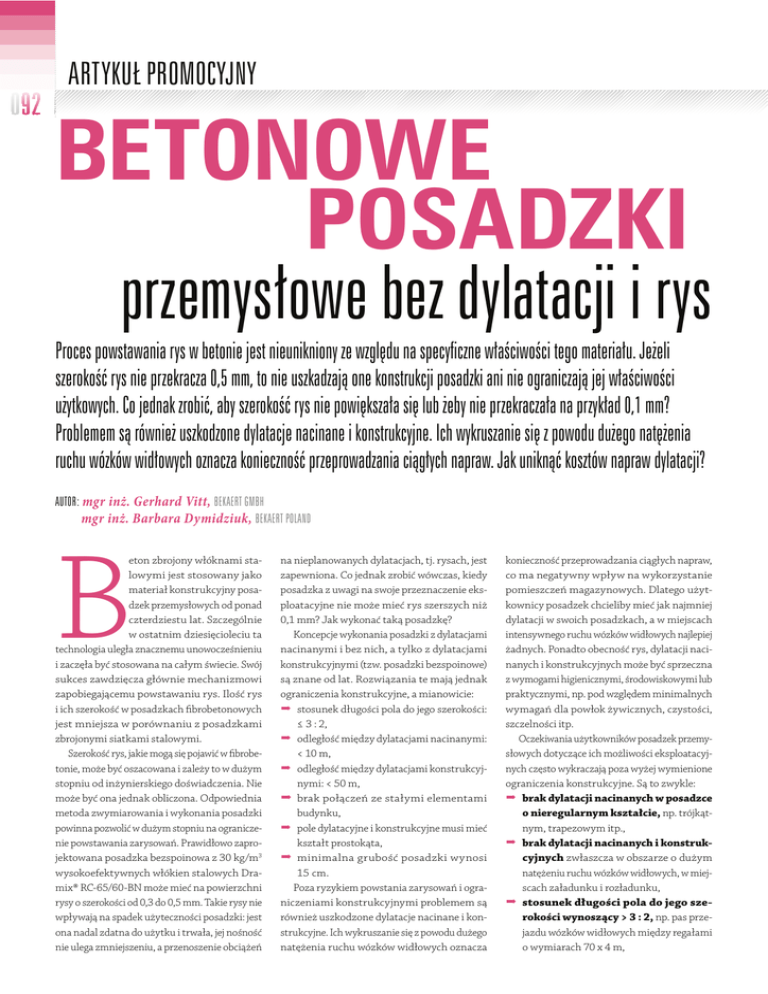 mgr inż. Gerhard Vitt, mgr inż. Barbara Dymidziuk, B eton zbrojony włóknami stalowymi jest stosowany jako materiał konstrukcyjny posadzek przemysłowych od ponad czterdziestu lat. Szczególnie w ostatnim dziesięcioleciu ta technologia uległa znacznemu unowocześnieniu i zaczęła być stosowana na całym świecie. Swój sukces zawdzięcza głównie mechanizmowi zapobiegającemu powstawaniu rys. Ilość rys i ich szerokość w posadzkach fibrobetonowych jest mniejsza w porównaniu z posadzkami zbrojonymi siatkami stalowymi. Szerokość rys, jakie mogą się pojawić w fibrobetonie, może być oszacowana i zależy to w dużym stopniu od inżynierskiego doświadczenia. Nie może być ona jednak obliczona. Odpowiednia metoda zwymiarowania i wykonania posadzki powinna pozwolić w dużym stopniu na ograniczenie powstawania zarysowań. Prawidłowo zaprojektowana posadzka bezspoinowa z 30 kg/m3 wysokoefektywnych włókien stalowych Dramix® RC-65/60-BN może mieć na powierzchni rysy o szerokości od 0,3 do 0,5 mm. Takie rysy nie wpływają na spadek użyteczności posadzki: jest ona nadal zdatna do użytku i trwała, jej nośność nie ulega zmniejszeniu, a przenoszenie obciążeń na nieplanowanych dylatacjach, tj. rysach, jest zapewniona. Co jednak zrobić wówczas, kiedy posadzka z uwagi na swoje przeznaczenie eksploatacyjne nie może mieć rys szerszych niż 0,1 mm? Jak wykonać taką posadzkę? Koncepcje wykonania posadzki z dylatacjami nacinanymi i bez nich, a tylko z dylatacjami konstrukcyjnymi (tzw. posadzki bezspoinowe) są znane od lat. Rozwiązania te mają jednak ograniczenia konstrukcyjne, a mianowicie: ² stosunek długości pola do jego szerokości: ≤ 3 : 2, ² odległość między dylatacjami nacinanymi: < 10 m, ² odległość między dylatacjami konstrukcyjnymi: < 50 m, ² brak połączeń ze stałymi elementami budynku, ² pole dylatacyjne i konstrukcyjne musi mieć kształt prostokąta, ² minimalna grubość posadzki wynosi 15 cm. Poza ryzykiem powstania zarysowań i ograniczeniami konstrukcyjnymi problemem są również uszkodzone dylatacje nacinane i konstrukcyjne. Ich wykruszanie się z powodu dużego natężenia ruchu wózków widłowych oznacza konieczność przeprowadzania ciągłych napraw, co ma negatywny wpływ na wykorzystanie pomieszczeń magazynowych. Dlatego użytkownicy posadzek chcieliby mieć jak najmniej dylatacji w swoich posadzkach, a w miejscach intensywnego ruchu wózków widłowych najlepiej żadnych. Ponadto obecność rys, dylatacji nacinanych i konstrukcyjnych może być sprzeczna z wymogami higienicznymi, środowiskowymi lub praktycznymi, np. pod względem minimalnych wymagań dla powłok żywicznych, czystości, szczelności itp. Oczekiwania użytkowników posadzek przemysłowych dotyczące ich możliwości eksploatacyjnych często wykraczają poza wyżej wymienione ograniczenia konstrukcyjne. Są to zwykle: ² brak dylatacji nacinanych w posadzce o nieregularnym kształcie, np. trójkątnym, trapezowym itp., ² brak dylatacji nacinanych i konstrukcyjnych zwłaszcza w obszarze o dużym natężeniu ruchu wózków widłowych, w miejscach załadunku i rozładunku, ² stosunek długości pola do jego szerokości wynoszący > 3 : 2, np. pas przejazdu wózków widłowych między regałami o wymiarach 70 x 4 m, ² odległość między dylatacjami konstrukcyjnymi wynosząca > 50 m, ² cienkie warstwy naprawcze bez dylatacji nacinanych, np. naprawa, wyrównanie, kładzenie tzw. nakładek, ² brak dylatacji nacinanych w nawierzchniach zewnętrznych, tj. zewnętrzne nawierzchnie bezspoinowe, ² posadzki o bardzo dużej wytrzymałości, ² posadzki z powłokami żywicznymi, dla których są wymagania dotyczące szerokości rys ze względu na powłokę żywiczną, np. posadzki w zakładach spożywczych i chemicznych, ² posadzka jako wtórna bariera betonowa, np. ochrona środowiska przed skażeniem cieczą, ² posadzki z ograniczoną możliwością powstawania odkształceń, np. posadzka połączona z fundamentami, obciążenia powodujące naprężenia utwierdzenia. Zastosowanie w takich przypadkach zbrojenia tylko w postaci włókien stalowych, a nawet bardzo dużej ilości wysokoefektywnych włókien nie jest w stanie zapobiec powstaniu dużej ilości rys o szerokości ponad 0,5 mm (rysy szersze niż 0,5 mm powinny być naprawione) oraz nadmiernemu rozszerzeniu się i wykruszeniu dylatacji konstrukcyjnych wykonanych w odległości wynoszącej np. 80 m od siebie. Z myślą o takich przypadkach została opracowana nowa koncepcja betonowej posadzki przemysłowej: Dramix® CombiSlab. Polega ona na połączeniu zbrojenia tradycyjnego w postaci jednej lub dwóch siatek stalowych i wysokoefektywnych włókien stalowych Dramix®. Dla tak dobranego połączonego zbrojenia wymiaruje się posadzkę. Wysokoefektywne włókna stalowe to włókna o smukłości wynoszącej co najmniej 65 mm i długości 60 mm (rys. nr 1). Duża smukłość włókna zapewnia dostateczną długość drutu w betonie do chronienia go przed rysami. Natomiast odpowiednia jego długość zapewnia dostateczne mostkowanie rys powstałych w betonie (rys. nr 2). Włókna krótkie, tj. o długości 35 mm, nie będą w stanie pojawić się wszędzie tam, gdzie powstały rysy, z uwagi na ich nadmierne rozproszenie. Natomiast włókna o smukłości mniejszej niż 65 mm wykazują zbyt małą efektywność mechaniczną, a przez to zbyt małą zdolność hamowania powstawania rys. Z tego powodu Bekaert nie oferuje włókien Dramix® RL-45/50-BN i RC-65/35-BN do posadzek Dramix® Combislab. Do posadzek Dramix® Combislab Bekaert proponuje włókna o dużej smukłości i co d = 0,75 ÷ 0,90 mm l = 60 mm l / d – smukłość włókna: 65 ÷ 80 za tym idzie – o dużej efektywności mechanicznej, a mianowicie Dramix® RC-65/60-BN i Dramix® RC-80/60-BN. Ilość tych włókien dodanych do 1 m3 betonu dla posadzek Dramix® Combislab wynosi co najmniej 25 kg/m3 i zależy od warunków konstrukcyjnych po