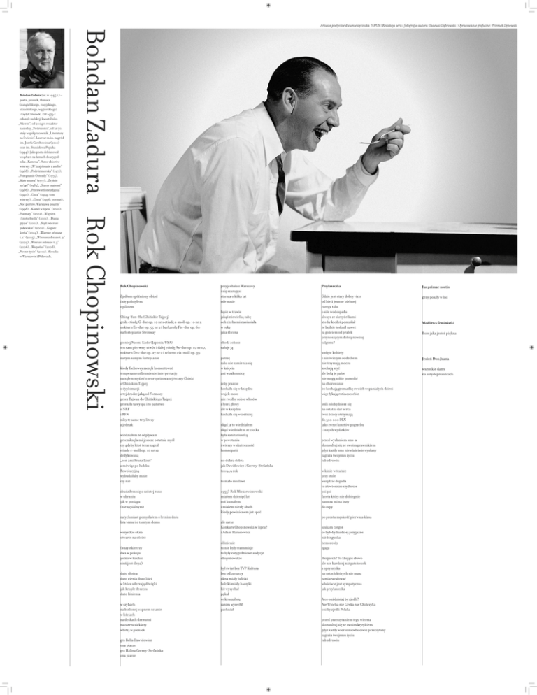 Arkusze poetyckie dwumiesięcznika TOPOS | Redakcja serii i fotografie autora: Tadeusz Dąbrowski | Opracowanie graficzne: Przemek Dębowski Bohdan Zadura Rok Chopinowski Bohdan Zadura (ur. w 1945 r.) – poeta, prozaik, tłumacz (z angielskiego, rosyjskiego, ukraińskiego, węgierskiego) i krytyk literacki. Od 1979 r. członek redakcji kwartalnika „Akcent”, od 2004 r. redaktor naczelny „Twórczości”, od lat 70. stały współpracownik „Literatury na Świecie”. Laureat m.in. nagród im. Józefa Czechowicza (2010) oraz im. Stanisława Piętaka (1994). Jako poeta debiutował w 1962 r. na łamach dwutygodnika „Kamena”. Autor zbiorów wierszy: „W krajobrazie z amfor” (1968), „Podróż morska” (1971), „Pożegnanie Ostendy” (1974), „Małe muzea” (1977), „Zejście na ląd” (1983), „Starzy znajomi” (1986), „Prześwietlone zdjęcia” (1990), „Cisza” (1994; tom wierszy), „Cisza” (1996; poemat), „Noc poetów. Warszawa pisarzy” (1998), „Kaszel w lipcu” (2000), „Poematy” (2001), „Więzień i krotochwila” (2001), „Ptasia grypa” (2002), „Stąd: wiersze puławskie” (2002), „Kopiec kreta” (2004), „Wiersze zebrane t. 1” (2005), „Wiersze zebrane t. 2” (2005), „Wiersze zebrane t. 3” (2006), „Wszystko” (2008), „Nocne życie” (2010). Mieszka w Warszawie i Puławach. Rok Chopinowski Zjadłem spóźniony obiad i się położyłem z pilotem Ching-Yun-Hu (Chińskie Tajpej) grała etiudę C-dur op. 10 nr 1 etiudę a-moll op. 10 nr 2 nokturn Es-dur op. 55 nr 2 i barkarolę Fis-dur op. 60 na fortepianie Steinway po niej Naomi Kudo (Japonia/USA) ten sam pierwszy utwór i dalej etiudę As-dur op. 10 nr 10, nokturn Des-dur op. 27 nr 2 i scherzo cis-moll op. 39 na tym samym fortepianie kiedy fachowcy zaczęli komentować temperament brzmienie interpretację zacząłem myśleć o zeuropeizowanej twarzy Chinki o Chińskim Tajpej o dyplomacji o tej drodze jaką od Formozy przez Tajwan do Chińskiego Tajpej przeszła ta wyspa i to państwo o NRF i RFN niby te same trzy litery a jednak wiedziałem że odpływam przemknęła mi jeszcze ostatnia myśl czy gdyby ktoś teraz zagrał etiudę c-moll op. 10 nr 12 dedykowaną „son ami Franz Liszt” a mówiąc po ludzku Rewolucyjną wybudziłaby mnie czy nie zbudziłem się o szóstej rano w ubraniu jak w pociągu (nie sypialnym) natychmiast pomyślałem o letnim dniu lata temu i o tamtym domu wszystkie okna otwarte na oścież (wszystkie trzy dwa w pokoju jedno w kuchni sień jest ślepa) dużo słońca dużo cienia dużo liści w które uderzają dźwięki jak krople deszczu dużo lśnienia w szybach na bielonej wapnem ścianie w liściach na deskach drewutni na ostrzu siekiery wbitej w pieniek gra Bella Dawidowicz ona płacze gra Halina Czerny-Stefańska ona płacze przyjechała z Warszawy i się szarogęsi starsza o kilka lat ode mnie łapie w trawie jakąś niewielką żabę och chyba mi nasiusiała w rękę jaka śliczna chodź zobacz całuje ją patrzę żaba nie zamienia się w księcia ani w zakonnicę żeby jeszcze kochała się w księdzu wujek może nie rwałby sobie włosów z łysej głowy ale w księdzu kochała się wcześniej skąd ja to wiedziałem skąd wiedziałem że ciotka była sanitariuszką w powstaniu i wierzy w skuteczność homeopatii no dobra dobra jak Dawidowicz i Czerny-Stefańska to 1949 rok to mało możliwe 1955? Rok Mickiewiczowski miałem dziesięć lat coś kumałem i miałem niezły słuch kiedy powinienem już spać Przylaszczka Ius primae noctis Gdzie jest stary dobry vizir od bieli jeszcze bielszej corega tabs o sile wodospadu always ze skrzydełkami kto by kiedyś pomyślał że będzie tęsknił nawet za gościem od pralek przynoszącym dobrą nowinę calgonu? geny poszły w lud wzdęte kobiety z nieświeżym oddechem nie trzymają moczu kochają szyć ale bolą je palce nie mogą sobie pozwolić na chorowanie bo kochają gromadkę swoich wspaniałych dzieci więc łykają rutinoscorbin jeśli zdobędziesz się na ostatni dar serca twoi bliscy otrzymają do 300 000 PLN jako zwrot kosztów pogrzebu i innych wydatków przed wysłaniem sms-a skonsultuj się ze swoim prawnikiem gdyż każdy sms niewłaściwie wysłany zagraża twojemu życiu lub zdrowiu w kinie w teatrze przy stole wszędzie dopada to złowieszczo szydercze psi psi faceta który nie dobiegnie naszcza mi na buty do zupy po prostu męskość pierwsza klasa ale zaraz Konkurs Chopinowski w lipcu? i Adam Harasiewicz olśnienie to nie były transmisje to były cotygodniowe audycje chopinowskie był świat bez TVP Kultura bez odkurzaczy okna miały lufciki lufciki miały haczyki kit wysychał pękał wykruszał się zanim wysechł pachniał szukam czegoś co byłoby bardziej przyjazne niż biegunka hemoroidy zgaga Herpatch? To kłujące słowo ale nie bardziej niż patchwork a opryszczka na ustach których nie masz zamiaru całować właściwie jest sympatyczna jak przylaszczka A co oni dzisiaj by zjedli? Nie Włocha nie Greka nie Chińczyka oni by zjedli Polaka przed przeczytaniem tego wiersza skonsultuj się ze swoim krytykiem gdyż każdy wiersz niewłaściwie przeczytany zagraża twojemu życiu lub zdrowiu Modlitwa feministki Boże jaka jesteś piękna Jesień Don Juana wszystkie damy na antydepresantach