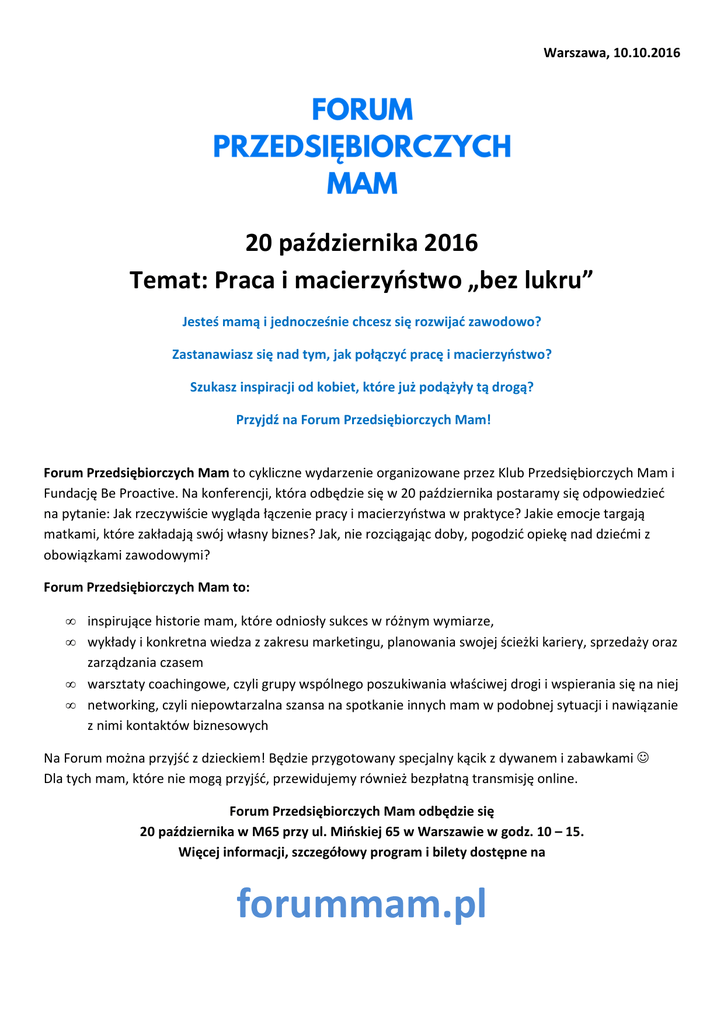 Warszawa, 10.10.2016 20 października 2016 Temat: Praca i macierzyństwo „bez lukru” Jesteś mamą i jednocześnie chcesz się rozwijać zawodowo? Zastanawiasz się nad tym, jak połączyć pracę i macierzyństwo? Szukasz inspiracji od kobiet, które już podążyły tą drogą? Przyjdź na Forum Przedsiębiorczych Mam! Forum Przedsiębiorczych Mam to cykliczne wydarzenie organizowane przez Klub Przedsiębiorczych Mam i Fundację Be Proactive. Na konferencji, która odbędzie się w 20 października postaramy się odpowiedzieć na pytanie: Jak rzeczywiście wygląda łączenie pracy i macierzyństwa w praktyce? Jakie emocje targają matkami, które zakładają swój własny biznes? Jak, nie rozciągając doby, pogodzić opiekę nad dziećmi z obowiązkami zawodowymi? Forum Przedsiębiorczych Mam to: • • • • inspirujące historie mam, które odniosły sukces w różnym wymiarze, wykłady i konkretna wiedza z zakresu marketingu, planowania swojej ścieżki kariery, sprzedaży oraz zarządzania czasem warsztaty coachingowe, czyli grupy wspólnego poszukiwania właściwej drogi i wspierania się na niej networking, czyli niepowtarzalna szansa na spotkanie innych mam w podobnej sytuacji i nawiązanie z nimi kontaktów biznesowych Na Forum można przyjść z dzieckiem! Będzie przygotowany specjalny kącik z dywanem i zabawkami ☺ Dla tych mam, które nie mogą przyjść, przewidujemy również bezpłatną transmisję online. Forum Przedsiębiorczych Mam odbędzie się 20 października w M65 przy ul. Mińskiej 65 w Warszawie w godz. 10 – 15. Więcej informacji, szczegółowy program i bilety dostępne na forummam.pl