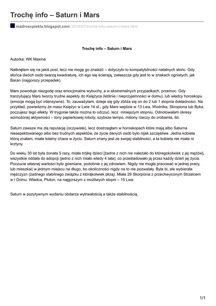 Trochę info – Saturn i Mars madroscpiekla.blogspot.com /2016/07/troche-info-saturn-i-mars.html Trochę info – Saturn i Mars Autorka: WK Maxine Natknęłam się na jakiś post, lecz nie mogę go znaleźć – dotyczyło to kompatybilności natalnych słońc. Gdy słońca dwóch osób twarzą kwadraturę, ich ego się ścierają, zwłaszcza gdy jest to w znakach ognistych, jak Baran (najgorszy przepadek). Mars powoduje niezgodę oraz emocjonalne wybuchy, a w ekstremalnych przypadkach, przemoc. Gdy tranzytujący Mars tworzy trudne aspekty do Księżyca (kłótnie i nieprzyjemności w domu), lub władcy horoskopu (emocje mogą być intensywne). To, zauważyłam, dzieje się gdy zbliża się on do 2 lub 1 stopnia dokładności. Na przykład, powiedzmy że masz Księżyc w Lwie 14 st.; gdy Mars wejdzie w 13 Lwa, Wodnika, Skropiona lub Byka, poczujesz tego efekty. W trygonie także można to odczuć, lecz mniejszym stopniu. Odnotowałam okresy wzmożonej aktywności – tony papierkowej roboty, szybsze tempo, miliony rzeczy do zrobienia, itd. Saturn zawsze ma złą reputację (oczywiste), lecz dostrzegłam w horoskopach które mają albo Saturna nieaspektowanego albo bez trudnych aspektów, że życie danych osób było nijak szczęśliwe. Jedna kobieta którą znałam, miała totalny chaos w życiu. Saturn znany jest ze swojej stabilności, a ta kobieta nie miała ni krztyny. Do wieku 30 lat była żonata 5 razy, miała trójkę dzieci [żadne z nich nie należało do któregokolwiek z jej mężów], wszystkie oddała do adopcji (jedno z nich miało wtedy 4 lata), co prześladowało ją przez każdy dzień jej życia. Poczucie własnej wartości było gówniane, podobnie z jej zdrowiem. Nigdy nie mogła pracować w jednej pracy, lub mieszkać w jednym miejscu na długo, bo okoliczności nigdy na to nie pozwalały. Była bi, ale wybierała mężczyzn (żadnego stabilnego związku z którąkolwiek płcią). Miała 29 Skorpiona z przechwyconym Strzelcem w I Domu. Władca, Pluton, na najgorszym z możliwych stopni – 15 Lwa. Saturn w pozytywnym wydaniu obdarza wytrwałością a także stabilnością. 1/1
