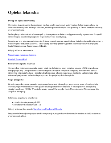Opieka lekarska Dostęp do opieki zdrowotnej Obywatele innych państw korzystający z usług opieki medycznej na terytorium Polski muszą płacić za świadczenia medyczne. Dlatego zalecane jest ubezpieczenie się na czas podróży w firmie ubezpieczeniowej we własnym kraju. Do bezpłatnych świadczeń zdrowotnych podczas pobytu w Polsce mają prawo osoby uprawnione do opieki zdrowotnej na podstawie przepisów wspólnotowych o koordynacji. Przysługuje ono u świadczeniodawców, którzy zawarli umowy na udzielanie świadczeń opieki zdrowotnej z Narodowym Funduszem Zdrowia. Takie osoby powinny przed wyjazdem wyposażyć się w Europejską Kartę Ubezpieczenia Zdrowotnego (EKUZ). Więcej o Karcie na stronach: Narodowego Funduszu Zdrowia Komisji Europejskiej Podstawowa opieka lekarska Aby uzyskać podstawową opiekę należy udać się do lekarza, który podpisał umowę z NFZ oraz okazać Europejską Kartę Ubezpieczenia Zdrowotnego (EKUZ) lub certyfikat zastępczy. Podstawowa opieka zdrowotna obejmuje badania i poradę udzieloną przez lekarza pierwszego kontaktu. Lekarz może także skierować pacjenta na badania diagnostyczne, do specjalisty lub do szpitala. Nagłe przypadki W razie wypadku, urazu, porodu, nagłego zachorowania lub nagłego pogorszenia stanu zdrowia należy wezwać pogotowie ratunkowe lub zgłosić się bezpośrednio do szpitala, w szczególności na szpitalny oddział ratunkowy (SOR). W szpitalu należy okazać Europejską Kartę Ubezpieczenia Zdrowotnego lub certyfikat zastępczy. Telefon na pogotowie ratunkowe: z telefonów stacjonarnych 999 z telefonów komórkowych 112 Więcej informacji na stronie Narodowego Funduszu Zdrowia Przydatne informacje dotyczące opieki medycznej w przypadku cudzoziemców można znaleźć na stronie: www.migrant.info.pl