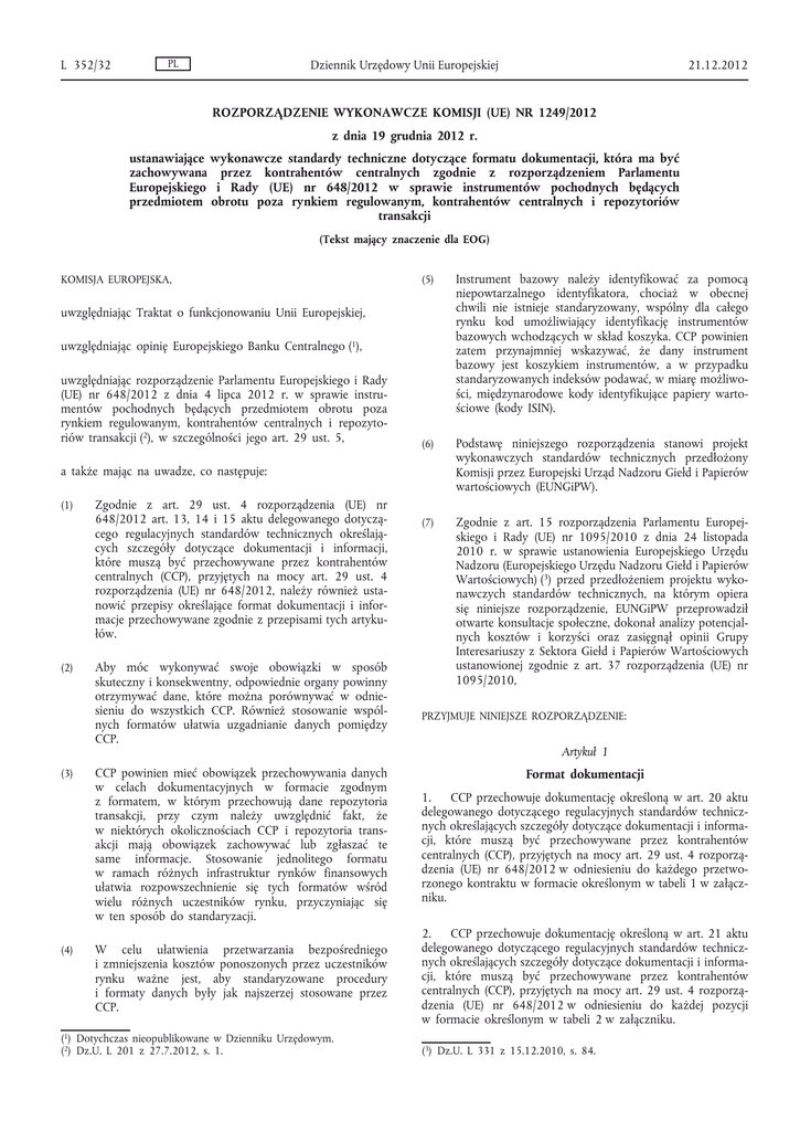 L 352/32 PL Dziennik Urzędowy Unii Europejskiej 21.12.2012 ROZPORZĄDZENIE WYKONAWCZE KOMISJI (UE) NR 1249/2012 z dnia 19 grudnia 2012 r. ustanawiające wykonawcze standardy techniczne dotyczące formatu dokumentacji, która ma być zachowywana przez kontrahentów centralnych zgodnie z rozporządzeniem Parlamentu Europejskiego i Rady (UE) nr 648/2012 w sprawie instrumentów pochodnych będących przedmiotem obrotu poza rynkiem regulowanym, kontrahentów centralnych i repozytoriów transakcji (Tekst mający znaczenie dla EOG) KOMISJA EUROPEJSKA, (5) Instrument bazowy należy identyfikować za pomocą niepowtarzalnego identyfikatora, chociaż w obecnej chwili nie istnieje standaryzowany, wspólny dla całego rynku kod umożliwiający identyfikację instrumentów bazowych wchodzących w skład koszyka. CCP powinien zatem przynajmniej wskazywać, że dany instrument bazowy jest koszykiem instrumentów, a w przypadku standaryzowanych indeksów podawać, w miarę możliwo ści, międzynarodowe kody identyfikujące papiery warto ściowe (kody ISIN). (6) Podstawę niniejszego rozporządzenia stanowi projekt wykonawczych standardów technicznych przedłożony Komisji przez Europejski Urząd Nadzoru Giełd i Papierów wartościowych (EUNGiPW). (7) Zgodnie z art. 15 rozporządzenia Parlamentu Europej skiego i Rady (UE) nr 1095/2010 z dnia 24 listopada 2010 r. w sprawie ustanowienia Europejskiego Urzędu Nadzoru (Europejskiego Urzędu Nadzoru Giełd i Papierów Wartościowych) (3) przed przedłożeniem projektu wyko nawczych standardów technicznych, na którym opiera się niniejsze rozporządzenie, EUNGiPW przeprowadził otwarte konsultacje społeczne, dokonał analizy potencjal nych kosztów i korzyści oraz zasięgnął opinii Grupy Interesariuszy z Sektora Giełd i Papierów Wartościowych ustanowionej zgodnie z art. 37 rozporządzenia (UE) nr 1095/2010, uwzględniając Traktat o funkcjonowaniu Unii Europejskiej, uwzględniając opinię Europejskiego Banku Centralnego (1), uwzględniając rozporządzenie Parlamentu Europejskiego i Rady (UE) nr 648/2012 z dnia 4 lipca 2012 r. w sprawie instru mentów pochodnych będących przedmiotem obrotu poza rynkiem regulowanym, kontrahentów centralnych i repozyto riów transakcji (2), w szczególności jego art. 29 ust. 5, a także mając na uwadze, co następuje: (1) (2) (3) (4) Zgodnie z art. 29 ust. 4 rozporządzenia (UE) nr 648/2012 art. 13, 14 i 15 aktu delegowanego dotyczą cego regulacyjnych standardów technicznych określają cych szczegóły dotyczące dokumentacji i informacji, które muszą być przechowywane przez kontrahentów centralnych (CCP), przyjętych na mocy art. 29 ust. 4 rozporządzenia (UE) nr 648/2012, należy również usta nowić przepisy określające format dokumentacji i infor macje przechowywane zgodnie z przepisami tych artyku łów. Aby móc wykonywać swoje obowiązki w sposób skuteczny i konsekwentny, odpowiednie organy powinny otrzymywać dane, które można porównywać w odnie sieniu do wszystkich CCP. Również stosowanie wspól nych formatów ułatwia uzgadnianie danych pomiędzy CCP. PRZYJMUJE NINIEJSZE ROZPORZĄDZENIE: Artykuł 1 CCP powinien mieć obowiązek przechowywania danych w celach dokumentacyjnych w formacie zgodnym z formatem, w którym przechowują dane repozytoria transakcji, przy czym należy uwzględnić fakt, że w niektórych okolicznościach CCP i repozytoria trans akcji mają obowiązek zachowywać lub zgłaszać te same informacje. Stosowanie jednolitego formatu w ramach różnych infrastruktur rynków finansowych ułatwia rozpowszechnienie się tych formatów wśród wielu różnych uczestników rynku, przyczyniając się w ten sposób do standaryzacji. 1. CCP przechowuje dokumentację określoną w art. 20 aktu delegowanego dotyczącego regulacyjnych standardów technicz nych określających szczegóły dotyczące dokumentacji i informa cji, które muszą być przechowywane przez kontrahentów centralnych (CCP), przyjętych na mocy art. 29 ust. 4 rozporzą dzenia (UE) nr 648/2012 w odniesieniu do każdego przetwo rzonego kontraktu w formacie określonym w tabeli 1 w załącz niku. W celu ułatwienia przetwarzania bezpośredniego i zmniejszenia kosztów ponoszonych przez uczestników rynku ważne jest, aby standaryzowane procedury i formaty danych były jak najszerzej stosowane przez CCP. 2. CCP przechowuje dokumentację określoną w art. 21 aktu delegowanego dotyczącego regulacyjnych standardów technicz nych określających szczegóły dotyczące dokumentacji i informa cji, które muszą być przechowywane przez kontrahentów centralnych (CCP), przyjętych na mocy art. 29 ust. 4 rozporzą dzenia (UE) nr 648/2012 w odniesieniu do każdej pozycji w formacie określonym w tabeli 2 w załączniku. (1) Dotychczas nieopublikowane w Dzienniku Urzędowym. (2) Dz.U. L 201 z 27.7.2012, s. 1. Format dokumentacji (3) Dz.U. L 331 z 15.12.2010, s. 84. 21.12.2012 PL Dziennik Urzędowy Unii Europejskiej L 352/33 3. CCP przechowuje dokumentację określoną w art. 22 aktu delegowanego dotyczącego regulacyjnych standardów technicz nych określających szczegóły dotyczące dokumentacji i informa cji, które muszą być przechowywane przez kontrahentów centralnych (CCP), przyjętych na mocy art. 29 ust. 4 rozporzą dzenia (UE) nr 648/2012 w odniesieniu do działalności jego przedsiębiorstwa oraz organizacji wewnętrznej w formacie okre ślonym w tabeli 3 w załączniku. umożliwiającym bezpośredni przepływ danych pomiędzy CCP a właściwym organem. CCP ustanawia taki przepływ danych w terminie sześciu miesięcy od wniosku właściwego organu. 4. CCP przekazuje właściwemu organowi dokumentację i informacje, o których mowa w ust. 1, 2 i 3, w formacie Niniejsze rozporządzenie wchodzi w życie dwudziestego dnia po jego opublikowaniu w Dzienniku Urzędowym Unii Europejskiej. Artykuł 2 Wejście w życie Niniejsze rozporządzenie wiąże w całości i jest bezpośrednio stosowane we wszystkich pań