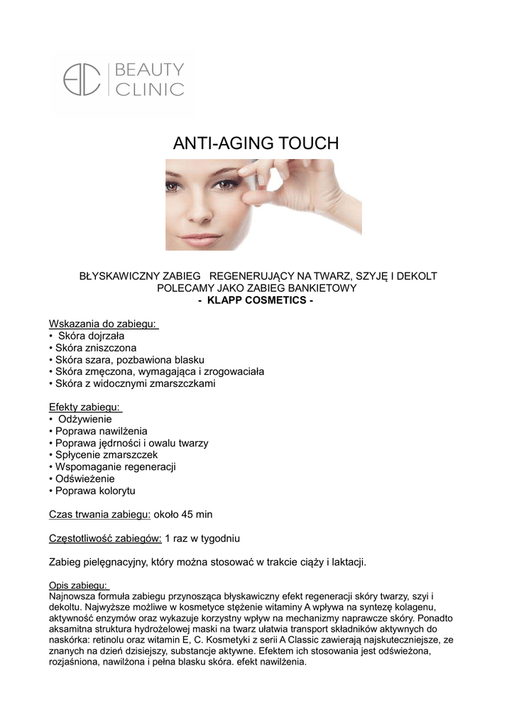 ANTI-AGING TOUCH BŁYSKAWICZNY ZABIEG REGENERUJĄCY NA TWARZ, SZYJĘ I DEKOLT POLECAMY JAKO ZABIEG BANKIETOWY - KLAPP COSMETICS Wskazania do zabiegu: • Skóra dojrzała • Skóra zniszczona • Skóra szara, pozbawiona blasku • Skóra zmęczona, wymagająca i zrogowaciała • Skóra z widocznymi zmarszczkami Efekty zabiegu: • Odżywienie • Poprawa nawilżenia • Poprawa jędrności i owalu twarzy • Spłycenie zmarszczek • Wspomaganie regeneracji • Odświeżenie • Poprawa kolorytu Czas trwania zabiegu: około 45 min Częstotliwość zabiegów: 1 raz w tygodniu Zabieg pielęgnacyjny, który można stosować w trakcie ciąży i laktacji. Opis zabiegu: Najnowsza formuła zabiegu przynosząca błyskawiczny efekt regeneracji skóry twarzy, szyi i dekoltu. Najwyższe możliwe w kosmetyce stężenie witaminy A wpływa na syntezę kolagenu, aktywność enzymów oraz wykazuje korzystny wpływ na mechanizmy naprawcze skóry. Ponadto aksamitna struktura hydrożelowej maski na twarz ułatwia transport składników aktywnych do naskórka: retinolu oraz witamin E, C. Kosmetyki z serii A Classic zawierają najskuteczniejsze, ze znanych na dzień dzisiejszy, substancje aktywne. Efektem ich stosowania jest odświeżona, rozjaśniona, nawilżona i pełna blasku skóra. efekt nawilżenia.