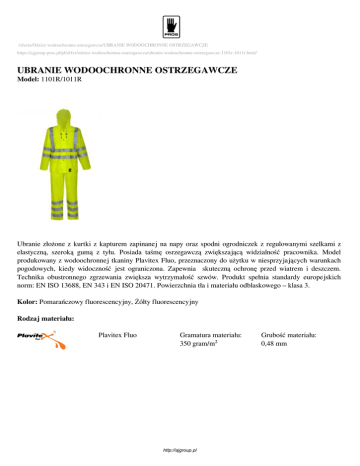 /oferta/Odzież wodoochronna ostrzegawcza/UBRANIE WODOOCHRONNE OSTRZEGAWCZE https://ajgroup-pros.pl/pl/offer/odziez-wodoochronna-ostrzegawcza/ubranie-wodoochronne-ostrzegawcze-1101r-1011r.html/ UBRANIE WODOOCHRONNE OSTRZEGAWCZE Model: 1101R/1011R Ubranie złożone z kurtki z kapturem zapinanej na napy oraz spodni ogrodniczek z regulowanymi szelkami z elastyczną, szeroką gumą z tyłu. Posiada taśmę osrzegawczą zwiększającą widzialność pracownika. Model produkowany z wodoochronnej tkaniny Plavitex Fluo, przeznaczony do użytku w niesprzyjających warunkach pogodowych, kiedy widoczność jest ograniczona. Zapewnia skuteczną ochronę przed wiatrem i deszczem. Technika obustronnego zgrzewania zwiększa wytrzymałość szwów. Produkt spełnia standardy europejskich norm: EN ISO 13688, EN 343 i EN ISO 20471. Powierzchnia tła i materiału odblaskowego – klasa 3. Kolor: Pomarańczowy fluorescencyjny, Żółty fluorescencyjny Rodzaj materiału: Plavitex Fluo Gramatura materiału: 350 gram/m² http://ajgroup.pl Grubość materiału: 0,48 mm Rozmiar: 48, 50, 52, 54, 56, 58, 60, 62 Tabela rozmiarów: S Rozmiar 48 Wzrost 164 Obwód 96-100 klat. piersiowej Obwód w 80-84 pasie M 50 170 100-104 L 52 176 104-108 L 54 176 108-112 XL 56 182 112-116 XXL 58 188 116-120 XXXL 60 194 120-124 XXXXL 62 198 124-128 80-84 84-88 84-88 88-92 92-96 96-100 96-100 Normy: Cechy specyficzne: EN ISO 13688 Odzież ochronna wymagania ogólne. EN 343 Odzież ochronna. Ochrona przed deszczem. EN ISO 20471 Odzież o intensywnej widzialności. -50ºC Produkt odporny na zginanie przy dużych ujemnych temperaturach. Obustronne zgrzewanie Dodatkowy pas taśmy ostrzegawczej na przodzie karczka Kaptur Napy Taśma ostrzegawcza podwójna Pionowe pasy taśmy ostrzegawczej na przodzie i tyle Szelki z wszytą gumą szelkową Taśma ostrzegawcza potrójna http://ajgroup.pl Powered by TCPDF (www.tcpdf.org)