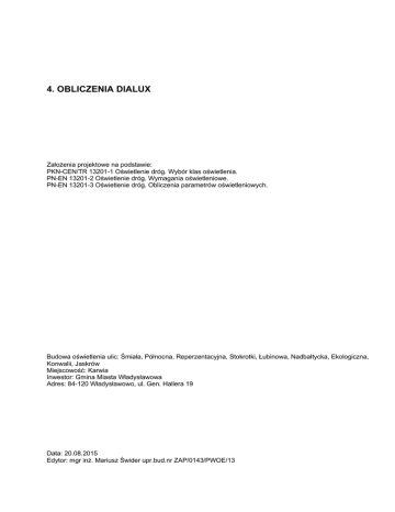 4. OBLICZENIA DIALUX Założenia projektowe na podstawie: PKN-CEN/TR 13201-1 Oświetlenie dróg. Wybór klas oświetlenia. PN-EN 13201-2 Oświetlenie dróg. Wymagania oświetleniowe. PN-EN 13201-3 Oświetlenie dróg. Obliczenia parametrów oświetleniowych. Budowa oświetlenia ulic: Śmiała, Północna, Reperzentacyjna, Stokrotki, Łubinowa, Nadbałtycka, Ekologiczna, Konwalii, Jaskrów Miejscowość: Karwia Inwestor: Gmina Miasta Władysławowa Adres: 84-120 Władysławowo, ul. Gen. Hallera 19 Data: 20.08.2015 Edytor: mgr inż. Mariusz Świder upr.bud.nr ZAP/0143/PWOE/13 4. OBLICZENIA DIALUX 20.08.2015 Świder- Elektrotechnika 78-100 Kołobrzeg Jana Matejki 8/3 www.swider-elektrotechnika.pl Edytor mgr inż. Mariusz Świder upr.bud.nr ZAP/0143/PWOE/13 Telefon +48 508 116 370 faks e-Mail [email protected] Spis treści 4. OBLICZENIA DIALUX Strona tytułowa projektu Spis treści ul. Reprezentacyjna, Śmiała, Łubinowa, Północna - 9.KDD, 0.9 KL, 0.... Dane planowania Lista opraw Wyniki szczegółowe Pola oszacowania Pole oszacowania Jezdnia Zestawienie wyników Klasa oświetleniowa Grafika wartości (E) Obserwator Obserwator 1 Izolinie (L) Obserwator 2 Izolinie (L) 1 2 3 4 5 7 8 9 10 11 Strona 2 4. OBLICZENIA DIALUX 20.08.2015 Świder- Elektrotechnika 78-100 Kołobrzeg Jana Matejki 8/3 www.swider-elektrotechnika.pl Edytor mgr inż. Mariusz Świder upr.bud.nr ZAP/0143/PWOE/13 Telefon +48 508 116 370 faks e-Mail [email protected] ul. Reprezentacyjna, Śmiała, Łubinowa, Północna - 9.KDD, 0.9 KL, 0.10 KL / Dane planowania Profil ulicy Chodnik 1 Jezdnia (Szerokość: 2.000 m) (Szerokość: 5.000 m, Liczba pasów jezdni: 2, Nawierzchnia: R3, q0: 0.070) Chodnik 2 (Szerokość: 2.000 m) Współczynnik konserwacji: 0.90 Rozmieszczenia opraw Oprawa: Strumień świetlny (Oprawa): Strumień świetlny (Lampy): Moc opraw: Rozmieszczenie: Odstęp słupa: Wysokość montażu (1): Wysokość punktu świetlnego: Nawis (2): Nachylenie wysięgnika (3): Długość wysięgnika (4): Osram Siteco Preliminary Osram Siteco Streetlight 44W 4950lm 4950 lm Wartości maksymalne mocy oświetleniowej 4950 lm przy 70°: 912 cd/klm 44.0 W przy 80°: 116 cd/klm przy 90°: 2.12 cd/klm jednostronnie u góry W każdym kierunku tworzącym podany kąt z dolną linią pionową przy 38.000 m zainstalowanym i gotowym do użytku oświetleniu. 7.000 m 6.960 m Rozmieszczenie spełnia wymagania klasy mocy -2.000 m oświetleniowej G2. 3.0 ° Rozmieszczenie spełnia wymagania klasy indeksu 0.000 m oślepiania D.6. Strona 3 4. OBLICZENIA DIALUX 20.08.2015 Świder- Elektrotechnika 78-100 Kołobrzeg Jana Matejki 8/3 www.swider-elektrotechnika.pl Edytor mgr inż. Mariusz Świder upr.bud.nr ZAP/0143/PWOE/13 Telefon +48 508 116 370 faks e-Mail [email protected] ul. Reprezentacyjna, Śmiała, Łubinowa, Północna - 9.KDD, 0.9 KL, 0.10 KL / Lista opraw Osram Siteco Preliminary Osram Siteco Streetlight 44W 4950lm Numer artykułu: Preliminary Strumień świetlny (Oprawa): 4950 lm Strumień świetlny (Lampy): 4950 lm Moc opraw: 44.0 W Klasyfikacja oświetleń CIE: 100 Kod Flux CIE: 37 72 96 100 100 Wyposażenie: 1 x LED (Czynnik korekcyjny 1.000). Ilustracje oświetleń znajdziesz w naszym katalogu oświetleń. Strona 4 4. OBLICZENIA DIALUX 20.08.2015 Świder- Elektrotechnika 78-100 Kołobrzeg Jana Matejki 8/3 www.swider-elektrotechnika.pl Edytor mgr inż. Mariusz Świder upr.bud.nr ZAP/0143/PWOE/13 Telefon +48 508 116 370 faks e-Mail [email protected] ul. Reprezentacyjna, Śmiała, Łubinowa, Północna - 9.KDD, 0.9 KL, 0.10 KL / Wyniki szczegółowe Współczynnik konserwacji: 0.90 Skala 1:315 Lista pól oszacowania 1 Pole oszacowania Jezdnia Długość: 38.000 m, Szerokość: 5.000 m Siatka: 13 x 6 Punkty Przynależne elementy uliczne: Jezdnia. Nawierzchnia: R3, q0: 0.070 Wybrana klasa oświetleniowa: ME5 Wartości rzeczywiste według obliczenia: Wartości zadane według klasy: Spełnione/nie spełnione: (Wszystkie wymagania fotometryczne zostały spełnione.) Lm [cd/m²] 0.50 ≥ 0.50 U0 0.60 ≥ 0.35 Ul 0.43 ≥ 0.40 TI [%] 15 ≤ 15 SR 0.85 ≥ 0.50 Strona 5 4. OBLICZENIA DIALUX 20.08.2015 Świder- Elektrotechnika 78-100 Kołobrzeg Jana Matejki 8/3 www.swider-elektrotechnika.pl Edytor mgr inż. Mariusz Świder upr.bud.nr ZAP/0143/PWOE/13 Telefon +48 508 116 370 faks e-Mail [email protected] ul. Reprezentacyjna, Śmiała, Łubinowa, Północna - 9.KDD, 0.9 KL, 0.10 KL / Wyniki szczegółowe Lista pól oszacowania 2 Pole oszacowania Chodnik 1 Długość: 38.000 m, Szerokość: 2.000 m Siatka: 13 x 3 Punkty Przynależne elementy uliczne: Chodnik 1. Wybrana klasa oświetleniowa: A3 (Wszystkie wymagania fotometryczne zostały spełnione.) Wartości rzeczywiste według obliczenia: Wartości zadane według klasy: Spełnione/nie spełnione: 3 Em (półsferyczne) [lx] 5.91 ≥ 2.00 U0 0.47 ≥ 0.15 Pole oszacowania Chodnik 2 Długość: 38.000 m, Szerokość: 2.000 m Siatka: 13 x 3 Punkty Przynależne elementy uliczne: Chodnik 2. Wybrana klasa oświetleniowa: A3 (Wszystkie wymagania fotometryczne zostały spełnione.) Wartości rzeczywiste według obliczenia: Wartości zadane według klasy: Spełnione/nie spełnione: Em (półsferyczne) [lx] 5.81 ≥ 2.00 U0 0.73 ≥ 0.15 Strona 6 4. OBLICZENIA DIALUX 20.08.2015 Świder- Elektrotechnika 78-100 Kołobrzeg Jana Matejki 8/3 www.swider-elektrotechnika.pl Edytor mgr inż. Mariusz Świder upr.bud.nr ZAP/0143/PWOE/13 Telefon +48 508 116 370 faks e-Mail [email protected] ul. Reprezentacyjna, Śmiała, Łubinowa, Północna - 9.KDD, 0.9 KL, 0.10 KL / Pole oszacowania Jezdnia / Zestawienie wyników Współczynnik konserwacji: 0.90 Siatka: 13 x 6 Punkty Przynależne elementy uliczne: Jezdnia. Nawierzchnia: R3, q0: 0.070 Wybrana klasa oświetleniowa: ME5 Skala 1:315 (Wszystkie wymagania fotometryczne zostały spełnione.) Wartości rzeczywiste według obliczenia: Wartości zadane według klasy: Spełnione/nie spełnione: Lm [cd/m²] 0.50 ≥ 0.50 U0 0.60 ≥ 0.35 Ul 0.43 ≥ 0.40 TI [%] 15 ≤ 15 SR 0.85 