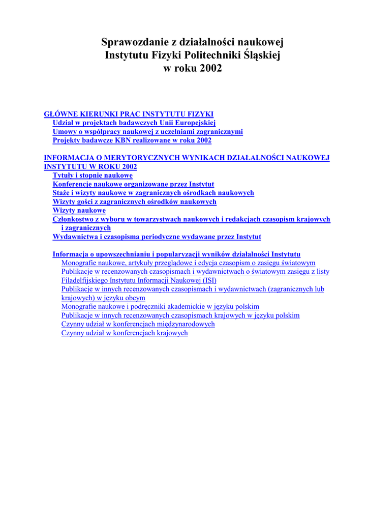 Sprawozdanie z działalności naukowej Instytutu Fizyki Politechniki Śląskiej w roku 2002 GŁÓWNE KIERUNKI PRAC INSTYTUTU FIZYKI Udział w projektach badawczych Unii Europejskiej Umowy o współpracy naukowej z uczelniami zagranicznymi Projekty badawcze KBN realizowane w roku 2002 INFORMACJA O MERYTORYCZNYCH WYNIKACH DZIAŁALNOŚCI NAUKOWEJ INSTYTUTU W ROKU 2002 Tytuły i stopnie naukowe Konferencje naukowe organizowane przez Instytut Staże i wizyty naukowe w zagranicznych ośrodkach naukowych Wizyty gości z zagranicznych ośrodków naukowych Wizyty naukowe Członkostwo z wyboru w towarzystwach naukowych i redakcjach czasopism krajowych i zagranicznych Wydawnictwa i czasopisma periodyczne wydawane przez Instytut Informacja o upowszechnianiu i popularyzacji wyników działalności Instytutu Monografie naukowe, artykuły przeglądowe i edycja czasopism o zasięgu światowym Publikacje w recenzowanych czasopismach i wydawnictwach o światowym zasięgu z listy Filadelfijskiego Instytutu Informacji Naukowej (ISI) Publikacje w innych recenzowanych czasopismach i wydawnictwach (zagranicznych lub krajowych) w języku obcym Monografie naukowe i podręczniki akademickie w języku polskim Publikacje w innych recenzowanych czasopismach krajowych w języku polskim Czynny udział w konferencjach międzynarodowych Czynny udział w konferencjach krajowych GŁÓWNE KIERUNKI PRAC INSTYTUTU FIZYKI W Instytucie Fizyki Politechniki Śląskiej prowadzone są w sposób ciągły badania naukowe w dyscyplinie fizyka, w 5 głównych kierunkach badawczych. Są to: − akustyka ciała stałego, − fizyka półprzewodników, − fizyka jądrowa stosowana, − mikroelektronika półprzewodników, − optoelektronika i optyka planarna. W ramach kierunku - akustyka ciała stałego - prowadzone są badania: − propagacji powierzchniowych fal akustycznych w strukturach planarnych, w szczególności w cienkich warstwach związków wielkocząsteczkowych, oraz wpływu adsorpcji gazów (szczególnie toksycznych) na własności akustyczne (sprężyste i lepkie) tych warstw, w aspekcie zastosowań sensorowych, − struktury ciał stałych, w tym warstw podpowierzchniowych i implantowanych, metodą mikroskopii fal termicznych (jedyne w kraju), − własności cieplnych materiałów metodami fototermicznymi (jedyne w kraju), − własności sprężystych i fotosprężystych kryształów, w tym mechanizmu tłumienia fal akustycznych i oddziaływania fonon-fonon, metodą spektroskopii akustycznej, − mechanizmu oddziaływania (dyfrakcji) światła laserowego na akustycznych falach powierzchniowych i objętościowych (jedyne w kraju). W ramach kierunku - fizyka ciała stałego - prowadzone są badania: − − − − − parametrów optycznych, rekombinacyjnych i kinetycznych cienkich warstw i układów warstwowych materiałów półprzewodnikowych metodami: transmisji optycznej, elipsometrii, skaterometrii, fotoprzewodnictwa, efektu fotomagnetoelektrycznego, magnetooporu i efektu Halla, przy współpracy m.in. z Uniwersytetami w Bari i Camerino (WŁOCHY) oraz w Iraklio (GRECJA), parametrów struktury energetycznej cienkich warstw półprzewodników, własności optycznych i cieplnych materiałów stomatologicznych poddawanych obróbce laserowej, nad fizycznym i matematycznym modelowaniem zjawisk mikro-strukturalnych, mechanicznych i termicznych w procesach kształtowania plastycznego metali i stopów, własności fizycznych warstw ceramicznych naniesionych na podłoża ceramiczne i poddanych obróbce laserowej. 2 W ramach kierunku - fizyka jądrowa stosowana - prowadzone są badania: − − − − − − − składu izotopowego węgla w środowisku współczesnym naturalnym i przekształconym antropogenicznie, przy współpracy ze Scottish Universities Research and Reactor Centre, NERC Radiocarbon Laboratory, University of Glasgow, East Kilbride (SZKOCJA), w zakresie technik datowania radiowęglowego i metod interpretacji wyników dla potrzeb archeologii i badań środowiska, przy współpracy z Laboratoire des Sciences du Climat et de l’Environnement, CNRS, Gif-sur-Yvette (FRANCJA), w dziedzinie datowania radiowęglowego stanowisk archeologicznych techniką ciekłoscyntylacyjną oraz pomiarów koncentracji izotopów węgla w środowisku, przy współpracy z Centre de Datation par le Radiocarbone, Universite Claude Bernard Lyon (FRANCJA) w dziedzinie datowania radiowęglowego i badań izotopowych stanowisk geologicznych i archeologicznych z obszaru Litwy, przy współpracy z Vilnius University (LITWA) nad interpretacją chronologicznej wyników datowań uzyskanych w ramach kontraktów badawczych lub współpracy naukowej z instytucjami krajowymi i zagranicznymi, nad wykorzystaniem radioaktywności 137Cs w glebach do oceny procesów erozji i datowania bardzo młodych osadów nad wykorzystaniem optycznie stymulowanej luminescencji do datowania obiektów geologicznych i archeologicznych. W ramach kierunku - mikroelektronika półprzewodników - prowadzone są badania: − − − własności elektronowych powierzchni i granic fazowych półprzewodników grupy III-V (GaAs, InP), przy współpracy z Ecole Centrale de Lyon (FRANCJA), University B. Pascal Clemont-Ferrand (FRANCJA), oraz Hokkaido University, Sapporo (JAPONIA), w aspekcie zastosowań w nanoelektronice, własności fizykochemicznych i elektronowych cienkich warstw półprzewodników tlenkowych (SnO2) metodami spektroskopii elektronowej i fotoelektronowej, przy współpracy z Centre of Microelectronics, Lecce (WŁOCHY) oraz University of Tübingen (NIEMCY), w aspekcie zastosowań sensorowych, własności elektronowych i strukturalnych cienkich warstw półprzewodników organicznych (ftalocyjanin metali przejściowych) metodami spektroskopii fotoelektronowej (UPS, XPS) oraz mikroskopii sił atomowych (AFM) (jedyne w kraju), w aspekcie zastosowań sensorowych. W ramach kierunku - optoelektronika i optyka planarna - prowadzone są badania: − − − − propagac