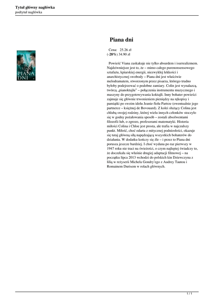 Tytuł główny nagłówka podtytuł nagłówka Piana dni Cena: 25.26 zł (-28%) 34.90 zł Powieść Viana zaskakuje nie tylko absurdem i isurrealizmem. Najdziwniejsze jest to, że – mimo całego purenonsensowego sztafażu, kpiarskiej energii, niezwykłej lekkości i anarchistycznej swobody – Piana dni jest właściwie melodramatem, stworzonym przez pisarza, którego trudno byłoby podejrzewać o podobne zamiary. Colin jest wynalazcą, twórcą „pianoktajlu” – połączenia instrumentu muzycznego i maszyny do przygotowywania koktajli. Inny bohater powieści zajmuje się głównie trwonieniem pieniędzy na rękopisy i pamiątki po swoim idolu Jeanie-Solu Partrze (ewentualnie jego partnerce – księżnej de Bovouard). Z kolei służący Colina jest chlubą swojej rodziny, której wielu innych członków stoczyło się w godny pożałowania sposób – zostali absolwentami filozofii lub, o zgrozo, profesorami matematyki. Historia miłości Colina i Chloe jest prosta, ale trafia w najczulszy punkt. Miłość, choć odarta z mitycznej podniosłości, okazuje się tutaj główną siłą napędzającą wszystkich bohaterów do działania. W dodatku kończy się źle – i przez to Piana dni porusza jeszcze bardziej. I choć wydana po raz pierwszy w 1947 roku nie traci na świeżości, o czym najlepiej świadczy to, że doczekała się właśnie drugiej adaptacji filmowej – na początku lipca 2013 wchodzi do polskich kin Dziewczyna z lilią w reżyserii Michela Gondry’ego z Audrey Tautou i Romainem Durisem w rolach głównych. 1/1 Powered by TCPDF (www.tcpdf.org)
