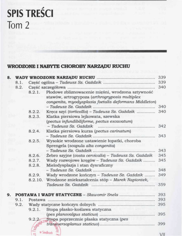 SPIS TREŚCI Tom 2 WRODZONE I NABYTE CHOROBY NARZĄDU RUCHU 8. 9. WADY WRODZONE NARZĄDU RUCHU 8.1. Część ogólna - Tadeusz Sz. Gaździk 8.2. Część szczegółowa 8.2.1. Płodowe zbliznowacenie mięśni, wrodzona sztywność stawów, artrogrypoza (arthrogryposis multiplex congenita, myodysplasia foetalis deformans Middleton) - Tadeusz Sz. Gaździk 8.2.2. Kręcz szyi (torticolliś) - Tadeusz Sz. Gaździk 8.2.3. Klatka piersiowa lejkowata, szewska (pectus injundibiliforme, pectus excavatum) - Tadeusz Sz. Gaździk 8.2.4. Klatka piersiowa kurza (pectus cańnatum) - Tadeusz Sz. Gaździk 8.2.5. Wysokie wrodzone ustawienie łopatki, choroba Sprengela (scapula alta congenita) - Tadeusz Sz. Gaździk 8.2.6. Żebro szyjne (costa ceruicalis) - Tadeusz Sz. Gaździk 8.2.7. Wady rozwojowe kręgów - Tadeusz Sz. Gaździk 8.2.8. Mielodysplazja i stan dysraficzny - Tadeusz Sz. Gaździk 8.2.9. Wady wrodzone kończyn - Tadeusz Sz. Gaździk 8.2.10. Wrodzone zniekształcenia stóp - Marek Napiontek, Tadeusz Sz. Gaździk POSTAWA I WADY STATYCZNE - Sławomir Snela 9.1. Postawa 9.2. Wady statyczne kończyn dolnych 9.2.1. Stopa płasko-koślawa statyczna (pes planovalgus staticuś) >tepa poprzecznie płaska statyczna (pes transversoplanus staticuś) r %\ g "Sttltod, i 339 339 340 340 340 342 343 343 345 345 348 349 359 393 393 395 395 399 V|| SPIS TREŚCI 9.2.3. 9.2.4. 9.2.5. Kolana koślawe (genua ualga) Kolana szpotawe (genua uara) Paluch koślawy (hallwc ualgus) 10. DEFORMACJE KRĘGOSŁUPA U DZIECI I MŁODZIEŻY - Daniel Zarzycki 10.1. Klasyfikacja deformacji kręgosłupa 10.2. Boczne idiopatyczne skrzywienie kręgosłupa 10.2.1. Charakterystyka skolioz idiopatycznych 10.2.2. Naturalna historia bocznych idiopatycznych skrzywień kręgosłupa 10.3. Wrodzone skrzywienia (deformacje) kręgosłupa 10.3.1. Naturalna historia wrodzonych skrzywień kręgosłupa 11. JAŁOWE MARTWICE KOŚCI (NECROSIS ASEPTICA OSSIUM, NECROSISISCHEMICA APOPHYSITIS, CHONDROOSTEONECROSIS) -Andrzej Grzegorzewski, Marek Synder 11.1. Wiadomości ogólne 11.2. Jałowa martwica głowy kości udowej, choroba Calvego-Legga-Perthesa, choroba Perthesa (osteochondrosis coxae iuuenilis, osteochondropathia deformans coxae iuuenilis) 11.3. Martwica guzowatości kości piszczelowej, choroba Osgooda-Schlattera (necrosis aseptica tuberositas tibiae, morbus Osgood-Schlatter) 11.4. Jałowa martwica głowy II kości śródstopia (necrosis aseptica capitis ossis metatarsi II, morbus Freiberg, s. Kohlerll) 11.5. Jałowa martwica guza piętowego (morbus Haglund-Sever, apophysitis calcanei) 11.6. Jałowa martwica kości łódkowatej stopy (morbus Kóhler) 11.7. Martwica kości księżycowatej, choroba Kienbócka (necrosis aseptica ossis lunati, morbus Kienbóck) 11.8. Oddzielająca martwica kostno-chrzęstna, choroba Kóniga (osteochondrosis dissecans) 11.9. Chrzęstniakowatość stawów (chondromatosis, osteochondromatosiś) 12. ZNIEKSZTAŁCENIA I DYSFUNKCJE NARZĄDU RUCHU W CHOROBACH UKŁADU NERWOWO-MIĘŚNIOWEGO 12.1. Mózgowe porażenie dziecięce - Marek Jóźwiak 12.1.1. Postępowanie ortopedyczne w mózgowym porażeniu dziecięcym 12.2. Jamistość rdzenia (syńngomyelia) - Tadeusz Sz. Goździk 12.3. Wiąd rdzenia (tabes dorsalis) - Tadeusz Sz. Goździk 12.4. Porażenia i niedowłady wiotkie - Tadeusz Sz. Goździk 12.4.1. Porażenie dziecięce, choroba Heinego-Medina (poliomyelitis anteńor acuta) VIII 400 403 404 407 407 408 409 414 424 427 433 433 434 445 447 449 450 452 453 455 457 457 457 466 467 468 468 SPIS TREŚCI 13. ZABURZENIA NERWOWE POCHODZENIA OBWODOWEGO - Tadeusz Sz. Gaździk 470 13.1. Zespół ciasnoty kanału nadgarstka (syndroma canalis carpi\ .. 470 13.2. Zespół kanału Guyona (syndroma canalis Guyoni) 471 13.3. Zespół rowka nerwu łokciowego (syndroma sulcus nervi ulnańs) 471 13.4. Choroba Mortona (morbus Mortoni) 472 14. ZMIANY ZWYRODNIENIOWE STAWÓW, CHOROBA ZWYRODNIENIOWA, ZNIEKSZTAŁCAJĄCE ZAPALENIE STAWÓW (ARTHROSIS DEFORMANS, OSTEOARTHROSIS, ARTHRITIS DEFORMANS, OSTEOARTHRITIS) - Tadeusz Sz. Gaździk 14.1. Wiadomości ogólne 14.2. Zmiany zwyrodnieniowe kręgosłupa i stawów międzykręgowych (spondylosis et spondyloarthrosis) 14.2.1. Choroba Baastrupa (morbus Baastrupi) 14.3. Zmiany zwyrodnieniowe stawu biodrowego (coxarthrosis) 14.3.1. Choroba Otto-Chrobaka (protrusio acetabuli intrapeluica) 14.3.2. Samoistna martwica głowy kości udowej u dorosłych (necrosis idiopathica capitis femońs) 14.4. Zmiany zwyrodnieniowe stawu kolanowego (gonarthrosis) 14.5. Zmiany zwyrodnieniowe stawu rzepkowo-udowego (arthrosis art. patello-femoralis) 14.6. Zmiany zwyrodnieniowe stawu ramiennego (omarthrosiś) 14.7. Zmiany zwyrodnieniowe stawu łokciowego (arthrosis cubiti) .... 15. CHOROBY ŚCIĘGIEN, WIĘZADEŁ I TKANKI ŁĄCZNEJ -TadeuszSz. Gaździk 15.1. Przykurcz Dupuytrena (contractura Dupuytreni) 15.2. Zapalenie kaletki maziowej (bursitis) 15.3. Zmiany zwyrodnieniowe i odczynowo-zapalne pochewek ścięgnistych (tendovaginitis) 15.3.1. Zespół de Quervaina, choroba de Quervaina (tendovaginitis stenosans musculi abductońs longi et extensońs breuis pollicis) 15.3.2. Palec przeskakujący, trzaskający, strzelający (tendouaginitis stenosans) 15.4. Torbiel galaretowata (ganglion) 15.5. Ostroga piętowa (calcar calcanei) 15.6. Tenopatie 15.6.1. Entezopatia nadkłykcia bocznego kości ramiennej, łokieć tenisisty (enthesopathia epicondyli lateralis humeń, epicondylitis radii) 473 473 474 477 477 480 480 481 484 484 485 486 486 487 488 488 488 489 489 489 490 IX SPIS TREŚCI 15.6.2. Entezopatia nadkłykcia przyśrodkowego kości ramiennej, łokieć golfisty (enthesopathia epicondyli medialis humeń) 490 15.6.3. Zapalenie okołostawowe kolana (peńarthńtis genu, epicondylitis genu) 491 15.6.4. Zapalenie okołostawowe biodra (peńarthńtis coxae) ... 491 15.6.5. Entezopatia ścięgna piętowego (enthesopathia AchiUis) ... 491 15.7. Zespół bolesnego barku (peńarthńtis humeroscapulańs, frozen shoulder) 491 15.8. Biodro trzaskaj