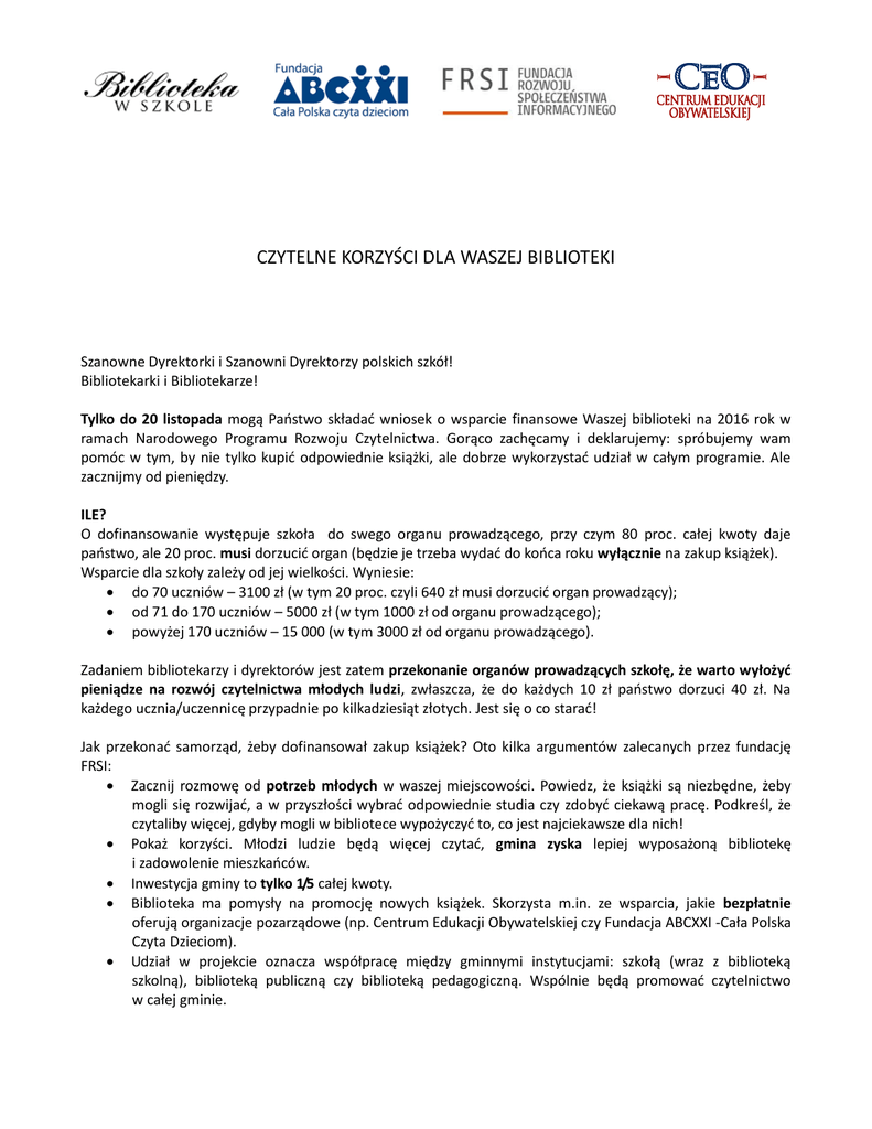 CZYTELNE KORZYŚCI DLA WASZEJ BIBLIOTEKI Szanowne Dyrektorki i Szanowni Dyrektorzy polskich szkół! Bibliotekarki i Bibliotekarze! Tylko do 20 listopada mogą Państwo składać wniosek o wsparcie finansowe Waszej biblioteki na 2016 rok w ramach Narodowego Programu Rozwoju Czytelnictwa. Gorąco zachęcamy i deklarujemy: spróbujemy wam pomóc w tym, by nie tylko kupić odpowiednie książki, ale dobrze wykorzystać udział w całym programie. Ale zacznijmy od pieniędzy. ILE? O dofinansowanie występuje szkoła do swego organu prowadzącego, przy czym 80 proc. całej kwoty daje państwo, ale 20 proc. musi dorzucić organ (będzie je trzeba wydać do końca roku wyłącznie na zakup książek). Wsparcie dla szkoły zależy od jej wielkości. Wyniesie: do 70 uczniów – 3100 zł (w tym 20 proc. czyli 640 zł musi dorzucić organ prowadzący); od 71 do 170 uczniów – 5000 zł (w tym 1000 zł od organu prowadzącego); powyżej 170 uczniów – 15 000 (w tym 3000 zł od organu prowadzącego). Zadaniem bibliotekarzy i dyrektorów jest zatem przekonanie organów prowadzących szkołę, że warto wyłożyć pieniądze na rozwój czytelnictwa młodych ludzi, zwłaszcza, że do każdych 10 zł państwo dorzuci 40 zł. Na każdego ucznia/uczennicę przypadnie po kilkadziesiąt złotych. Jest się o co starać! Jak przekonać samorząd, żeby dofinansował zakup książek? Oto kilka argumentów zalecanych przez fundację FRSI: Zacznij rozmowę od potrzeb młodych w waszej miejscowości. Powiedz, że książki są niezbędne, żeby mogli się rozwijać, a w przyszłości wybrać odpowiednie studia czy zdobyć ciekawą pracę. Podkreśl, że czytaliby więcej, gdyby mogli w bibliotece wypożyczyć to, co jest najciekawsze dla nich! Pokaż korzyści. Młodzi ludzie będą więcej czytać, gmina zyska lepiej wyposażoną bibliotekę i zadowolenie mieszkańców. Inwestycja gminy to tylko 1/5 całej kwoty. Biblioteka ma pomysły na promocję nowych książek. Skorzysta m.in. ze wsparcia, jakie bezpłatnie oferują organizacje pozarządowe (np. Centrum Edukacji Obywatelskiej czy Fundacja ABCXXI -Cała Polska Czyta Dzieciom). Udział w projekcie oznacza współpracę między gminnymi instytucjami: szkołą (wraz z biblioteką szkolną), biblioteką publiczną czy biblioteką pedagogiczną. Wspólnie będą promować czytelnictwo w całej gminie. JAK? Wniosek składa dyrektor/ka szkoły. Wniosek jest krótki i według MEN powinien wyglądać tak: https://men.gov.pl/finansowanie-edukacji/narodowy-program-rozwoju-czytelnictwa/wniosek-dyrektoraszkoly_biblioteki-pedagogicznej1-2.html; Warto przed jego wypełnieniem skontaktować się z organem prowadzącym, a także poszperać na stronach kuratorium i urzędu wojewódzkiego; niewykluczone np., że twój wojewoda opublikowali dodatkowe wskazówki czy generatory wniosków w trybie online. Uwaga! Nawet jeśli wniosek przepadnie tym razem, będzie rozpatrywany w pierwszej kolejności w następnych latach. Państwo obiecało bibliotekom szkolnym i pedagogicznym wsparcie po 30 milionów rocznie w latach 2016-2020. CO? Jakie książki wybrać? To zależy wyłącznie od szkoły (co nie oznacza decyzji odgórnej i arbitralnej – patrz niżej). Rząd określił tylko, że nie można kupować podręczników. Może to być literatura piękna (w tym lektury), literatura faktu, popularnonaukowa. Mogą być e-booki. Najważniejsze, by książki były ciekawe, mądre, rozwijające i by dzieci i młodzież chciała je czytać. I żeby dobrze wpisywały się w cały program. Możecie skorzystać z naszych sugestii dla młodszych dzieci: www.calapolskaczytadzieciom.pl/zlota-lista; www.ceo.org.pl/sites/default/files/SZK20/Wiesci_ze_szkol/infografikaczytanie.pdf Można zainspirować się wynikami akcji Ogólnopolskie Wybory Książek, w której wzięło udział 450 tys. uczniów z 2,4 tys. Szkół: www.wyboryksiazek.pl PO CO? Sam wybór książek to mało, w programie chodzi o coś więcej. Zakup książek musi wpisać się w zaplanowane przez szkołę (i w skrócie opisane we wniosku) działania promujące czytelnictwo oraz we współpracę przede wszystkim z miejscową biblioteką publiczną. Zakupione książki mają być zatem tylko elementem rozczytywania szkolnej i lokalnej społeczności. To ma sens prawda? Dokładniej rzecz biorąc szkoła powinna: • zasięgnąć opinii rodziców i uczniów już przy wyborze książek (taka konsultacja może się odbyć podczas lekcji, spotkania społeczności szkolnej albo poprzez ankietę, ewentualnie mejlem – pamiętajcie, że czas Was goni...); • podjąć współpracę z biblioteką publiczną lub pedagogiczną, wspólnie zaplanować zakupy (np. żeby się książki nie dublowały), informować się nawzajem o wydarzeniach promujących czytelnictwo i w ogóle nawzajem wspierać i wymieniać informacjami – nazywamy to budowaniem mostów); • zorganizować rocznie co najmniej jedno wydarzenie promujące czytelnictwo z udziałem uczniów; Oto kilka linków do propozycji ciekawych akcji proczytelniczych wypracowanych przez CEO: www.ceo.org.pl/sites/default/files/news-files/tydzien_czytania_-_inspiracje.pdf www.ceo.org.pl/sites/default/files/news-files/propozycje_akcji_czytelniczych_od_koordynatorow_szk_2.0.pdf I jeszcze podsumowanie „Tygodnia czytania" w Szkole z Klasą 2.0 (a w tekście linki do opisów działań w szkołach): www.ceo.org.pl/pl/szkolazklasa2zero/news/tydzien-czytania-podsumowanie Uwaga! Można też będzie wykorzystać kampanię „Noc bibliotek”, której finał odbędzie się 4 czerwca 2016. Zobacz jak wyglądała „Noc” w 2015 roku, ile w niej wzięło udział szkół, ile tam było doskonałych pomysłów! http://nocbibliotek.org/ Zajrzyj też do pierwszych zapowiedzi „Nocy Bibliotek” 2016 http://nocbibliotek.org/?p=1564 • • zorganizować co najmniej jedno spotkanie z rodzicami na temat wpływu czytania na rozwój dzieci i młodzieży (może być przy okazji wywiadówki, święta szkoły itd.