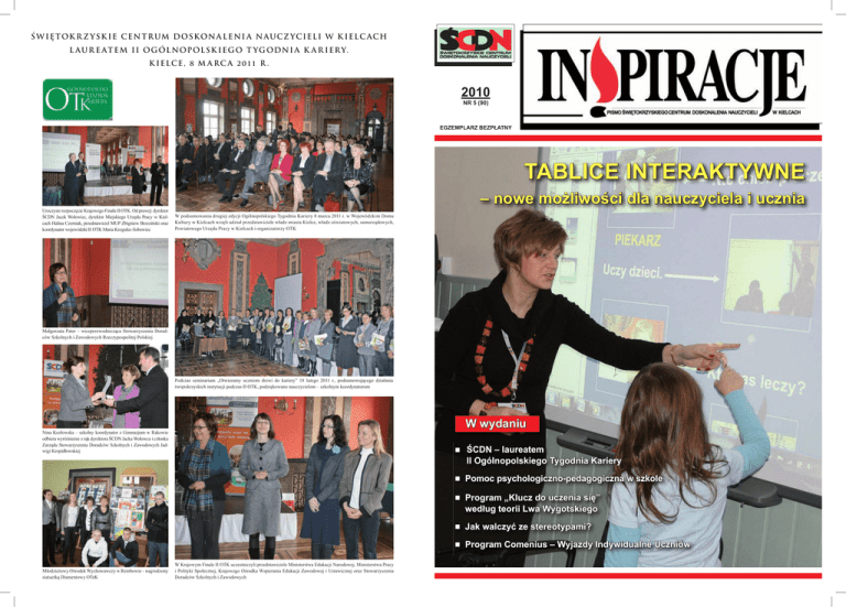 Ś W I Ę TOK R Z Y SK I E C E N T R UM D OSK ON A L E N I A N AUC Z YC I EL I W K I EL C AC H L AU R E AT E M I I O G ÓL NOP OL SK I E G O T YG ODN I A K A R I ER Y. K I EL C E , M A R C A R . 2010 NR 5 (90) EGZEMPLARZ BEZPŁATNY TABLICE INTERAKTYWNE – nowe możliwości dla nauczyciela i ucznia Uroczyste rozpoczęcie Krajowego Finału II OTK. Od prawej: dyrektor ŚCDN Jacek Wołowiec, dyrektor Miejskiego Urzędu Pracy w Kielcach Halina Czerniak, przedstawiciel MUP Zbigniew Brzeziński oraz koordynator wojewódzki II OTK Maria Krogulec-Sobowiec W podsumowaniu drugiej edycji Ogólnopolskiego Tygodnia Kariery 8 marca 2011 r. w Wojewódzkim Domu Kultury w Kielcach wzięli udział przedstawiciele władz miasta Kielce, władz oświatowych, samorządowych, Powiatowego Urzędu Pracy w Kielcach i organizatorzy OTK Małgorzata Pater – wiceprzewodnicząca Stowarzyszenia Doradców Szkolnych i Zawodowych Rzeczypospolitej Polskiej Podczas seminarium „Otwieramy uczniom drzwi do kariery” 18 lutego 2011 r., podsumowującego działania świętokrzyskich instytucji podczas II OTK, podziękowano nauczycielom – szkolnym koordynatorom W wydaniu Nina Kozłowska – szkolny koordynator z Gimnazjum w Rakowie odbiera wyróżnienie z rąk dyrektora ŚCDN Jacka Wołowca i członka Zarządu Stowarzyszenia Doradców Szkolnych i Zawodowych Jadwigi Kropidłowskiej Q ŚCDN – laureatem II Ogólnopolskiego Tygodnia Kariery QPomoc psychologiczno-pedagogiczna w szkole QProgram „Klucz do uczenia się” według teorii Lwa Wygotskiego QJak walczyć ze stereotypami? QProgram Młodzieżowy Ośrodek Wychowawczy w Rembowie – nagrodzony statuetką Diamentowy OTeK W Krajowym Finale II OTK uczestniczyli przedstawiciele Ministerstwa Edukacji Narodowej, Ministerstwa Pracy i Polityki Społecznej, Krajowego Ośrodka Wspierania Edukacji Zawodowej i Ustawicznej oraz Stowarzyszenia Doradców Szkolnych i Zawodowych Comenius – Wyjazdy Indywidualne Uczniów doradztwo zawodowe w województwie świętokrzyskim od redakcji Szanowni Czytelnicy, PISMO ŚWIĘTOKRZYSKIEGO CENTRUM DOSKONALENIA NAUCZYCIELI W KIELCACH REDAKCJA BARBARA SKARŻYŃSKA ZDJĘCIA MARTYNA GŁĘBOCKA ADRES REDAKCJI ŚCDN, ul. Marszałka Józefa Piłsudskiego 42 25-431 Kielce TELEFONY 041 362 45 48 041 362 45 13 tel./fax 41 362 48 99 DRUK Oficyna Drukarska Jacek Chmielewski Warszawa Redakcja zastrzega sobie prawo do dokonywania skrótów w tekstach artykułów i zmiany tytułów. Nie odpowiadamy za treść płatnych reklam i ogłoszeń. „Inspiracje” rozprowadzane są bezpłatnie. Zainteresowanych naszym pismem zapraszamy do siedziby ŚCDN - Redakcja „Inspiracji”, pok. 17. Zapraszamy na stronę internetową ŚCDN www.scdn.pl ISSN 1428-5479 NA OKŁADCE: KONSULTANT ŚCDN KATARZYNA PLUTA PODCZAS ZAJĘĆ Z UCZNIAMI KL. I W RAMACH PROJEKTU „OTWARTA TWOJA KARIERA” w Roku Odkrywania Talentów, jakim został ogłoszony przez Ministerstwo Edukacji Narodowej rok szkolny 2010/2011, polecamy rozmowę z prof. Teresą Gizą z Wszechnicy Świętokrzyskiej o miejscu ucznia zdolnego w szkolnej rzeczywistości i ważnej misji szkoły w wyławianiu talentów dzieci i młodzieży. W tym kontekście bardzo ważna jest nowa organizacja pomocy psychologiczno-pedagogicznej w szkołach i placówkach oświatowych, która ma zapewnić rozpoznanie indywidualnych potrzeb rozwojowych i edukacyjnych każdego ucznia oraz ich zaspokojenie poprzez udzielenie mu odpowiedniego wsparcia. Zachęcamy do lektury artykułu, w którym szczegółowo zostały omówione zmiany prawne dotyczące pomocy psychologiczno-pedagogicznej. Wiele miejsca poświęcamy w tym wydaniu tekstom pisanym przez nauczycieli, którzy chcieli podzielić się swoimi doświadczeniami z pracy z uczniami, także tymi związanymi z wykorzystaniem nowoczesnych pomocy dydaktycznych, pokazać dobrą praktykę zarządzania szkołą opartą na budowaniu zaufania, zachęcić do wykorzystywania sprawdzonych metod doskonalenia własnego warsztatu pracy. Trwają szkolenia metodyczne nauczycieli województwa świętokrzyskiego w ramach projektu „Nauczyciel XXI wieku”, realizowanego przez Świętokrzyskie Centrum Doskonalenia Nauczycieli, który przygotowuje ich do podjęcia nowych wyzwań związanych z tworzeniem i prowadzeniem lekcji z wykorzystaniem tablicy interaktywnej. W specjalnych dodatkach opisujemy kolejne etapy realizacji projektu i pierwsze doświadczenia trenerów metodycznych wyniesione z zajęć z nauczycielami. Zapraszamy do lektury. Redakcja „Inspiracji” SPIS TREŚCI • Martyna Głębocka By talent nie nudził się w szkole – rozmowa z prof. dr hab. Teresą Gizą, wykładowcą Wszechnicy Świętokrzyskiej .................................................................................................. 3–4 • Małgorzata Jarosińska, Małgorzata Jas Nowa organizacja pomocy psychologiczno-pedagogicznej w szkole .......................................................... 5–7 • MartynaG łębocka By gąsienice chciały pofrunąć – rozmowa z psycholog Galiną Dolya – światowej sławy ekspertem w zakresie teorii Lwa Wygotskiego ................................................................. 8 • KatarzynaP luta Podążać za dzieckiem – teoria Lwa Wygotskiego podstawą wszechstronnego rozwoju dziecka .................................................... 9–10 • MartynaG łębocka Uczący się uczeń, uczący się nauczyciel, ucząca się szkoła ..................................................................... 11–12 • BernadetaM echelewska Stereotypy i ich wpływ na nasze życie ...................................................................................................... 13–14 • MariaB ednarska Wyjazdy Indywidualne Uczniów – „Mały Erazmus” ..................................................................................... 15 • KamilaS zymańska Metoda projektów w rozwijaniu kompetencji kluczowych ...........................................................