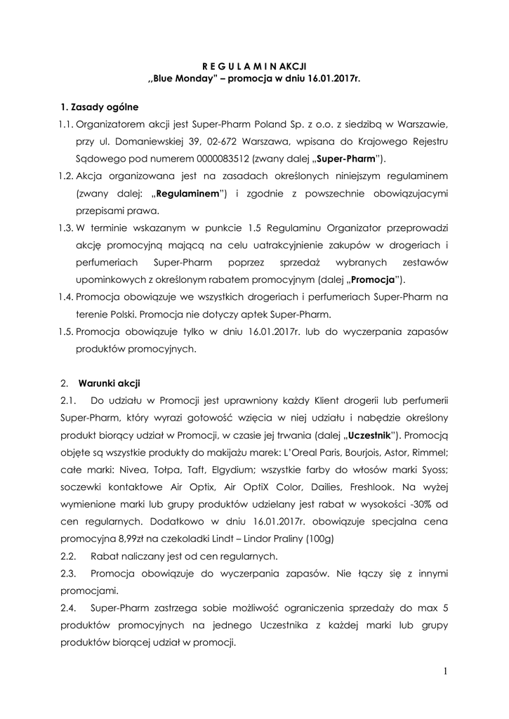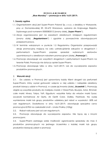 R E G U L A M I N AKCJI ,,Blue Monday” – promocja w dniu 16.01.2017r. 1. Zasady ogólne 1.1. Organizatorem akcji jest Super-Pharm Poland Sp. z o.o. z siedzibą w Warszawie, przy ul. Domaniewskiej 39, 02-672 Warszawa, wpisana do Krajowego Rejestru Sądowego pod numerem 0000083512 (zwany dalej „Super-Pharm”). 1.2. Akcja organizowana jest na zasadach określonych niniejszym regulaminem (zwany dalej: „Regulaminem”) i zgodnie z powszechnie obowiązujacymi przepisami prawa. 1.3. W terminie wskazanym w punkcie 1.5 Regulaminu Organizator przeprowadzi akcję promocyjną mającą na celu uatrakcyjnienie zakupów w drogeriach i perfumeriach Super-Pharm poprzez sprzedaż wybranych zestawów upominkowych z określonym rabatem promocyjnym (dalej „Promocja”). 1.4. Promocja obowiązuje we wszystkich drogeriach i perfumeriach Super-Pharm na terenie Polski. Promocja nie dotyczy aptek Super-Pharm. 1.5. Promocja obowiązuje tylko w dniu 16.01.2017r. lub do wyczerpania zapasów produktów promocyjnych. 2. 2.1. Warunki akcji Do udziału w Promocji jest uprawniony każdy Klient drogerii lub perfumerii Super-Pharm, który wyrazi gotowość wzięcia w niej udziału i nabędzie określony produkt biorący udział w Promocji, w czasie jej trwania (dalej „Uczestnik”). Promocją objęte są wszystkie produkty do makijażu marek: L’Oreal Paris, Bourjois, Astor, Rimmel; całe marki: Nivea, Tołpa, Taft, Elgydium; wszystkie farby do włosów marki Syoss; soczewki kontaktowe Air Optix, Air OptiX Color, Dailies, Freshlook. Na wyżej wymienione marki lub grupy produktów udzielany jest rabat w wysokości -30% od cen regularnych. Dodatkowo w dniu 16.01.2017r. obowiązuje specjalna cena promocyjna 8,99zł na czekoladki Lindt – Lindor Praliny (100g) 2.2. Rabat naliczany jest od cen regularnych. 2.3. Promocja obowiązuje do wyczerpania zapasów. Nie łączy się z innymi promocjami. 2.4. Super-Pharm zastrzega sobie możliwość ograniczenia sprzedaży do max 5 produktów promocyjnych na jednego Uczestnika z każdej marki lub grupy produktów biorącej udział w promocji. 1 2.5. Super-Pharm zastrzega sobie prawo do wcześniejszego zakończenia Promocji lub do zmian w ofercie promocyjnej w każdej chwili. 3. 3.1. Reklamacje Uczestnikowi przysługuje prawo wniesienia reklamacji związanej z akcją promocyjną. Reklamację można zgłosić w formie elektronicznej poprzez przesłanie wiadomości e-mail na adres [email protected] wpisując w tytule wiadomości „Reklamacja: akcja promocyjna Blue Monday w dn.16.01.2017r.” albo w formie pisemnej na adres Organizatora z dopiskiem na kopercie, o którym mowa powyżej. Reklamację można wnieść w okresie trwania akcji oraz w okresie 7 (siedmiu) dni od dnia jego zakończenia. 3.2. Reklamacja powinna zawierać dane uczestnika: imię, nazwisko, adres korespondencyjny, adres e-mail oraz przyczynę reklamacji wraz z jej uzasadnieniem. Reklamacje niespełniające warunków, o których mowa w zdaniu poprzednim nie będą rozpatrywane. 3.3. Organizator rozpatrzy reklamację w terminie 14 (czternastu) dni od dnia ich otrzymania, chyba, że ze względów niezależnych od Organizatora okres ten będzie musiał zostać wydłużony. Uczestnik zostanie powiadomiony o rozpatrzeniu reklamacji niezwłocznie za pośrednictwem poczty elektronicznej, na adres e-mail podany w zgłoszeniu reklamacyjnym lub pocztą. 4. Postanowienia końcowe. 4.1. Niniejszy regulamin dostępny jest w punktach biorących udział w akcji promocyjnej, na stronie internetowej Organizatora oraz siedzibie Organizatora. 4.2. Organizator zastrzega, że nie ponosi odpowiedzialności za zdarzenia uniemożliwiające prawidłowe przeprowadzenie Promocji, których nie był w stanie przewidzieć lub którym nie mógł zapobiec, w szczególności w przypadku zaistnienia zdarzeń losowych, w tym siły wyższej. Wszelkie zmiany Regulaminu, będą dokonywane w drodze pisemnej i udostępnione w siedzibie Organizatora, w drogeriach Super-Pharm oraz na stronie internetowej www.superpharm.pl. Zmiana Regulaminu obowiązuje z dniem jej publikacji. 2 Organizator zastrzega sobie prawo do zmiany postanowień niniejszego Regulaminu w każdym czasie, w tym również w czasie trwania Promocji. 4.3. Niniejszy Regulamin obowiązuje w dniu 16.01.2017r. 3