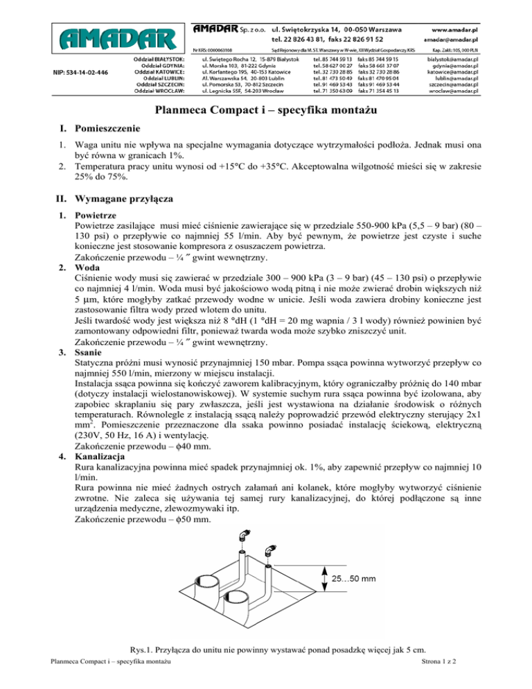 Planmeca Compact i – specyfika montaŜu I. Pomieszczenie 1. Waga unitu nie wpływa na specjalne wymagania dotyczące wytrzymałości podłoŜa. Jednak musi ona być równa w granicach 1%. 2. Temperatura pracy unitu wynosi od +15°C do +35°C. Akceptowalna wilgotność mieści się w zakresie 25% do 75%. II. Wymagane przyłącza 1. Powietrze Powietrze zasilające musi mieć ciśnienie zawierające się w przedziale 550-900 kPa (5,5 – 9 bar) (80 – 130 psi) o przepływie co najmniej 55 l/min. Aby być pewnym, Ŝe powietrze jest czyste i suche konieczne jest stosowanie kompresora z osuszaczem powietrza. Zakończenie przewodu – ¼ ″ gwint wewnętrzny. 2. Woda Ciśnienie wody musi się zawierać w przedziale 300 – 900 kPa (3 – 9 bar) (45 – 130 psi) o przepływie co najmniej 4 l/min. Woda musi być jakościowo wodą pitną i nie moŜe zwierać drobin większych niŜ 5 µm, które mogłyby zatkać przewody wodne w unicie. Jeśli woda zawiera drobiny konieczne jest zastosowanie filtra wody przed wlotem do unitu. Jeśli twardość wody jest większa niŜ 8 °dH (1 °dH = 20 mg wapnia / 3 l wody) równieŜ powinien być zamontowany odpowiedni filtr, poniewaŜ twarda woda moŜe szybko zniszczyć unit. Zakończenie przewodu – ¼ ″ gwint wewnętrzny. 3. Ssanie Statyczna próŜni musi wynosić przynajmniej 150 mbar. Pompa ssąca powinna wytworzyć przepływ co najmniej 550 l/min, mierzony w miejscu instalacji. Instalacja ssąca powinna się kończyć zaworem kalibracyjnym, który ograniczałby próŜnię do 140 mbar (dotyczy instalacji wielostanowiskowej). W systemie suchym rura ssąca powinna być izolowana, aby zapobiec skraplaniu się pary zwłaszcza, jeśli jest wystawiona na działanie środowisk o róŜnych temperaturach. Równolegle z instalacją ssącą naleŜy poprowadzić przewód elektryczny sterujący 2x1 mm2. Pomieszczenie przeznaczone dla ssaka powinno posiadać instalację ściekową, elektryczną (230V, 50 Hz, 16 A) i wentylację. Zakończenie przewodu – φ40 mm. 4. Kanalizacja Rura kanalizacyjna powinna mieć spadek przynajmniej ok. 1%, aby zapewnić przepływ co najmniej 10 l/min. Rura powinna nie mieć Ŝadnych ostrych załamań ani kolanek, które mogłyby wytworzyć ciśnienie zwrotne. Nie zaleca się uŜywania tej samej rury kanalizacyjnej, do której podłączone są inne urządzenia medyczne, zlewozmywaki itp. Zakończenie przewodu – φ50 mm. Rys.1. Przyłącza do unitu nie powinny wystawać ponad posadzkę więcej jak 5 cm. Planmeca Compact i – specyfika montaŜu Strona 1 z 2 5. Zasilanie Do unitu konieczne jest doprowadzenie zasilania 220 - 240 V przewodem z uziemieniem (3x1,5 mm2 min.). 6. Dodatkowo Jeśli na unicie planuje się montaŜ monitora, kamery wewnątrzustnej, czy aparatu rentgenowskiego do zdjęć punktowych (tylko Planmeca Intra) wraz z radiografią cyfrową Dixi2/3 to konieczne jest poprowadzenie rurki (tzw. peszla) o średnicy 50 mm od unitu do miejsca, w którym stał będzie komputer. W tym peszlu powinny znaleźć się następujące przewody (lub miejsce na nie): VGA przedłuŜacz – monitor, S-Video lub Composite – kamera wewnątrzustna, UTP 5cat. – radiografia Dixi2/3, 2x1,5 m m2 – dzwonek, otwarcie drzwi itp. Nawet jeśli klient nie instaluje, Ŝadnego z powyŜszych urządzeń dodatkowych, zaleca się, jeśli istnieje taka moŜliwość, poprowadzenie samego peszla z przeciągniętym drutem tzw. „pilotem”. III. Instalacja Wraz z unitem dostarczany jest wzór montaŜowy wykonany 1:1 obrazujący miejsca, w których powinny znajdować się przyłącza oraz punkty mocujące unit do podłoŜa. Wzór ten moŜna zamówić w serwisie firmy Amadar, aby podczas prac remontowo/budowlanych w gabinecie przygotować odpowiednie przyłącza. Rys.2. Wzór montaŜowy unitu wraz z przyłączeniami i mocowaniem. Koniecznej jest przymocowanie unitu do podłoŜa za pomocą śrub (Rys.2. miejsca oznaczone kółkiem), dlatego naleŜy wcześniej poinformować o istniejącej instalacji ogrzewania podłogowego, przebiegu instalacji hydraulicznej lub elektrycznej. Szczegółowy cennik usług dodatkowych znajduje się w ofercie usług serwisu firmy Amadar Sp. z o. o. Szczegółowe wymiary urządzenia znajdują się w instrukcji instalacyjnej, technicznej oraz uŜytkownika. W przypadku napotkania jakichkolwiek trudności z dostosowaniem gabinetu do wymogów przedstawionych w niniejszej instrukcji prosimy o bezpośredni kontakt z działem serwisu AMADAR a w szczególności: Pan Zygmunt Wojciechowski – 0603/956-993 Pan Bogusław Szpakowski – 0602/481-317 Planmeca Compact i – specyfika montaŜu Strona 2 z 2
