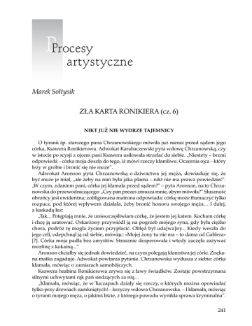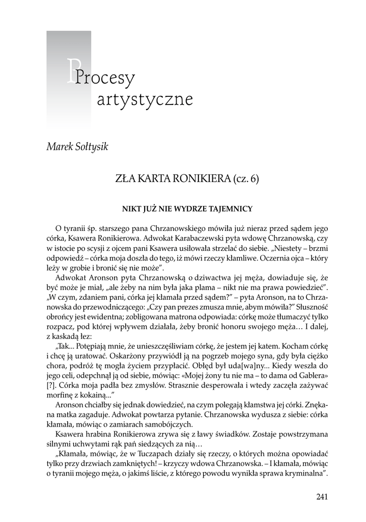 PProcesy artystyczne Marek Sołtysik ZŁA KARTA RONIKIERA (cz. 6) Nikt już nie wydrze tajemnicy O tyranii śp. starszego pana Chrzanowskiego mówiła już nieraz przed sądem jego córka, Ksawera Ronikierowa. Adwokat Karabaczewski pyta wdowę Chrzanowską, czy w istocie po scysji z ojcem pani Ksawera usiłowała strzelać do siebie. „Niestety – brzmi odpowiedź – córka moja doszła do tego, iż mówi rzeczy kłamliwe. Oczernia ojca – który leży w grobie i bronić się nie może”. Adwokat Aronson pyta Chrzanowską o dziwactwa jej męża, dowiaduje się, że być może je miał, „ale żeby na nim była jaka plama – nikt nie ma prawa powiedzieć”. „W czym, zdaniem pani, córka jej kłamała przed sądem?” – pyta Aronson, na to Chrzanowska do przewodniczącego: „Czy pan prezes zmusza mnie, abym mówiła?” Słuszność obrońcy jest ewidentna; zobligowana matrona odpowiada: córkę może tłumaczyć tylko rozpacz, pod której wpływem działała, żeby bronić honoru swojego męża… I dalej, z kaskadą łez: „Tak... Potępiają mnie, że unieszczęśliwiam córkę, że jestem jej katem. Kocham córkę i chcę ją uratować. Oskarżony przywiódł ją na pogrzeb mojego syna, gdy była ciężko chora, podróż tę mogła życiem przypłacić. Obłęd był uda[wa]ny... Kiedy weszła do jego celi, odepchnął ją od siebie, mówiąc: «Mojej żony tu nie ma – to dama od Gablera» [?]. Córka moja padła bez zmysłów. Strasznie desperowała i wtedy zaczęła zażywać morfinę z kokainą...” Aronson chciałby się jednak dowiedzieć, na czym polegają kłamstwa jej córki. Znękana matka zagaduje. Adwokat powtarza pytanie. Chrzanowska wydusza z siebie: córka kłamała, mówiąc o zamiarach samobójczych. Ksawera hrabina Ronikierowa zrywa się z ławy świadków. Zostaje powstrzymana silnymi uchwytami rąk pań siedzących za nią… „Kłamała, mówiąc, że w Tuczapach działy się rzeczy, o których można opowiadać tylko przy drzwiach zamkniętych! – krzyczy wdowa Chrzanowska. – I kłamała, mówiąc o tyranii mojego męża, o jakimś liście, z którego powodu wynikła sprawa kryminalna”. 241 Marek Sołtysik PALESTRA Aronson pyta o powody, które świadczą o nieprzyjaznym stosunku hrabiego Ronikiera do teściów. Chrzanowska: niepodpisywanie przezeń aktu ślubnego, wykreślenie notatki o intercyzie. „Ile kotów było w Tuczapach?” – pyta nagle adwokat Sterling. „Może dziesięć, może pięćdziesiąt, może sto. Jedni lubią koty, inni psy, inni konie”. Przewodniczący do obrońcy: „Co nam do tego, ile kotów było w Tuczapach?” Sterling jednak prosi o zapisanie do protokołu odpowiedzi Chrzanowskiej. Biegli daktyloskopi z Petersburga, z Warszawy są zgodni co do tego, że na szkle lampy w pokoju zbrodni są „zapieczone” odciski mokrych palców hrabiego Ronikiera. Z jednomyślnej ekspertyzy lekarskiej, za relacją profesorów Taranuchina i Przewóskiego: krwawe plamy na bieliźnie Stasia to krew i woda – plus bardzo wyraźne… plemniki. Na kurtce ślady sadzy. Włosy w okolicach kołnierza należą do jednego człowieka. Uszkodzenia na czapce i na pelerynie zostały wyjedzone przez mole. Ślady na zakrwawionym mankiecie odbijają deseń dywanu. Sadze padały na mankiet już po przyschnięciu krwi. Na prześcieradle wciśniętym w schowku także stwierdzono krwawe ślady. Ktoś – o, właśnie tak, jak sądowi demonstruje profesor Przewóski – wycierał rewolwer. Na płótnie pozostała odbitka monogramu W. K. z kolby. Jeszcze fotografie śladów na prześcieradle. Stanisław Chrzanowski padł zamordowany. Wszystkie rany zadane tępym narzędziem. Pierwszy cios w lewą skroń, drugi w prawą, w ciemię. Ostatni – za prawym uchem – był powodem śmierci. Nie ma ran, które by zadawano po śmierci ofiary. Gdy pierwsze dwa ciosy dosięgły napadniętego w korytarzyku lub w pokoju nr 2, uciekł on do pokoju nr 1 i znalazł się za dywanem pokrywającym drzwi na kuchenne schody. Tam, po szamotaninie, dopadł go ten cios… Krwawe ślady pozwalają odtworzyć przebieg zdarzeń. Chłopiec był ubrany. Zabójca posługiwał się początkowo rewolwerem, następnie – młotkiem tapicerskim. Możliwe, że było dwóch oprawców. Tego jednak nie uda się stwierdzić. Plemniki na bieliźnie to – wedle biegłych – najprawdopodobniej następstwo reakcji w chwili śmierci. Co znaczy najprawdopodobniej? – mogę sobie pytać po stu latach. Czy wtedy w sądzie to wystarczyło? I czy nikt nie domagał się bardziej szczegółowego wyjaśnienia tego fragmentu protokołu biegłych, w którym po dokonaniu sekcji zwłok stwierdzono brak podstaw do przypuszczeń, „aby Stanisław Chrzanowski ulegał jakimś zboczeniom”?! Eksperci: Chrzanowski nie krzyczał. Po uderzeniu w głowę był tak zaskoczony i przerażony, że dech zamarł mu w piersiach. A że agonia trwała co najmniej kwadrans, tego dowodzi obfity upływ krwi. Krew przestaje płynąć, kiedy serce przestaje bić. 1 stycznia 1914 – zamknięcie śledztwa sądowego. Zbliża się nowa epoka. Nieliczni przeczuwają, jak krwawo się ona rozpocznie. A kibice? Oni mają swe karty wstępu. Obok historii. Na razie. 2 stycznia 1914 są w tłoku sali sądowej. Kulminacja. Ze strony oskarżenia: prokurator, dwaj zastępcy powódki cywilnej pani Chrzanowskiej, adwokaci Nowodworski i Karabczewski. Adwokat Ettinger wciąż broni Zawadzkiego; nie ma czego zazdrościć. No i obrońcy Ronikiera: adwokaci Goldstein, Bobriszczew-Puszkin, Sterling i Aronson. Według oficjalnie obowiązującego kalendarza starego stylu jest to 19 grudnia 1913 r. 242 11–12/2011 Zła karta Ronikiera W sali sądowej każdy mały ruch może mieć wielkie znaczenie. Aronson domaga się wznowienia śledztwa i przesłuchania Thomasowej. Jest ważna okoliczność: 12 maja 1910 do „pokojów umeblowanych” Zawadzkiego wchodził ze Stasiem Chrzanowskim kandydat na jego korepetytora Borkowski. Sąd dopuszcza świa