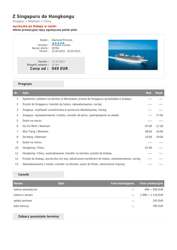 Z Singapuru do Hongkongu Singapur > Wietnam > Chiny wycieczka po Dubaju w cenie! oferta promocyjna rejsy egzotyczne polski pilot Statek : Armator : Numer oferty : Termin : Termin : Długość pobytu : Diamond Princess Princess Cruises 30794 12.04.2015 - 23.04.2015 12.04.2015 12 dni Cena od : 949 EUR Program Nr. Opis Wpł. Wypł. 1 Spotkanie z pilotem na lotnisku w Warszawie, przelot do Singapuru (przesiadka w Dubaju) --:-- --:-- 2 Przylot do Singapuru, transfer do hotelu, zakwaterowanie, nocleg --:-- --:-- 3 Singapur, możliwość uczestnictwa w wycieczce fakultatywnej, nocleg --:-- --:-- 4 Singapur, wykwaterowanie z hotelu, transfer do portu, zaokrętowanie na statek --:-- 17:00 5 Dzień na morzu --:-- --:-- 6 Ho Chi Minh / Wietnam 07:00 17:30 7 Nha Trang / Wietnam 08:00 16:00 8 Da Nang / Wietnam 10:00 19:00 9 Dzień na morzu --:-- --:-- 07:00 --:-- 10 Hongkong / Chiny 11 Hongkong / Chiny, wyokrętowanie, transfer na lotnisko, przelot do Dubaju --:-- --:-- 12 Przylot do Dubaju, wycieczka city tour zakończona transferem do hotelu, zakwaterowanie, nocleg --:-- --:-- 13 Wykwaterowanie z hotelu, transfer na lotnisko, wylot do Polski, zakończenie imprezy --:-- --:-- Cennik Nazwa Opis Cena katalogowa Cena promocyjna kabina wewnętrzna --; 949 ÷ 959 EUR kabina z oknem --; 1.099 ÷ 1.119 EUR opłaty portowe --; 245 EUR bilet lotniczy --; 785 EUR Zobacz pozostałe terminy Nie ma innych terminów. Informacje dodatkowe cena obejmuje: rejs statkiem Diamond Princess *****; zakwaterowanie w kabinie wybranej kategorii (7 noclegów); ubezpieczenie: KL 30 000 €, KR 6 000 €, NWI 16 000 €, BP 1800 pln + choroby przewlekłe, serwis bagażowy i kabinowy; wyżywienie – 3 główne posiłki, przekąski między posiłkami, bufet lub przekąski o północy; korzystanie z basenu i innych urządzeń sportowo-rekreacyjnych; udział we wszystkich imprezach organizowanych na statku, 2 noclegi przed rejsem w Singapurze (hotel 3*, śniadanie w cenie), wycieczka city tour po Dubaju, nocleg po rejsie w Dubaju (hotel 3*, śniadanie w cenie), transfery, opiekę polskiego pilota. cena nie obejmuje: opłat portowych i podatków (245€/os.); kosztów przelotu na trasie Warszawa – Singapur, Hongkong – Dubaj, Dubaj Warszawa (ok. 785€/os.); wycieczek fakultatywnych; korzystania z punktów usługowych (pralnia, fotograf, salon piękności i odnowy biologicznej, Internet, napiwków obowiązkowych dla obsługi statku (ok. 12 $/dzień/osobę dorosłą), transferu na lotnisko w Warszawie. uwagi: kabiny 3/4 osobowe nie są dostępne we wszystkich kategoriach, a ich liczba jest ograniczona – sprzedaż tylko po potwierdzeniu. Grupa realizowana przy min. 12 osobach. Linia Princess Cruises zastrzega prawo do wprowadzenia opłaty paliwowej w wysokości 9$/dzień/osobę w momencie wzrostu ropy NYMEX powyżej 70$ za baryłkę ropy. Na pokładzie statku obowiązuje bezgotówkowy system opłat. Należność reguluje się ostatniego dnia rejsu gotówką (wpłata depozytu ok. 250€/kabina pierwszego dnia rejsu) lub kartą kredytową (VISA, Mastercard, American Express) na podstawie zbiorczego rachunku. Karty kredytowe należy zarejestrować zaraz po zaokrętowaniu. all inclusive (opcja): istnieje możliwość wykupienia pakietu ALL INCLUSIVE obejmującego wybrane napoje alkoholowe i bezalkoholowe dostępne bez ograniczeń we wszystkich barach. Cena pakietu 56,35 $/dzień/osoba dorosła. Warunkiem skorzystania z pakietu all inclusive jest wykupienie pakietu przez wszystkich pasażerów podróżujących w jednej kabinie na czas całego rejsu.