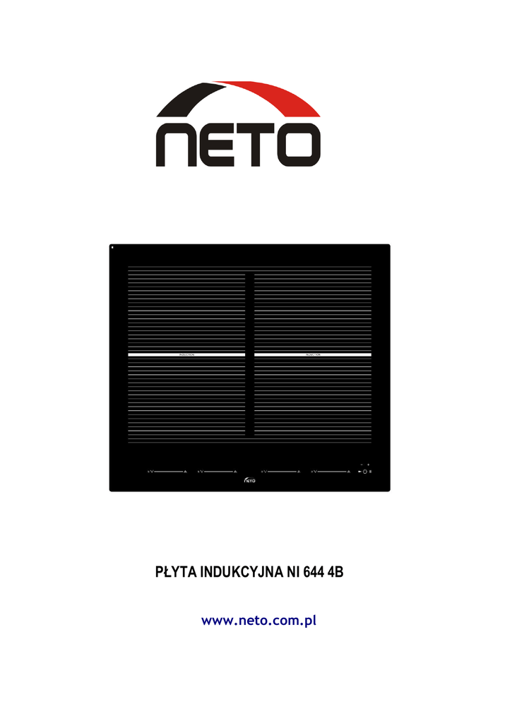 PŁYTA INDUKCYJNA NI 644 4B www.neto.com.pl 2 Szanowni Klienci, Dziękujemy za wybranie przez Was naszej płyty indukcyjnej. W celu jak najlepszego wykorzystania swojego urządzenia, radzimy uważnie przeczytać poniższe informacje i zachować je na później do wglądu. SPIS TREŚCI BEZPIECZEOSTWO .............................................................................................................................................................. 4 Środki ostrożności przed użyciem ................................................................................................................................ 4 Obsługa urządzenia...................................................................................................................................................... 4 Środki ostrożności, aby nie uszkodzid urządzenia ........................................................................................................ 5 Środki ostrożności w przypadku awarii urządzenia ..................................................................................................... 5 Inne środki ostrożności ................................................................................................................................................ 5 OPIS URZĄDZENIA .............................................................................................................................................................. 6 Dane techniczne .......................................................................................................................................................... 6 Panel kontrolny ............................................................................................................................................................ 6 OBSŁUGA URZĄDZENIA ...................................................................................................................................................... 7 Wyświetlacz ................................................................................................................................................................. 7 Wentylacja ................................................................................................................................................................... 7 URUCHOMIENIE I UŻYTKOWANIE URZĄDZENIA ................................................................................................................ 7 Przed pierwszym użyciem ............................................................................................................................................ 7 Zasada indukcji ............................................................................................................................................................ 7 Przyciski dotykowe ...................................................................................................................................................... 8 Strefa wyboru mocy "SLIDER" oraz strefa ustawiania minutnika ................................................................................ 8 Pierwsze włączenie ...................................................................................................................................................... 8 Wykrywanie naczynia kuchennego .............................................................................................................................. 9 Wskaźnik ciepła resztkowego ...................................................................................................................................... 9 Funkcja Booster i Double Booster................................................................................................................................ 9 Minutnik .................................................................................................................................................................... 10 Gotowanie automatyczne.......................................................................................................................................... 11 Funkcja Stop&Go ....................................................................................................................................................... 11 Funkcja Recall ............................................................................................................................................................ 11 Funkcja “Keep warm” ................................................................................................................................................ 12 Funkcja Bridge ........................................................................................................................................................... 12 Blokada panelu kontrolnego ...................................................................................................................................... 12 PORADY DOTYCZĄCE GOTOWANIA ................................................................................................................................. 13 Jakośd naczyo............................................................................................................................................................. 13 Wymiary naczynia ...................................................................................................................................................... 13 Przykłady ustawieo mocy gotowania ......................................................................................................................... 14 KONSERWACJA I CZYSZCZENIE ......................................................................................................................................... 14 CO ROBID W PRZYPADKU PROBLEMÓW? .............................................................................................................