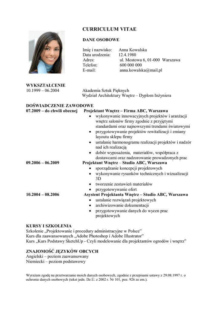 CURRICULUM VITAE DANE OSOBOWE Imię i nazwisko: Data urodzenia: Adres: Telefon: E-mail: WYKSZTAŁCENIE 10.1999 – 06.2004 Anna Kowalska 12.4.1980 ul. Mostowa 6, 01-000 Warszawa 600 000 000 [email protected] Akademia Sztuk Pięknych Wydział Architektury Wnętrz – Dyplom Inżyniera DOŚWIADCZENIE ZAWODOWE 07.2009 – do chwili obecnej Projektant Wnętrz – Firma ABC, Warszawa  wykonywanie innowacyjnych projektów i aranżacji wnętrz salonów firmy zgodnie z przyjętymi standardami oraz najnowszymi trendami światowymi  przygotowywanie projektów rewitalizacji i zmiany layoutu sklepu firmy  ustalanie harmonogramu realizacji projektów i nadzór nad ich realizacją  dobór wyposażenia, materiałów, współpraca z dostawcami oraz nadzorowanie prowadzonych prac 09.2006 – 06.2009 Projektant Wnętrz – Studio ABC, Warszawa  sporządzanie koncepcji projektowych  wykonywanie rysunków technicznych i wizualizacji 3D  tworzenie zestawień materiałów  przygotowywanie ofert 10.2004 – 08.2006 Asystent Projektanta Wnętrz – Studio ABC, Warszawa  ustalanie rozwiązań projektowych  archiwizowanie dokumentacji  przygotowywanie danych do wycen prac projektowych KURSY I SZKOLENIA Szkolenie „Projektowanie i procedury administracyjne w Polsce” Kurs dla zaawansowanych „Adobe Photoshop i Adobe Illustrator” Kurs „Kurs Podstawy SketchUp - Czyli modelowanie dla projektantów ogrodów i wnętrz” ZNAJOMOŚĆ JĘZYKÓW OBCYCH Angielski – poziom zaawansowany Niemiecki – poziom podstawowy Wyrażam zgodę na przetwarzanie moich danych osobowych, zgodnie z przepisami ustawy z 29.08.1997 r. o ochronie danych osobowych (tekst jedn. Dz.U. z 2002 r. Nr 101, poz. 926 ze zm.). UMIEJĘTNOŚCI Obsługa komputera: MS Office (Word, Exel, Power Point) Obsługa programów: Adobe Photoshop, Adobe Ilustrator, Graphisoft ArchiCAD, 3D Studio Max, V-Ray Prawo jazdy kat. B. DODATKOWE INFORMACJE Nagroda: Wyróżnienie w Konkursie „Czas na wnętrze” (2009 r.) Cechy osobowościowe: samodzielność, otwartość, dynamizm, terminowość i dobra organizacja pracy, kreatywność Zainteresowania: moda, fitness, historia architektury Wyrażam zgodę na przetwarzanie moich danych osobowych, zgodnie z przepisami ustawy z 29.08.1997 r. o ochronie danych osobowych (tekst jedn. Dz.U. z 2002 r. Nr 101, poz. 926 ze zm.).