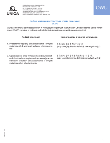 UNIQA Towarzystwo Ubezpieczeń S.A. 90-520 Łódź, ul. Gdańska 132 tel. 42 66 66 500 lub 801 597 597 [email protected], www.uniqa.pl Sąd Rejonowy dla Łodzi - Śródmieścia w Łodzi KRS 0000001201, NIP 727-012-63-58 Kapitał zakładowy i wpłacony: 220 308 282 PLN OWU OGÓLNE WARUNKI UBEZPIECZENIA STRATY FINANSOWEJ (GAP) Wykaz informacji zamieszczonych w niniejszych Ogólnych Warunkach Ubezpieczenia Straty Finansowej (GAP) zgodnie z Ustawą o działalności ubezpieczeniowej i reasekuracyjnej Rodzaj informacji Numer zapisu z wzorca umownego § 3; § 5; § 6; § 7,§ 11; § 12 przy uwzględnieniu definicji zawartych w § 2 2. Ograniczenia oraz wyłączenia odpowiedzialności zakładu ubezpieczeń uprawniające do odmowy wypłaty odszkodowania i innych świadczeń lub ich obniżenia § 3; § 4; § 5; § 6; § 7; § 8; § 11; § 12, przy uwzględnieniu definicji zawartych w § 2 UNIQA wz. 9370 1. Przesłanki wypłaty odszkodowania i innych świadczeń lub wartość wykupu ubezpieczenia 1 POSTANOWIENIA OGÓLNE §1 1. Niniejsze Ogólne Warunki Ubezpieczenia, zwane dalej „OWU”, określają zasady i warunki udzielania ochrony ubezpieczeniowej w zakresie ryzyka Straty Finansowej (GAP) dla Korzystających zawierających Umowę Leasingu (regulowana w Kodeksie cywilnym w art. 709 1 i nast. Kodeksu cywilnego) lub umowę o podobnym charakterze, w tym umowę najmu (regulowana w Kodeksie cywilnym w art. 659 i nast. Kodeksu cywilnego) lub umowę dzierżawy (regulowana w Kodeksie cywilnym w art. 693 i nast. Kodeksu cywilnego) z Millennium Leasing sp. z o.o. 2. Ubezpieczający zawiera umowę ubezpieczenia na rachunek Korzystających. 3. Osoba, na rachunek której zawarto Umowę ubezpieczenia, zwana jest dalej Ubezpieczonym. 4. W sprawach nieuregulowanych niniejszymi OWU zastosowanie mają przepisy powszechnie obowiązującego prawa, w tym kodeksu cywilnego i ustawy o działalności ubezpieczeniowej i reasekuracyjnej. 5. UNIQA Towarzystwo Ubezpieczeń S.A. z siedzibą w Łodzi (90-520) przy ul. Gdańskiej 132 w związku z zawartą Umową ubezpieczenia Straty Finansowej (GAP) informuje, że: 1) jest Administratorem powierzonych mu danych osobowych; 2) powierzone dane osobowe będą wykorzystywane oraz przetwarzane wyłącznie w prawnie uzasadnionym celu, przez który rozumie się: a) obsługę i wykonywanie Umowy ubezpieczenia, b) rozliczenia z pośrednikami ubezpieczeniowymi, c) cele analityczne i archiwalne, 3) Ubezpieczający/Ubezpieczony zachowuje prawo dostępu do danych osobowych oraz ich poprawiania. DEFINICJE §2 Poniższe określenia mają następujące znaczenie: 1) Finansujący (Leasingodawca) - w ramach leasingu jedna ze stron Umowy Leasingu (finansujący, Leasingodawca) przekazująca drugiej stronie (Korzystającemu, Leasingobiorcy) prawo do używania określonego Pojazdu i pobierania pożytków z tego tytułu w uzgodnionym w Umowie Leasingu okresie, w zamian za ustalone ratalne opłaty (raty leasingowe); 2) Harmonogram - harmonogram spłaty rat wynagrodzenia z Umowy Leasingu, ustalony w dniu zawarcia Umowy Leasingu wraz z jego zmianami, o ile takie miały miejsce; 3) Korzystający (Leasingobiorca) - osoba fizyczna, osoba fizyczna prowadząca działalność gospodarczą, osoba prawna, jednostka organizacyjna nie posiadająca osobowości prawnej, która posiada zdolność prawną, w tym osobowe spółki handlowe, które są stroną Umowy Leasingu, której przysługuje prawo do używania określonego Pojazdu i pobierania pożytków z tego tytułu w uzgodnionym w Umowie Leasingu okresie, i których odpowiednio miejsce zamieszkania lub prowadzenia działalności gospodarczej lub siedziba znajduje się na terytorium Rzeczypospolitej Polskiej; 4) Odszkodowanie z Podstawowego ubezpieczenia Pojazdu kwota wypłacona przez Ubezpieczyciela podstawowego na podstawie Umowy ubezpieczenia AC lub Umowy ubezpieczenia OC z tytułu Szkody Całkowitej, powiększona o Wartość Pozostałości; przy czym w przypadku opcji GAP Finansowy i GAP Fakturowy do tej kwoty dolicza się również kwoty udziału własnego, franszyzy redukcyjnej, potrąceń i innych odliczeń, jakich dokonał Ubezpieczyciel podstawowy; 5) Osoby trzecie - osoby pozostające poza stosunkiem ubezpieczeniowym; 6) Podstawowe ubezpieczenie Pojazdu - oznacza: a) Umowę ubezpieczenia AC z pełną ochroną ubezpieczeniową, w rozumieniu nadanym przez Ubezpieczyciela podstawowego Pojazdu, z wyszczególnioną sumą ubezpieczenia odpowiadającą Wartości Pojazdu w dniu zawarcia ubezpieczenia, zawartą przez Ubezpieczającego lub Ubezpieczonego z Ubezpieczycielem podstawowym Pojazdu i 2 b) Umowę ubezpieczenia OC, na podstawie której Ubezpieczyciel podstawowy Pojazdu udziela ochrony ubezpieczeniowej z tytułu Szkody Całkowitej wyrządzonej w ubezpieczonym Pojeździe przez Osobę trzecią; 7) Pojazd - pojazd silnikowy w rozumieniu przepisów prawa o ruchu drogowym, zarejestrowany w Rzeczypospolitej Polskiej, będący przedmiotem Umowy Leasingu; na potrzeby niniejszych OWU za Pojazd uważa się Pojazdy: osobowe, ciężarowe o ładowności do 2 ton, ciężarowe o ładowności powyżej 2 ton, naczepy ciężarowe, przyczepy ciężarowe, autobusy, ciągniki siodłowe, ciągniki balastowe; 8) Strata Finansowa - w zależności od wybranej opcji ubezpieczenia: a) GAP Finansowy - kwota odpowiadająca różnicy pomiędzy pozostającą do spłaty kwotą zobowiązania wynikającego z treści postanowień Umowy Leasingu, powstałego na skutek wygaśnięcia Umowy Leasingu na skutek utraty Pojazdu i uznania przez Ubezpieczyciela podstawowego odpowiedzialności z tytułu Szkody Całkowitej zgodnie z Harmonogramem na dzień wypłaty Odszkodowania z Podstawowego ubezpieczenia Pojazdu, a wyższą z dwóch kwot: kwotą wypłaconego Odszkodowania z Podstawowego ubezpieczenia Pojazdu lub Wartością Pojazdu w dniu Szkody Całkowitej, b) GAP Fakturowy - kwota odpowiadająca różnicy pomiędzy niższą z dwóch wartości: Wartością Fakturową Pojazdu lub sumą ubezpiec