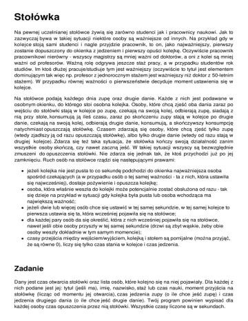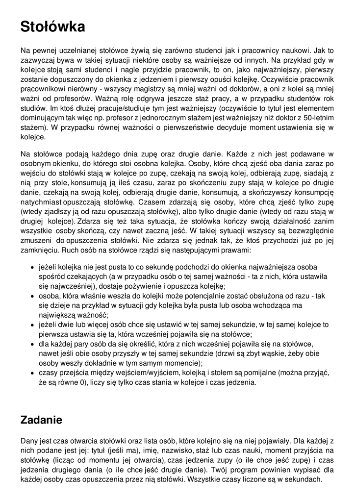Stołówka Na pewnej uczelnianej stołówce żywią się zarówno studenci jak i pracownicy naukowi. Jak to zazwyczaj bywa w takiej sytuacji niektóre osoby są ważniejsze od innych. Na przykład gdy w kolejce stoją sami studenci i nagle przyjdzie pracownik, to on, jako najważniejszy, pierwszy zostanie dopuszczony do okienka z jedzeniem i pierwszy opuści kolejkę. Oczywiście pracownik pracownikowi nierówny - wszyscy magistrzy są mniej ważni od doktorów, a oni z kolei są mniej ważni od profesorów. Ważną rolę odgrywa jeszcze staż pracy, a w przypadku studentów rok studiów. Im ktoś dłużej pracuje/studiuje tym jest ważniejszy (oczywiście to tytuł jest elementem dominującym tak więc np. profesor z jednorocznym stażem jest ważniejszy niż doktor z 50-letnim stażem). W przypadku równej ważności o pierwszeństwie decyduje moment ustawienia się w kolejce. Na stołówce podają każdego dnia zupę oraz drugie danie. Każde z nich jest podawane w osobnym okienku, do którego stoi osobna kolejka. Osoby, które chcą zjeść oba dania zaraz po wejściu do stołówki stają w kolejce po zupę, czekają na swoją kolej, odbierają zupę, siadają z nią przy stole, konsumują ją ileś czasu, zaraz po skończeniu zupy stają w kolejce po drugie danie, czekają na swoją kolej, odbierają drugie danie, konsumują, a skończywszy konsumpcję natychmiast opuszczają stołówkę. Czasem zdarzają się osoby, które chcą zjeść tylko zupę (wtedy zjadłszy ją od razu opuszczają stołówkę), albo tylko drugie danie (wtedy od razu stają w drugiej kolejce). Zdarza się też taka sytuacja, że stołówka kończy swoją działalność zanim wszystkie osoby skończą, czy nawet zaczną jeść. W takiej sytuacji wszyscy są bezwzględnie zmuszeni do opuszczenia stołówki. Nie zdarza się jednak tak, że ktoś przychodzi już po jej zamknięciu. Ruch osób na stołówce rządzi się następującymi prawami: jeżeli kolejka nie jest pusta to co sekundę podchodzi do okienka najważniejsza osoba spośród czekających (a w przypadku osób o tej samej ważności - ta z nich, która ustawiła się najwcześniej), dostaje pożywienie i opuszcza kolejkę; osoba, która właśnie weszła do kolejki może potencjalnie zostać obsłużona od razu - tak się dzieje na przykład w sytuacji gdy kolejka była pusta lub osoba wchodząca ma największą ważność; jeżeli dwie lub więcej osób chce się ustawić w tej samej sekundzie, w tej samej kolejce to pierwsza ustawia się ta, która wcześniej pojawiła się na stołówce; dla każdej pary osób da się określić, która z nich wcześniej pojawiła się na stołówce, nawet jeśli obie osoby przyszły w tej samej sekundzie (drzwi są zbyt wąskie, żeby obie osoby weszły dokładnie w tym samym momencie); czasy przejścia między wejściem/wyjściem, kolejką i stołem są pomijalne (można przyjąć, że są równe 0), liczy się tylko czas stania w kolejce i czas jedzenia. Zadanie Dany jest czas otwarcia stołówki oraz lista osób, które kolejno się na niej pojawiały. Dla każdej z nich podane jest jej: tytuł (jeśli ma), imię, nazwisko, staż lub czas nauki, moment przyjścia na stołówkę (licząc od momentu jej otwarcia), czas jedzenia zupy (o ile chce jeść zupę) i czas jedzenia drugiego dania (o ile chce jeść drugie danie). Twój program powinien wypisać dla każdej osoby czas opuszczenia przez nią stołówki. Wszystkie czasy liczone są w sekundach. Specyfikacja wejścia W pierwszym wierszu wejścia znajduje się jedna dodatnia liczba całkowita, oznaczająca liczbę dni, przez którą obserwujemy ruch na stołówce. Każdy z dni opisany jest następująco. W pierwszym wierszu znajdują się dwie liczby całkowite N i M oznaczające odpowiednio liczbę osób, które pojawią się na stołówce oraz czas przez jaki jest ona otwarta tego dnia (1 ≤ N ≤ 50.000, 1 ≤ M ≤ 1.000.000.000). W kolejnych N wierszach znajdują się osoby, które pojawiają się na stołówce (osoby są wymienione w kolejności przechodzenia przez drzwi), a każda z nich jest o p i s a n a przez następujące wartości (oddzielone od siebie pojedynczą spacją): Tytuł (opcjonalny), Imię, Nazwisko, R, Tw, Tz , Td. Tytuł może przyjmować jedną z trzech wartości: “mgr”, “dr” lub “prof.” (oznaczają one odpowiednio magistra, doktora i profesora). Brak tytułu oznacza, że osoba jest studentem. Imię i Nazwisko są ciągami liter alfabetu angielskiego o długości od 2 do 100. Pierwsza litera imienia i nazwiska jest zawsze duża, a pozostałe są małe. Jak to zazwyczaj w życiu bywa, mogą istnieć osoby o tych samych imionach i nazwiskach (czy nawet tytułach). Kolejne wartości w wierszu oznaczają odpowiednio: staż lub czas nauki (w pełnych latach), moment pojawienia się na stołówce, czas jedzenia zupy oraz czas jedzenia drugiego dania (czasy podane są w sekundach). Podlegają one następującym ograniczeniom: 0 ≤ R ≤ 50, 0 ≤ Tw ≤ M, 0 ≤ Tz ≤ 1.000.000.000, 0 ≤ Td ≤ 1.000.000.000. Uwaga, Tz =0 oznacza, że osoba nie chce jeść zupy, a Td=0, że drugiego dania (obie te wartości nie mogą być jednocześnie zerami). Specyfikacja wyjścia Dla każdego dnia opisanego na wejściu, należy wypisać N wierszy, w których mają się znaleźć kolejne osoby (tj. ich ewentualny tytuł oraz imię i nazwisko) z czasami ich wyjścia ze stołówki (podanymi w sekundach, licząc od momentu otwarcia). Osoby powinny pojawić się na wyjściu w takiej samej kolejności jak na wejściu. Przykład Wejście 2 3 100 dr Ccc Ddd 0 0 0 111 mgr Aa Bb 11 22 33 44 prof. Prof Prof 30 30 30 30 3 1000 Michal Kichal 1 10 15 20 prof. Huhu Ha 50 11 15 25 John Ixinski 1 25 0 22 Wyjście dr Ccc Ddd 100 mgr Aa Bb 99 prof. Prof Prof 90 Michal Kichal 45 prof. Huhu Ha 51 John Ixinski 49 Wyjaśnienie Pierwszy przykład jest trywialny. W drugim przykładzie Michal pojawia się w 10-tej sekundzie i od razu dostaje zupę, je ją przez 