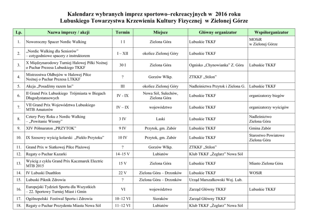 Kalendarz wybranych imprez sportowo–rekreacyjnych w 2016 roku Lubuskiego Towarzystwa Krzewienia Kultury Fizycznej w Zielonej Górze Lp. Nazwa imprezy / akcji Główny organizator Termin Miejsce 1I Zielona Góra Lubuskie TKKF I – XII okolice Zielonej Góry Lubuskie TKKF 30 I Zielona Góra Współorganizator MOSiR w Zielonej Górze 1. Noworoczny Spacer Nordic Walking 2. „Nordic Walking dla Seniorów” – cotygodniowe spacery z instruktorem 3. X Międzynarodowy Turniej Halowej Piłki Nożnej o Puchar Prezesa Lubuskiego TKKF 4. Mistrzostwa Oldbojów w Halowej Piłce Nożnej o Puchar Prezesa LTKKF ? Gorzów Wlkp. 5. Akcja „Posadźmy razem las” III okolice Zielonej Góry Nadleśnictwa Przytok i Zielona G. Lubuskie TKKF 6. II Grand Prix Lubuskiego Trójmiasta w Biegach Długodystansowych IV - IX Nowa Sól, Sulechów, Zielona Góra Lubuskie TKKF organizatorzy biegów 7. VII Grand Prix Województwa Lubuskiego MTB Amatorów IV – IX województwo Lubuskie TKKF organizatorzy wyścigów 8. Cztery Pory Roku z Nordic Walking – „Powitanie Wiosny” 3 IV Laski Lubuskie TKKF Nadleśnictwo Zielona Góra 9. XIV Półmaraton „PRZYTOK” 9 IV Przytok, gm. Zabór Lubuskie TKKF Gmina Zabór 10. IX Szosowy wyścig kolarski „Piekło Przytoku” 10 IV Przytok, gm. Zabór Lubuskie TKKF Starostwo Powiatowe Zielona Góra 11. Grand Prix w Siatkowej Piłce Plażowej ? Gorzów Wlkp. ZTKKF „Stilon” 12. Regaty o Puchar Kazarki 14–15 V Lubiatów 13. Wyścig z cyklu Grand Prix Kaczmarek Electric MTB 2015 15 V Zielona Góra Lubuskie TKKF Miasto Zielona Góra 14. IV Lubuski Duathlon 22 V Zielona Góra – Drzonków Lubuskie TKKF WOSiR 15. Lubuski Piknik Zdrowia ? Zielona Góra – Drzonków Urząd Marszałkowski Woj. Lub. 16. Europejski Tydzień Sportu dla Wszystkich – 22. Sportowy Turniej Miast i Gmin VI województwo Zarząd Główny TKKF 17. Ogólnopolski Festiwal Sportu i Zdrowia 10–12 VI Sieraków Zarząd Główny TKKF 18. Regaty o Puchar Prezydenta Miasta Nowa Sól 11–12 VI Lubiatów Klub TKKF „Żeglarz” Nowa Sól Ognisko „Chynowianka” Z. Góra Lubuskie TKKF ZTKKF „Stilon” Klub TKKF „Żeglarz” Nowa Sól Lubuskie TKKF 19. Cztery Pory Roku z Nordic Walking – „Powitanie Lata” 26 VI do ustalenia 20. Regaty Samotników im. kpt. J. Gniłki 17 VII Lubiatów Klub TKKF „Żeglarz” Nowa Sól 21. Regaty pod patronatem Spółdzielni Mleczarskiej „Gostyń” 20-21 VIII Lubiatów Klub TKKF „Żeglarz” Nowa Sól 22. XI Dziesiątka Lasów Bogdanieckich 27 VIII Bogdaniec Ognisko „Zbyszko” Nadleśnictwo Bogdaniec 23. XXXI Ogólnopolski Nocny Bieg Bachusa 3 IX Zielona Góra Lubuskie TKKF Miasto Zielona Góra 23. II Winobraniowy Marsz Nordic Walking 3 IX Zielona Góra Lubuskie TKKF Miasto Zielona Góra 24. VII Drużynowy Bieg Winobraniowy o Puchar LOTTO 3 IX Zielona Góra Totalizator Sportowy Oddział Zielona Góra Lubuskie TKKF 25. Regaty o Puchar Prezesa Klubu TKKF „Żeglarz” 10–11 IX Lubiatów 26. II Otwarte Mistrzostwa Zielonej Góry MTB Amatorów 25 IX Przytok Lubuskie TKKF Miasto Zielona Góra 27. Cztery Pory Roku z Nordic Walking – „Powitanie Jesieni” 25 IX do ustalenia Lubuskie TKKF Nadleśnictwo Przytok 28. Mistrzostwa Gorzowa Wlkp. Amatorów w Halowej Piłce Nożnej ? Gorzów Wlkp. ZTKKF „Stilon” 29. II Lubuski Rajd Nordic Walking z okazji Światowego Dnia Marszu TAFISA 2016 1X Sulęcin 30. Cztery Pory Roku z Nordic Walking – „Powitanie Zimy” 18 XII 31. Bieg Chemików ? Lubuskie TKKF Nadleśnictwo Przytok Klub TKKF „Żeglarz” Nowa Sól Urząd Miasta i Gminy Sulęcin Lubuskie TKKF do ustalenia Lubuskie TKKF Nadleśnictwo Zielona Góra Gorzów Wlkp. ZTKKF „Stilon”